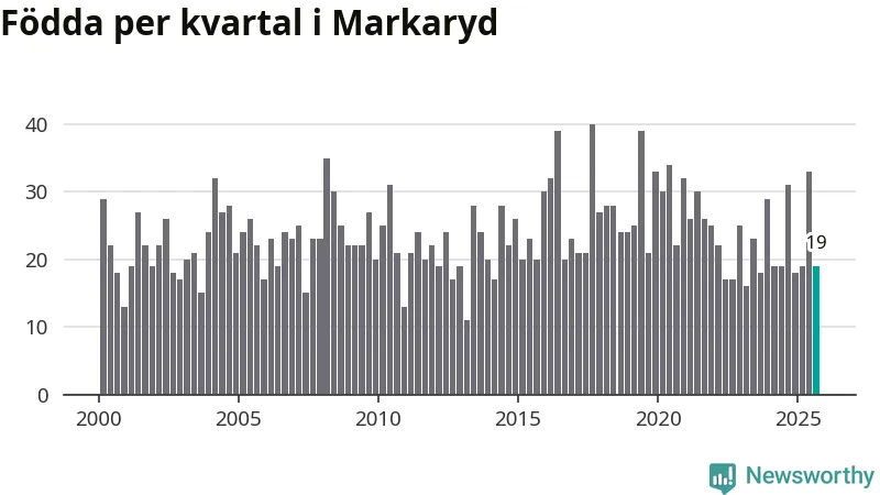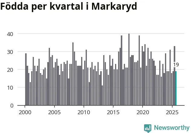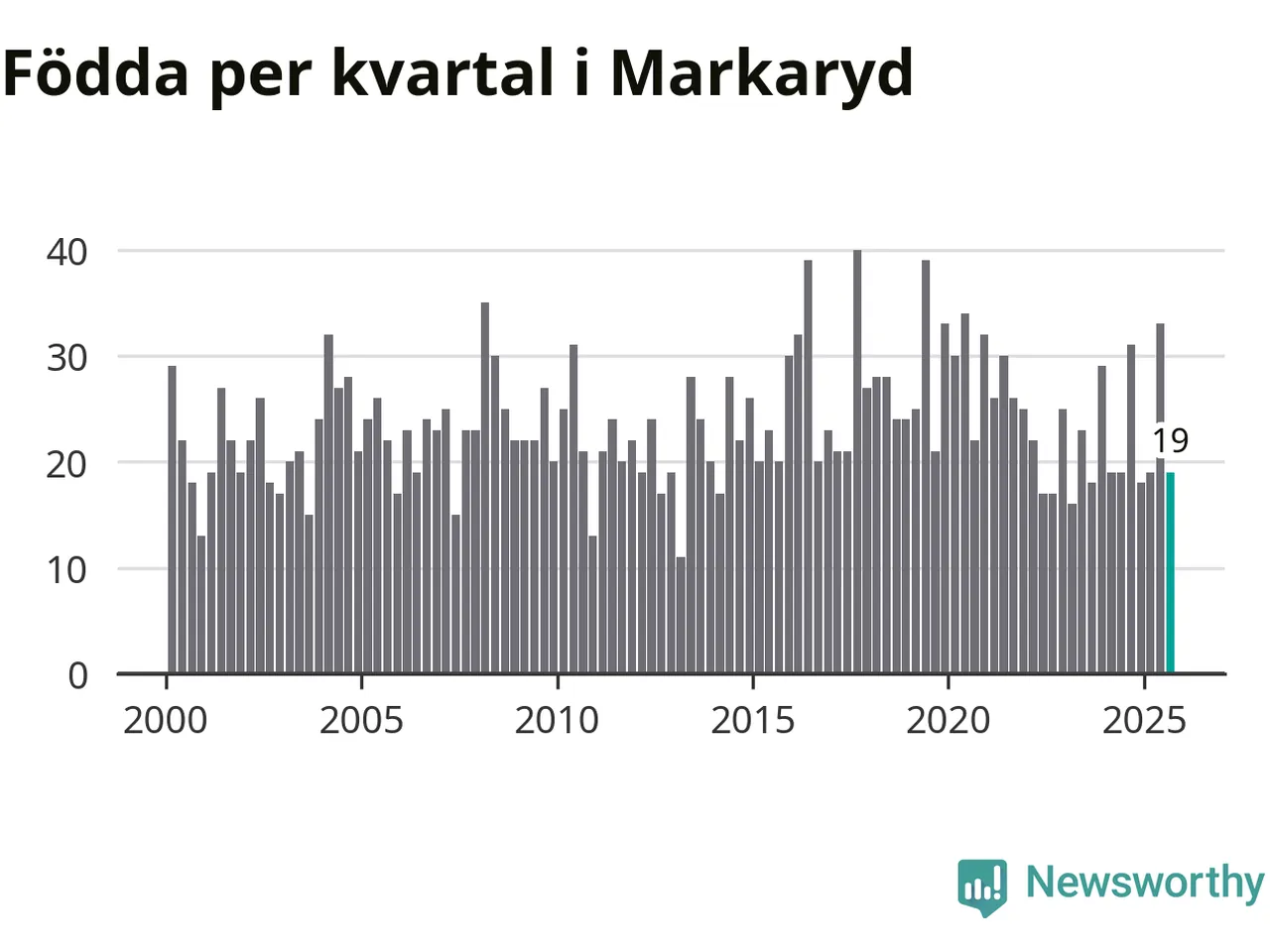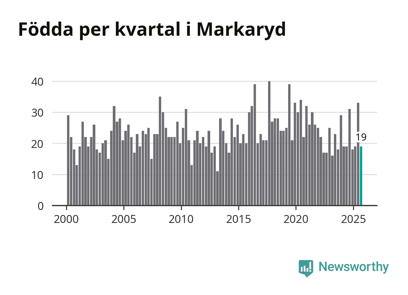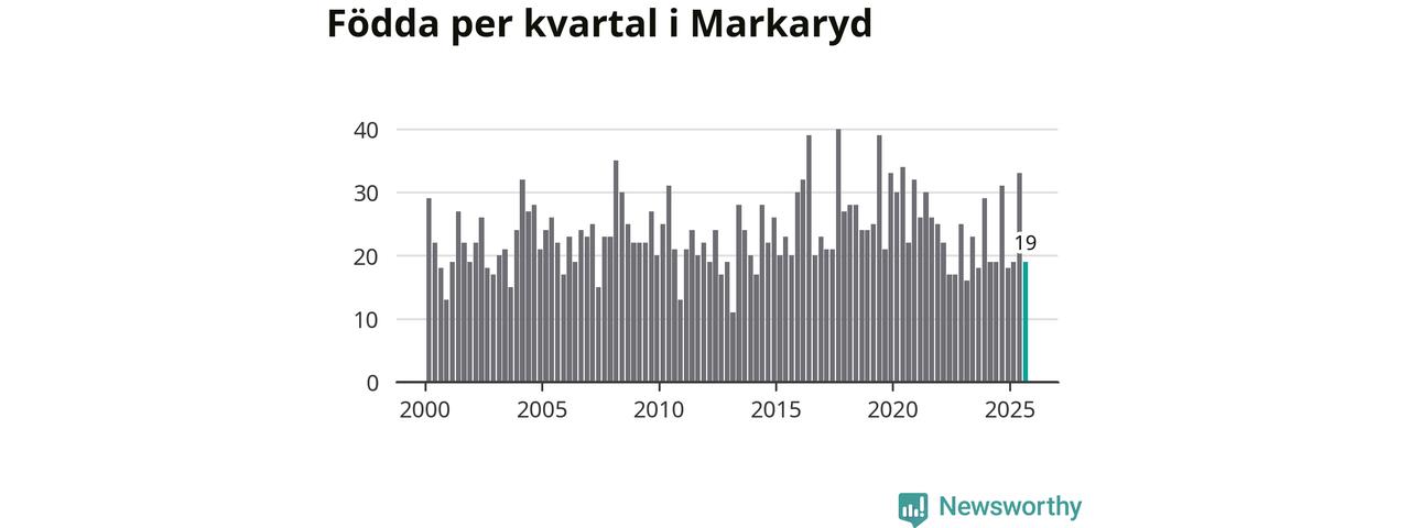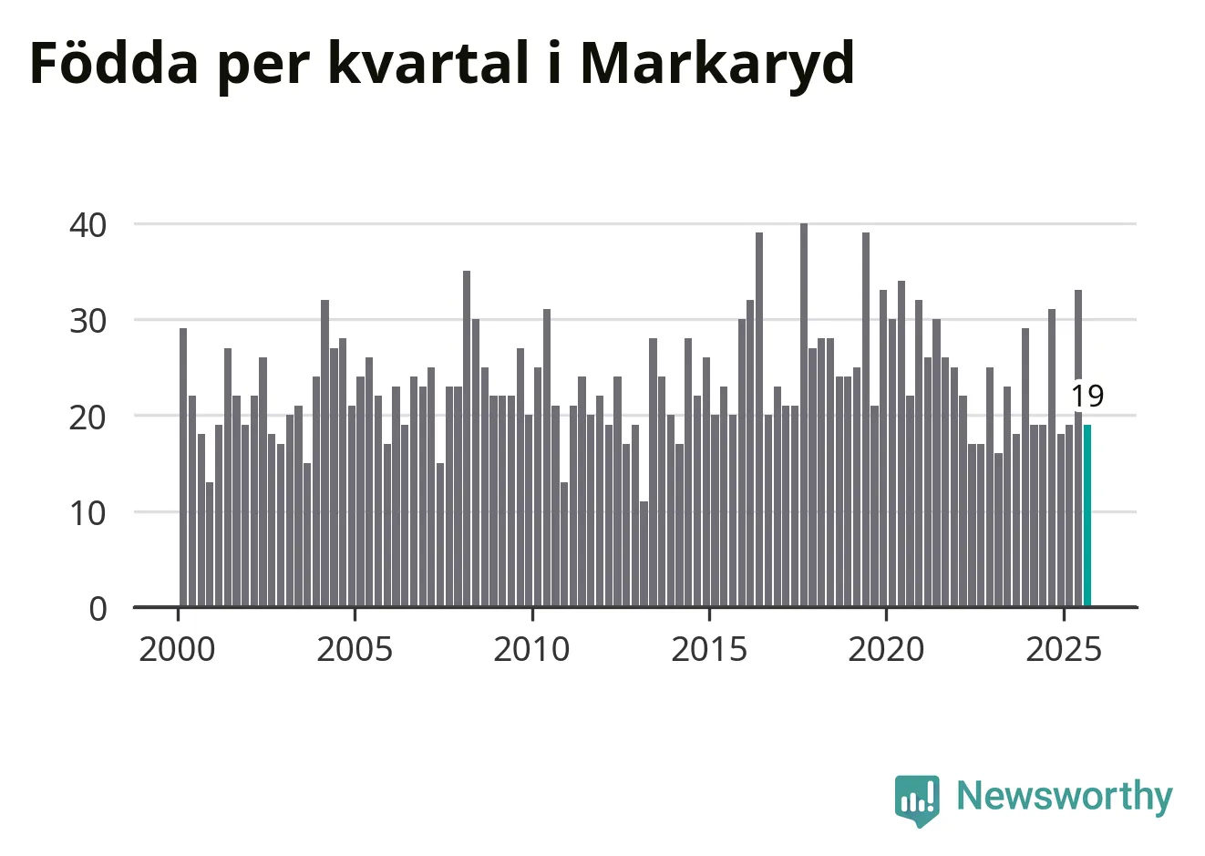 Enligt SCB:s siffror föddes 19 barn i Markaryd under det senaste kvartalet. Samtidigt avled 38 personer. Markaryd hade alltså ett negativt födelsenetto, vilket kommunen historiskt sett oftast har haft.