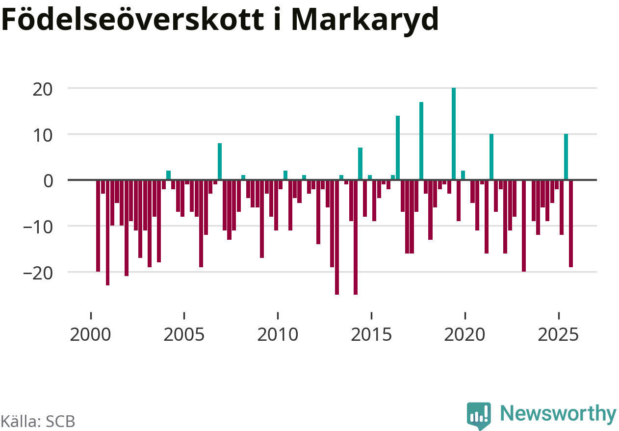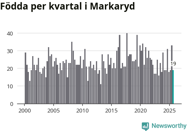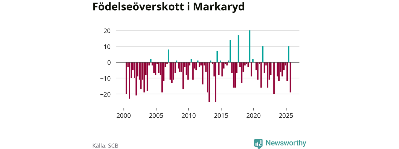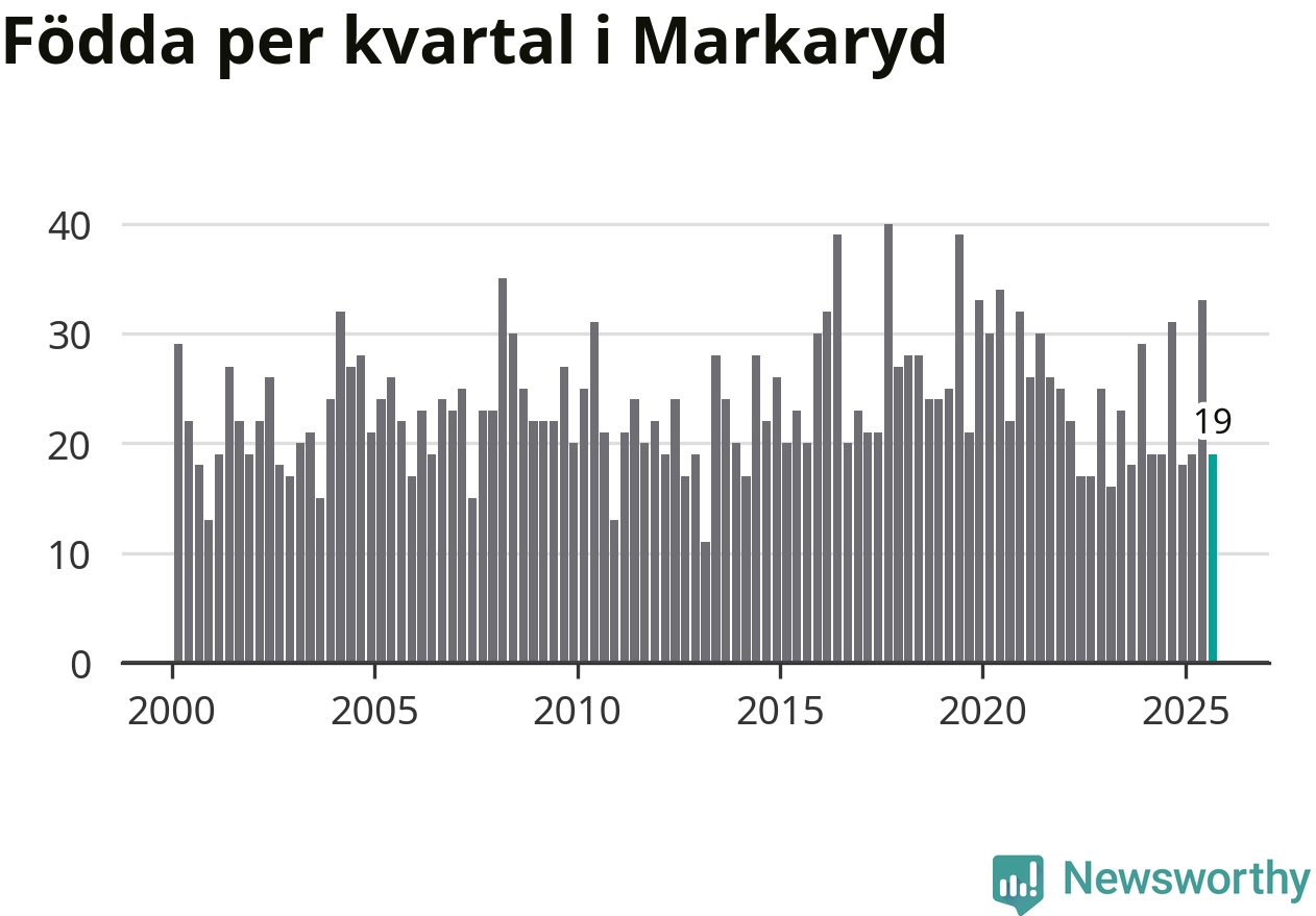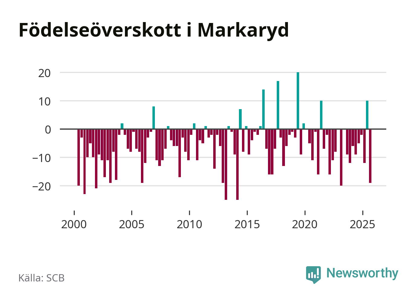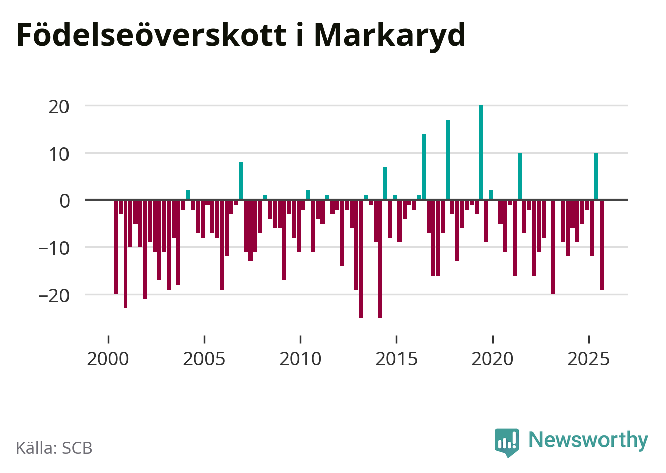 Enligt SCB:s siffror föddes 19 barn i Markaryd under det senaste kvartalet. Samtidigt avled 38 personer. Markaryd hade alltså ett negativt födelsenetto, vilket kommunen historiskt sett oftast har haft.