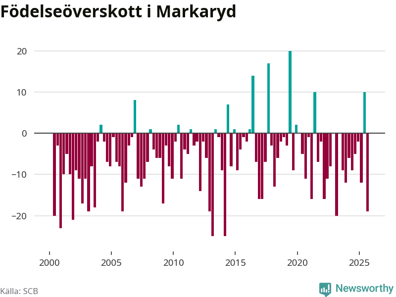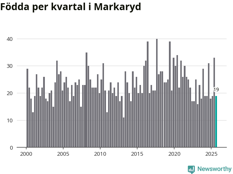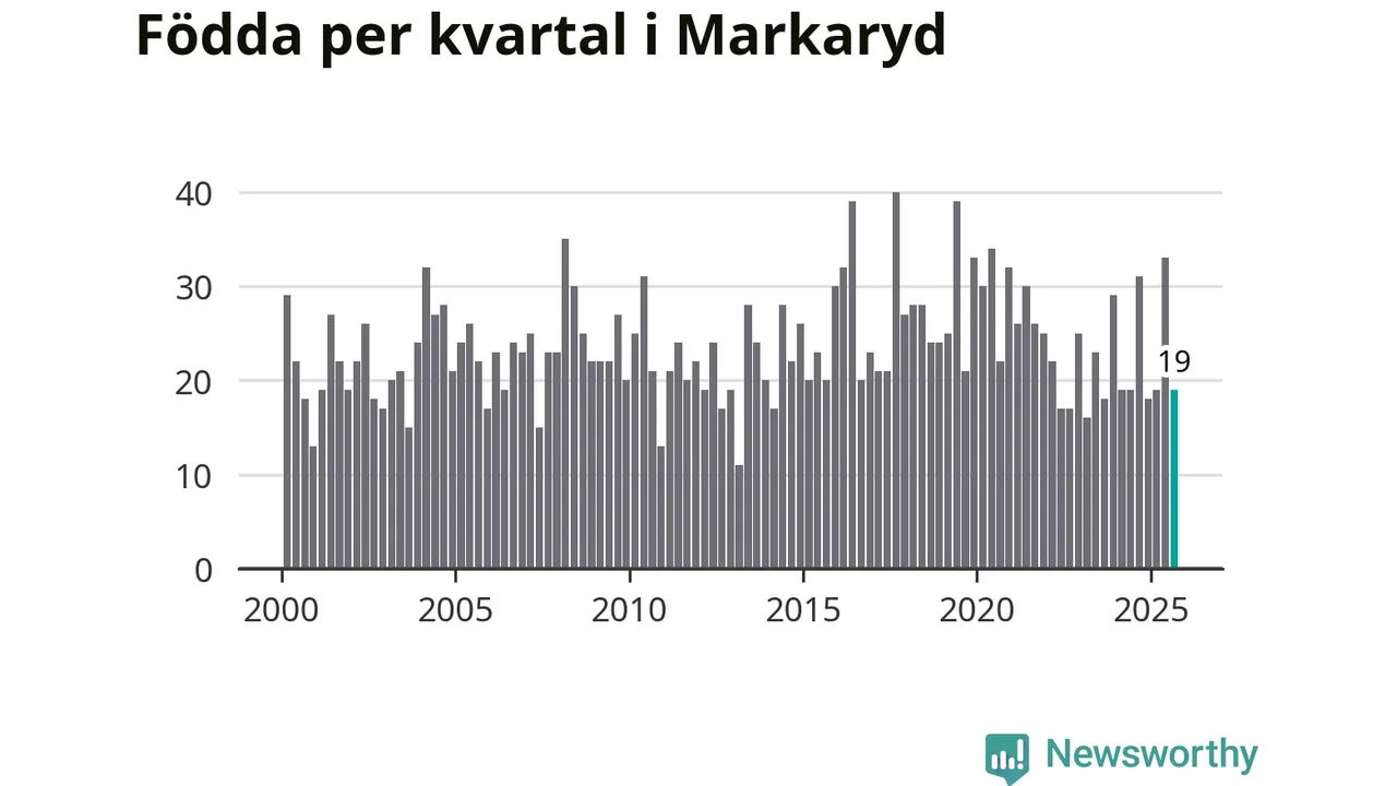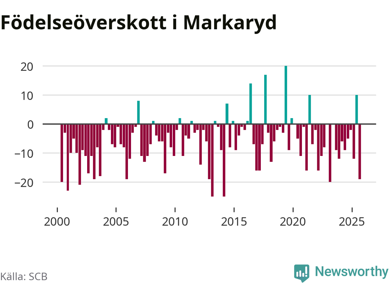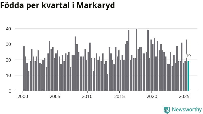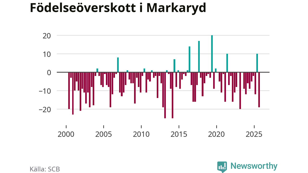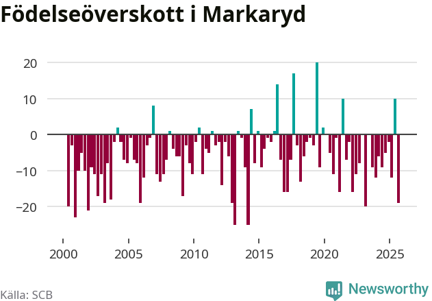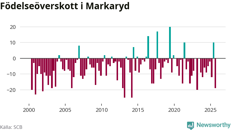 Enligt SCB:s siffror föddes 19 barn i Markaryd under det senaste kvartalet. Samtidigt avled 38 personer. Markaryd hade alltså ett negativt födelsenetto, vilket kommunen historiskt sett oftast har haft.