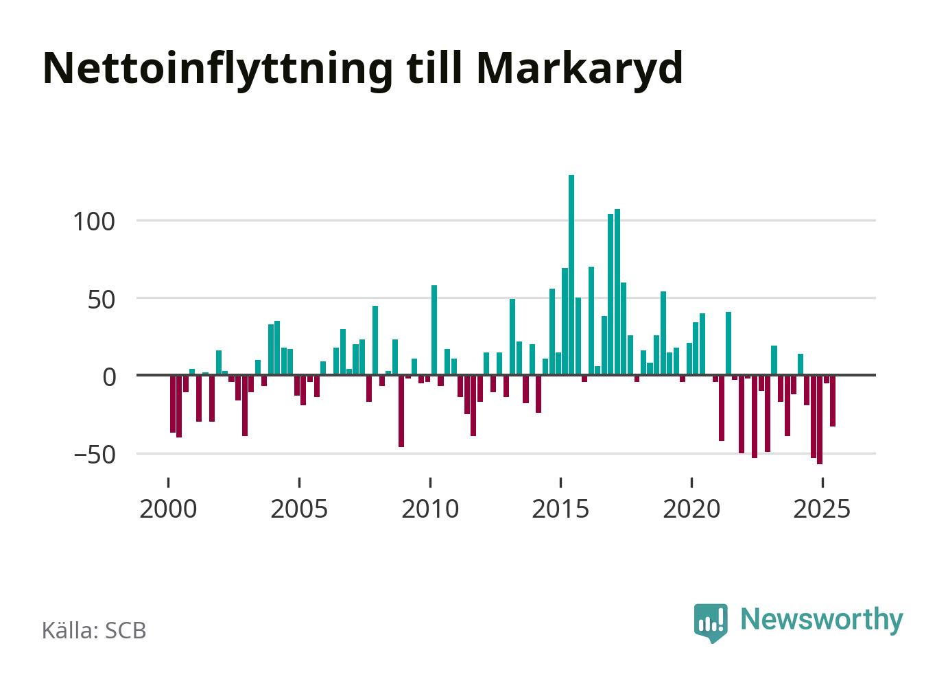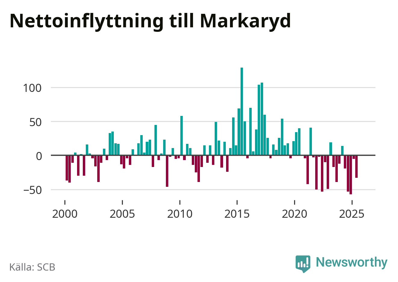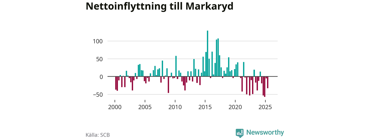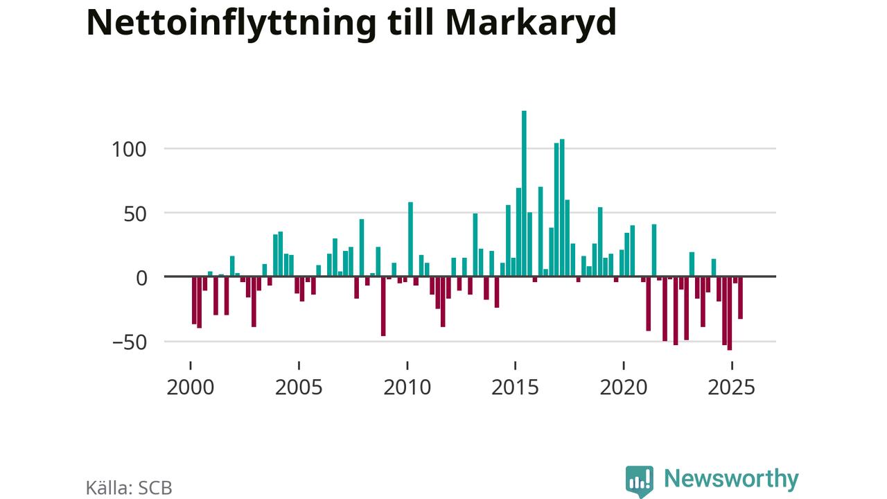 Under tredje kvartalet 2025 flyttade 160 personer till kommunen samtidigt som lika många flyttade därifrån. Sedan seklets början har Markaryd haft ungefär lika många kvartal med positivt flyttnetto som negativt.