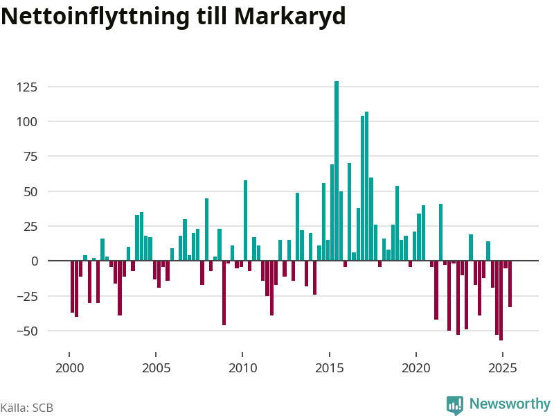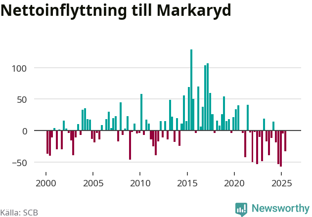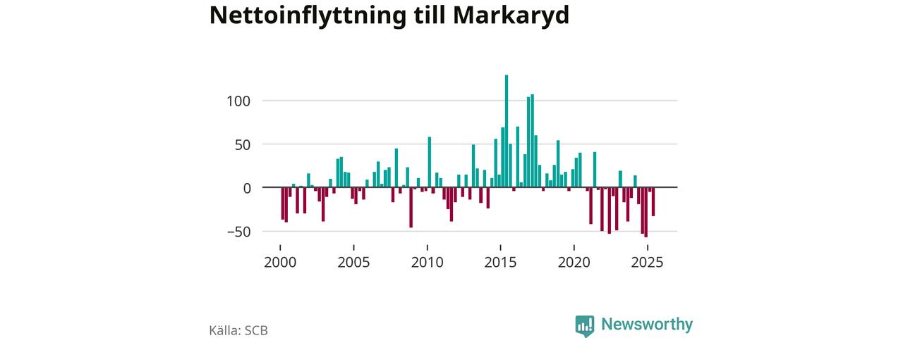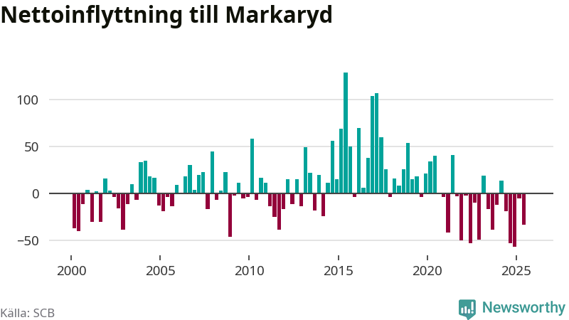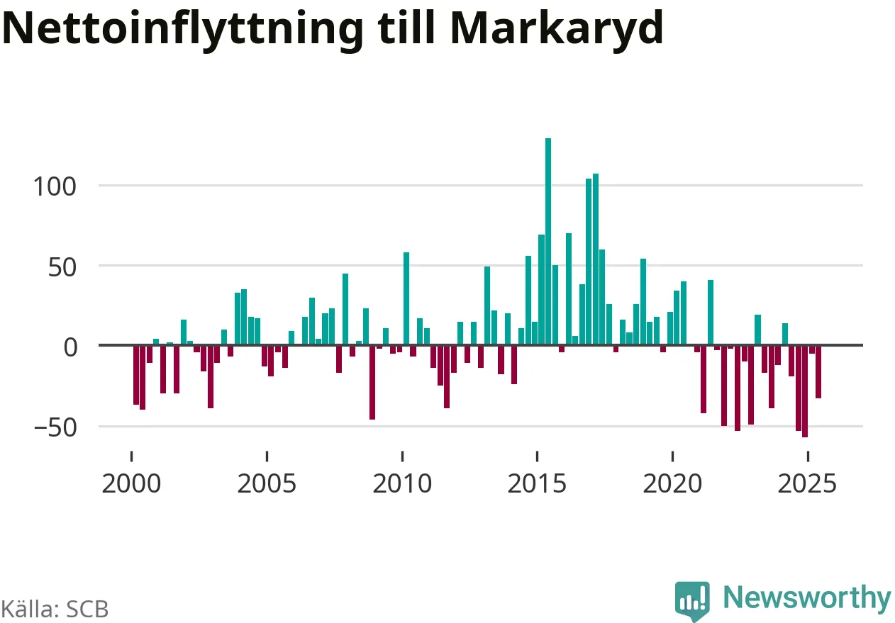 Under tredje kvartalet 2025 flyttade 160 personer till kommunen samtidigt som lika många flyttade därifrån. Sedan seklets början har Markaryd haft ungefär lika många kvartal med positivt flyttnetto som negativt.