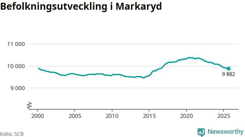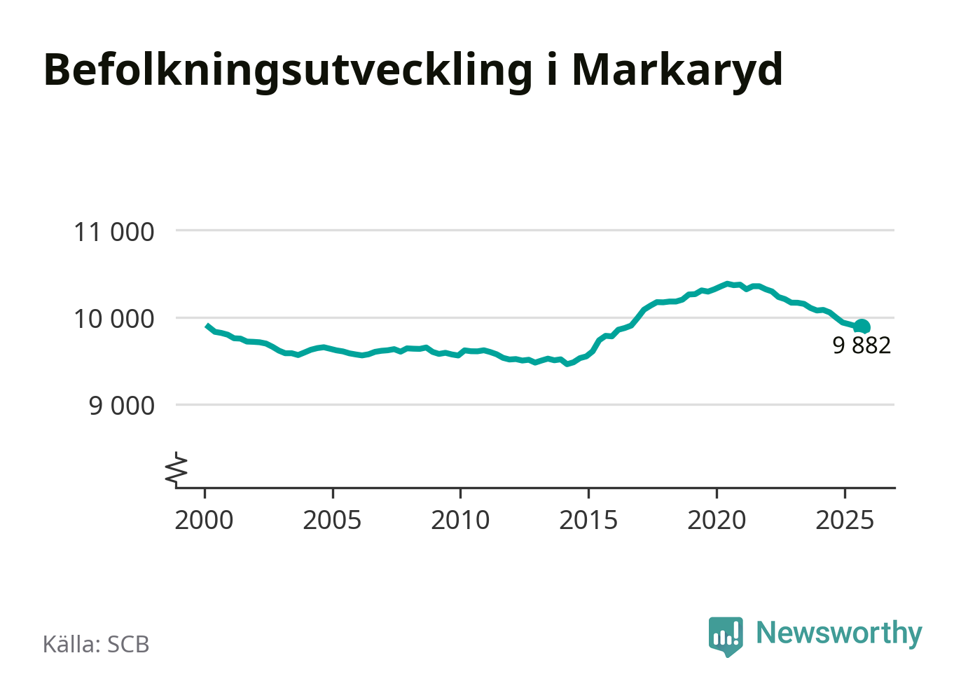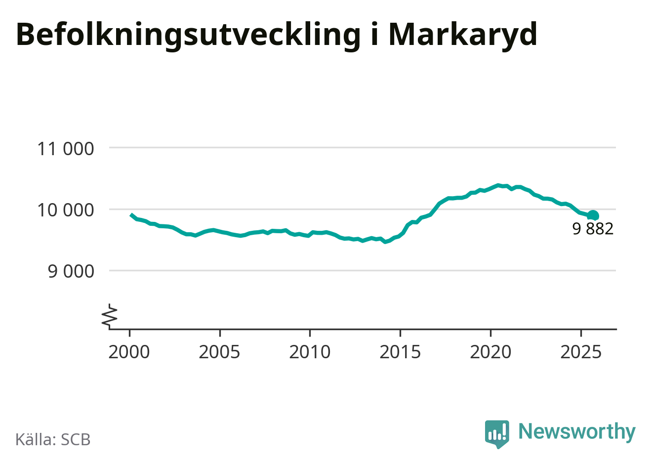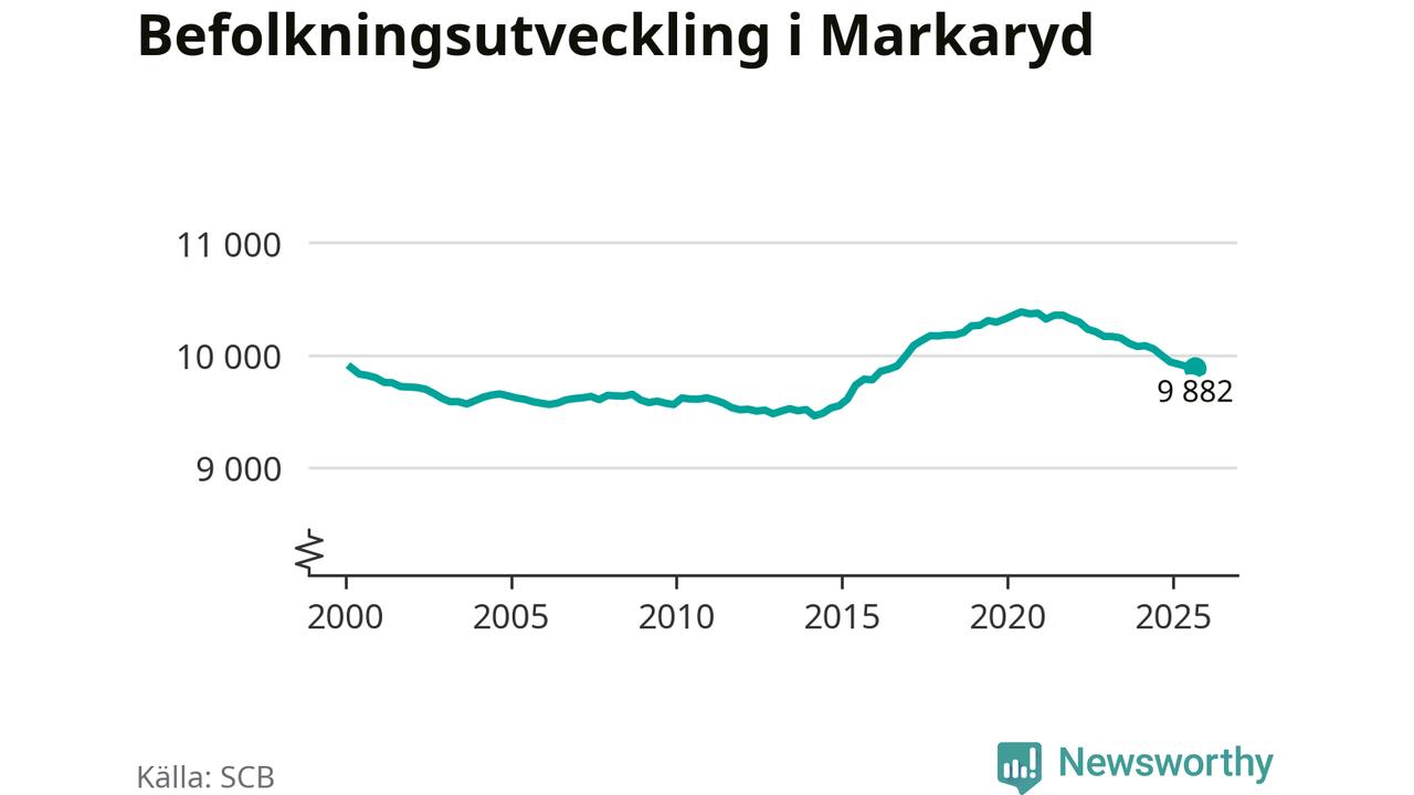 Befolkningen minskade i Markaryds kommun under det tredje kvartalet 2025. Den 30 september bodde enligt SCB:s senaste siffror 9 882 personer i kommunen, vilket är 16 färre än i slutet av andra kvartalet.