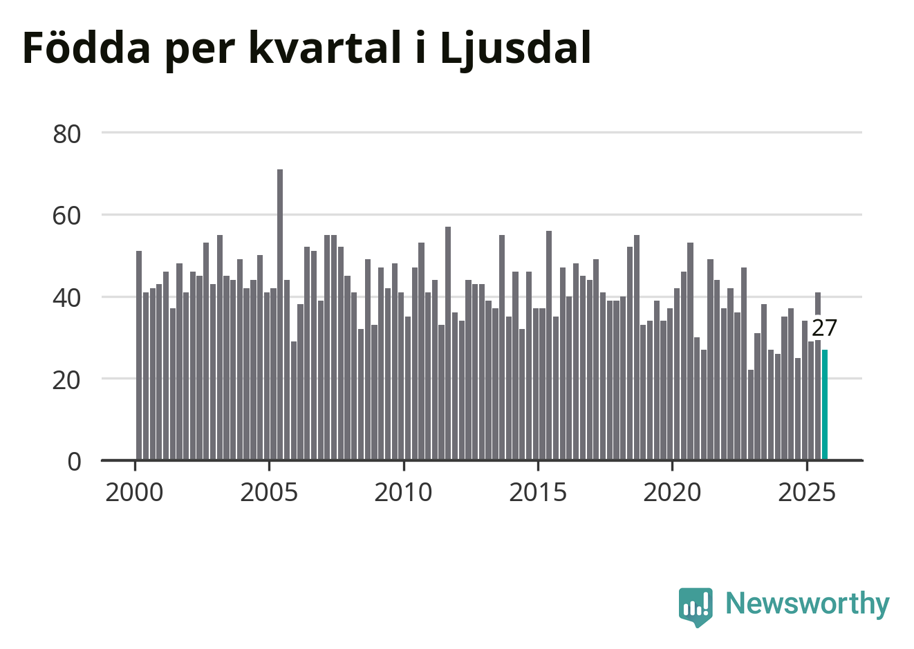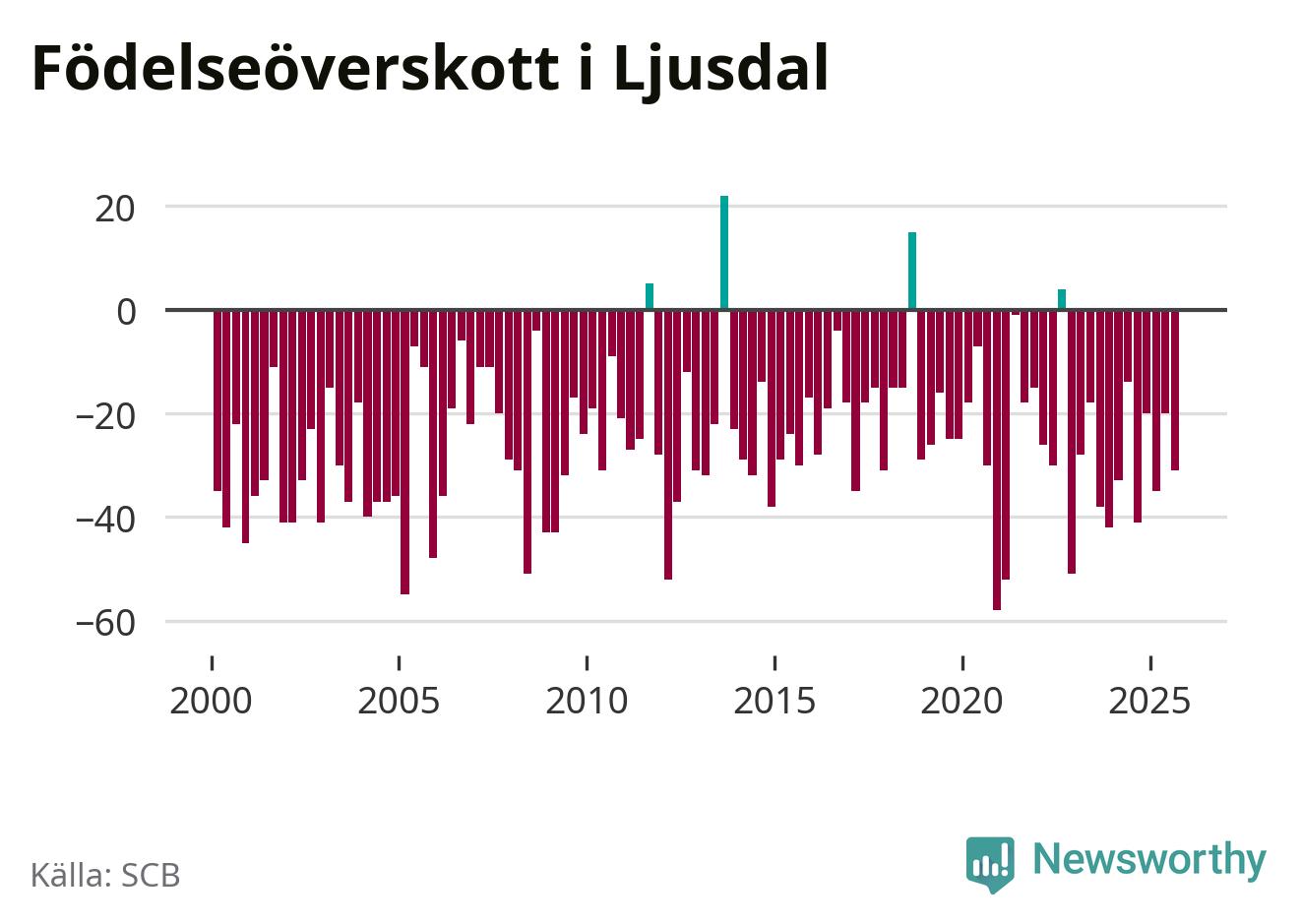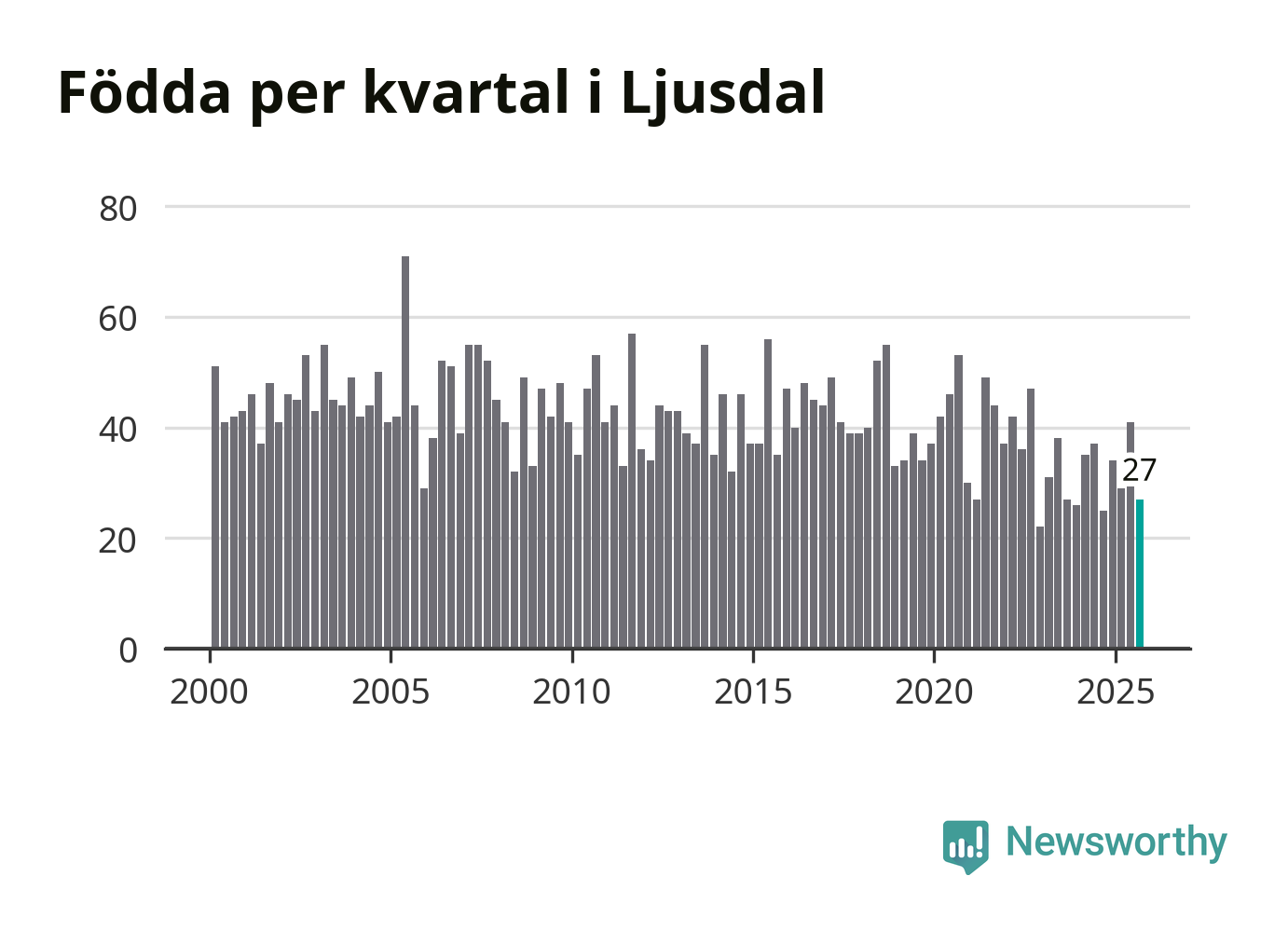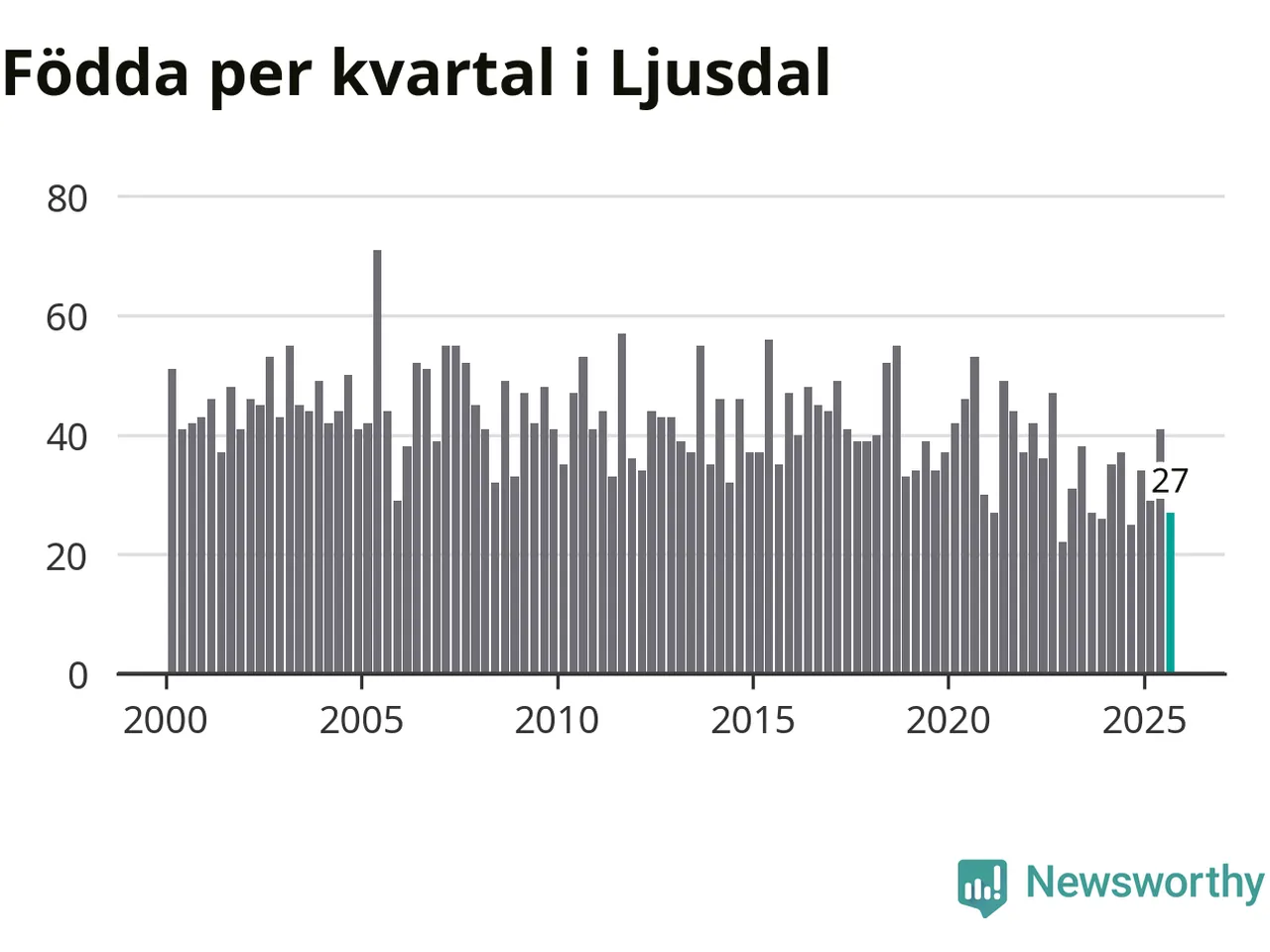 Enligt SCB:s siffror föddes 27 barn i Ljusdal under det senaste kvartalet. Samtidigt avled 58 personer. Ljusdal hade alltså ett negativt födelsenetto, vilket kommunen historiskt sett nästan alltid har haft.