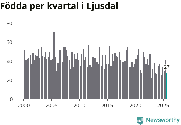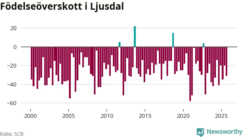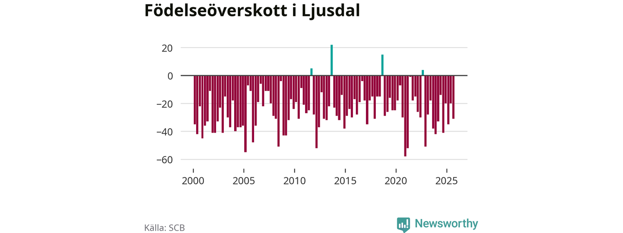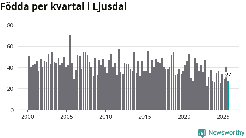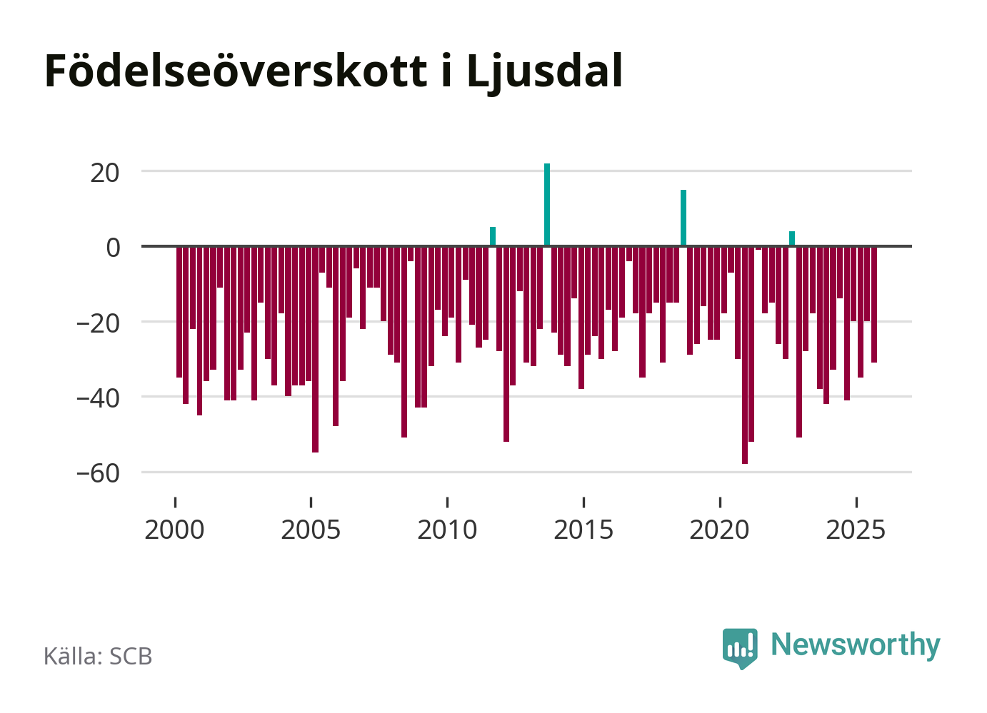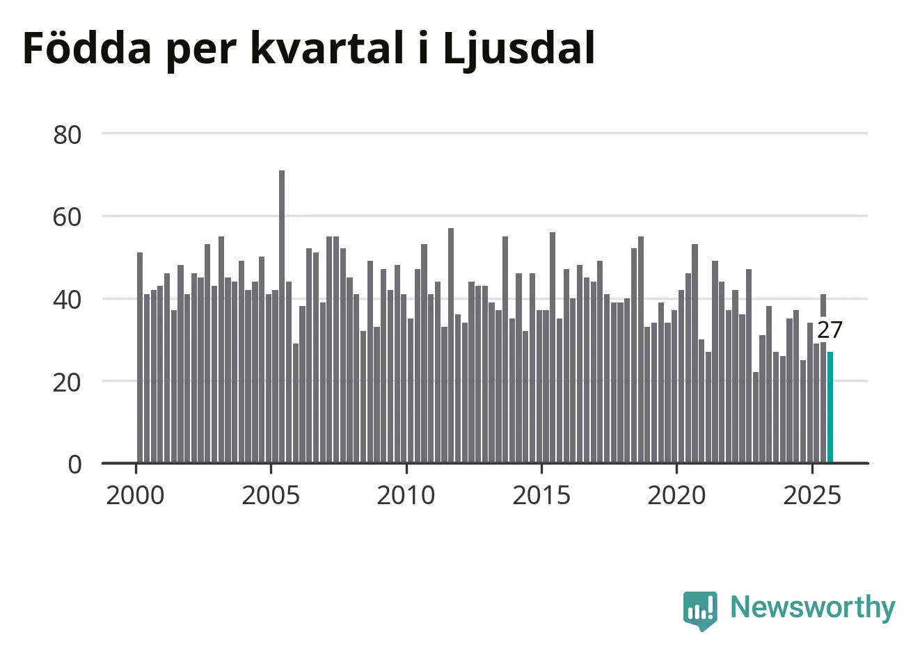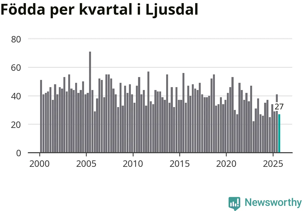 Enligt SCB:s siffror föddes 27 barn i Ljusdal under det senaste kvartalet. Samtidigt avled 58 personer. Ljusdal hade alltså ett negativt födelsenetto, vilket kommunen historiskt sett nästan alltid har haft.