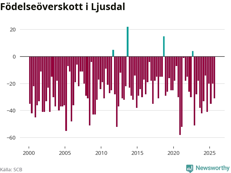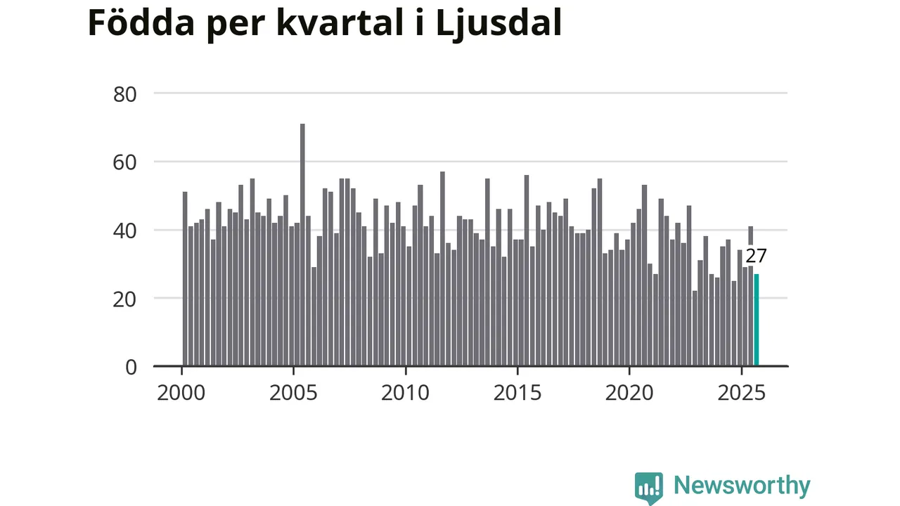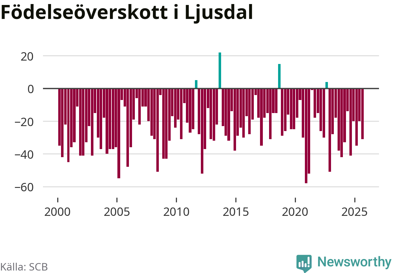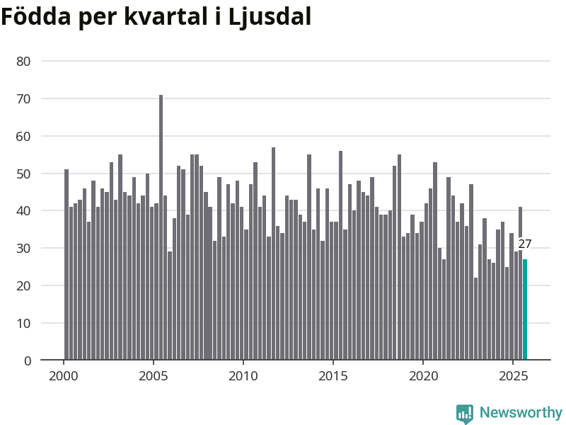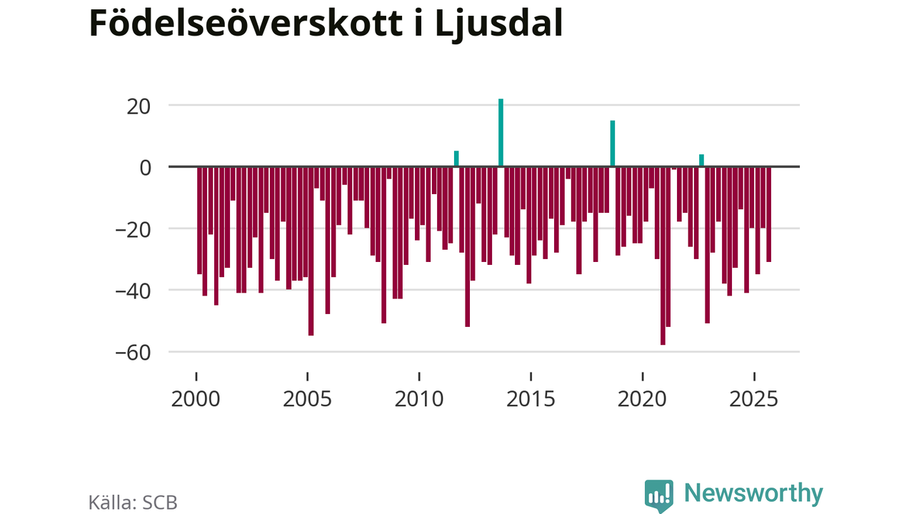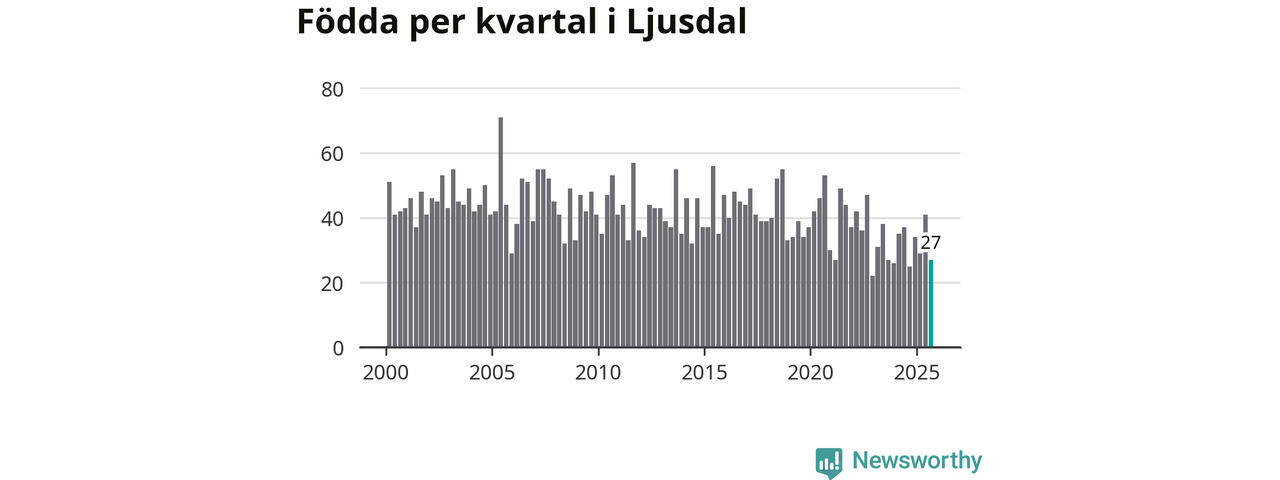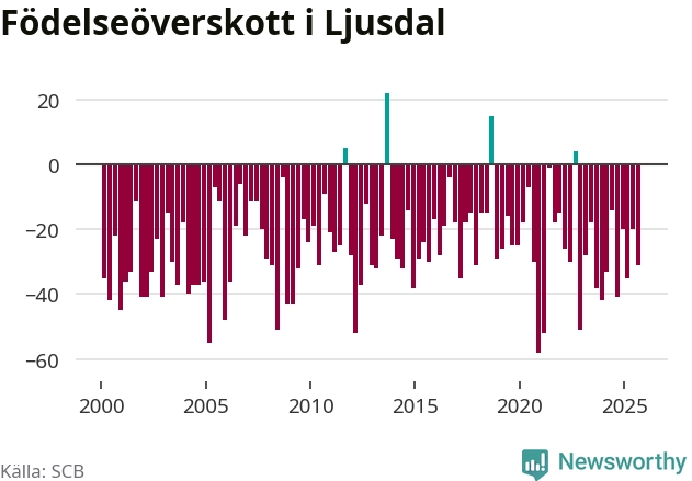 Enligt SCB:s siffror föddes 27 barn i Ljusdal under det senaste kvartalet. Samtidigt avled 58 personer. Ljusdal hade alltså ett negativt födelsenetto, vilket kommunen historiskt sett nästan alltid har haft.