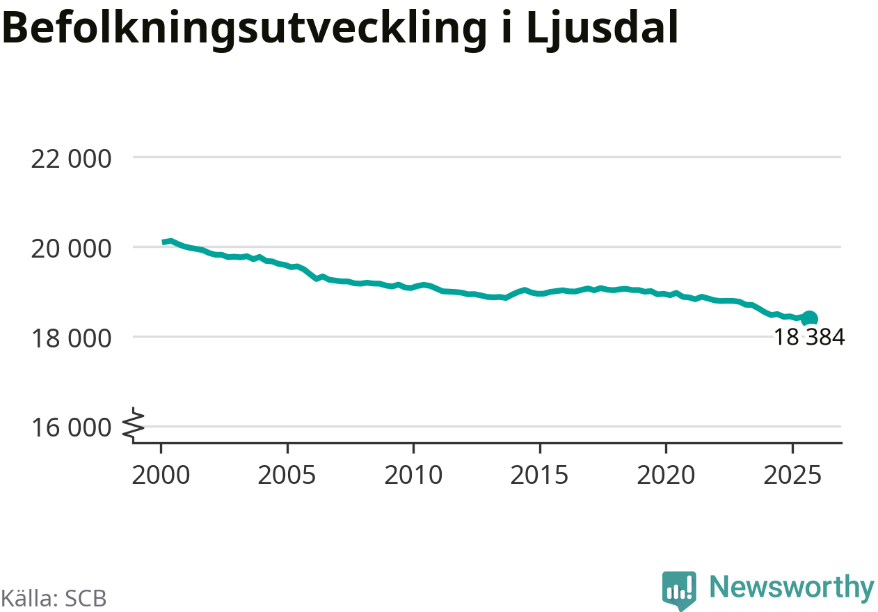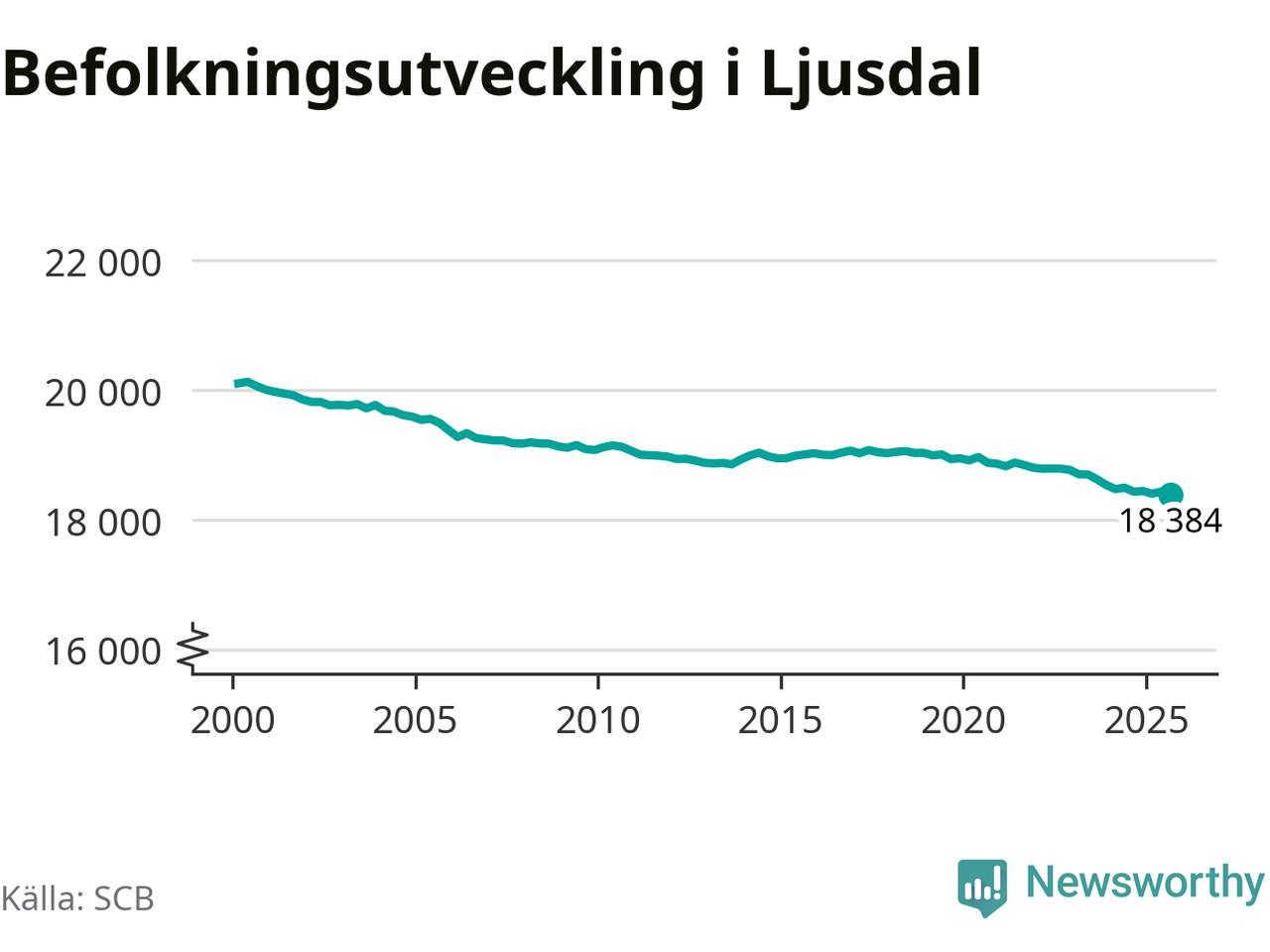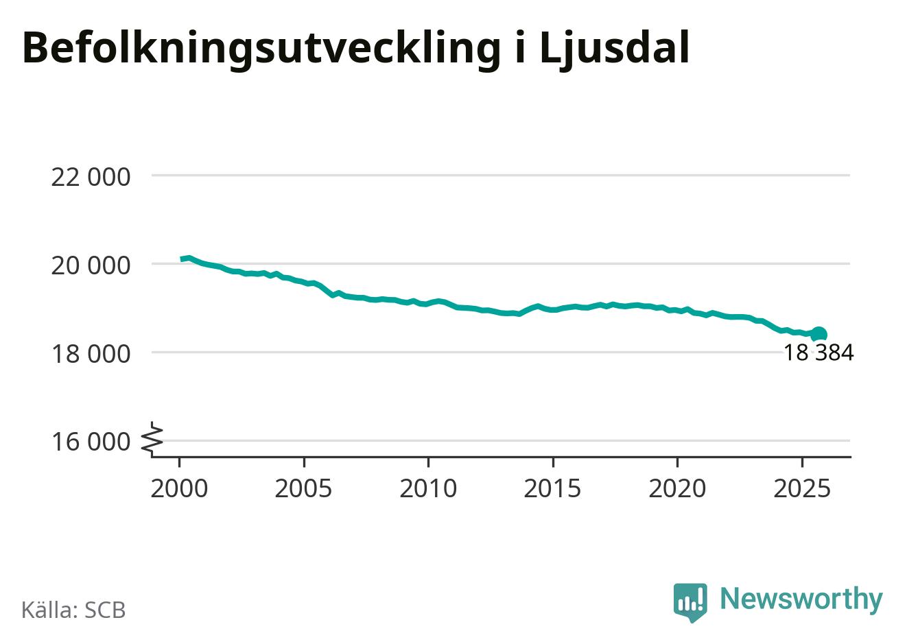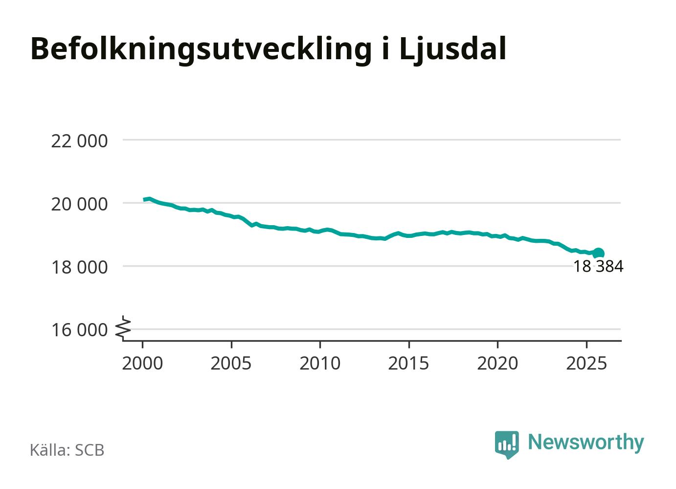 Jämfört med för ett år sedan har befolkningen i Ljusdal minskat med ungefär 50 personer. Sedan millennieskiftet har folkmängden minskat med runt 1 720 personer, eller 9 procent.