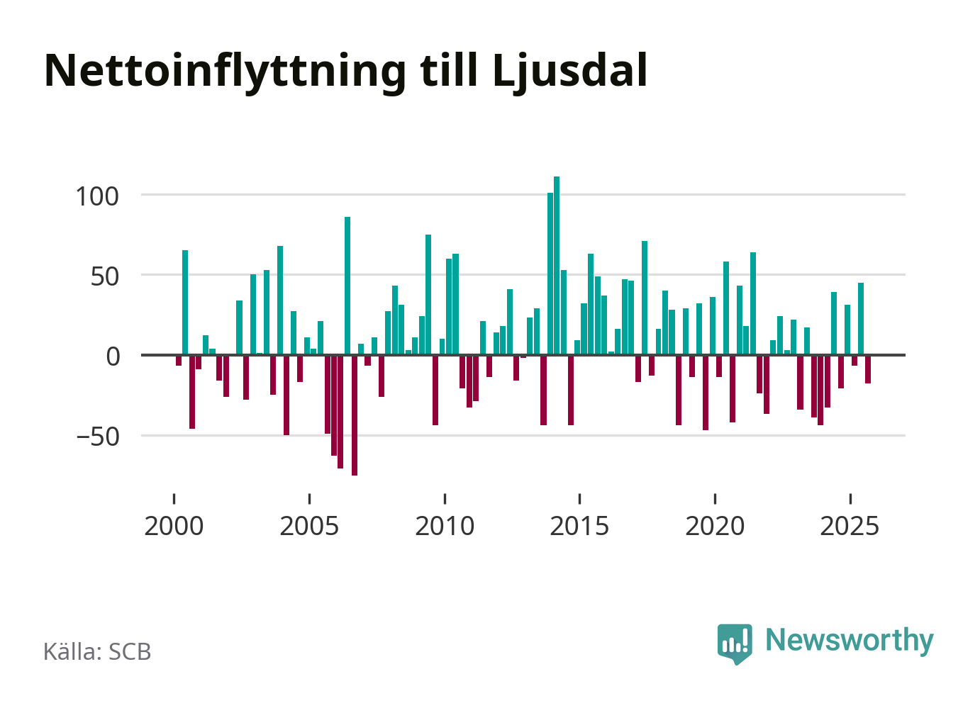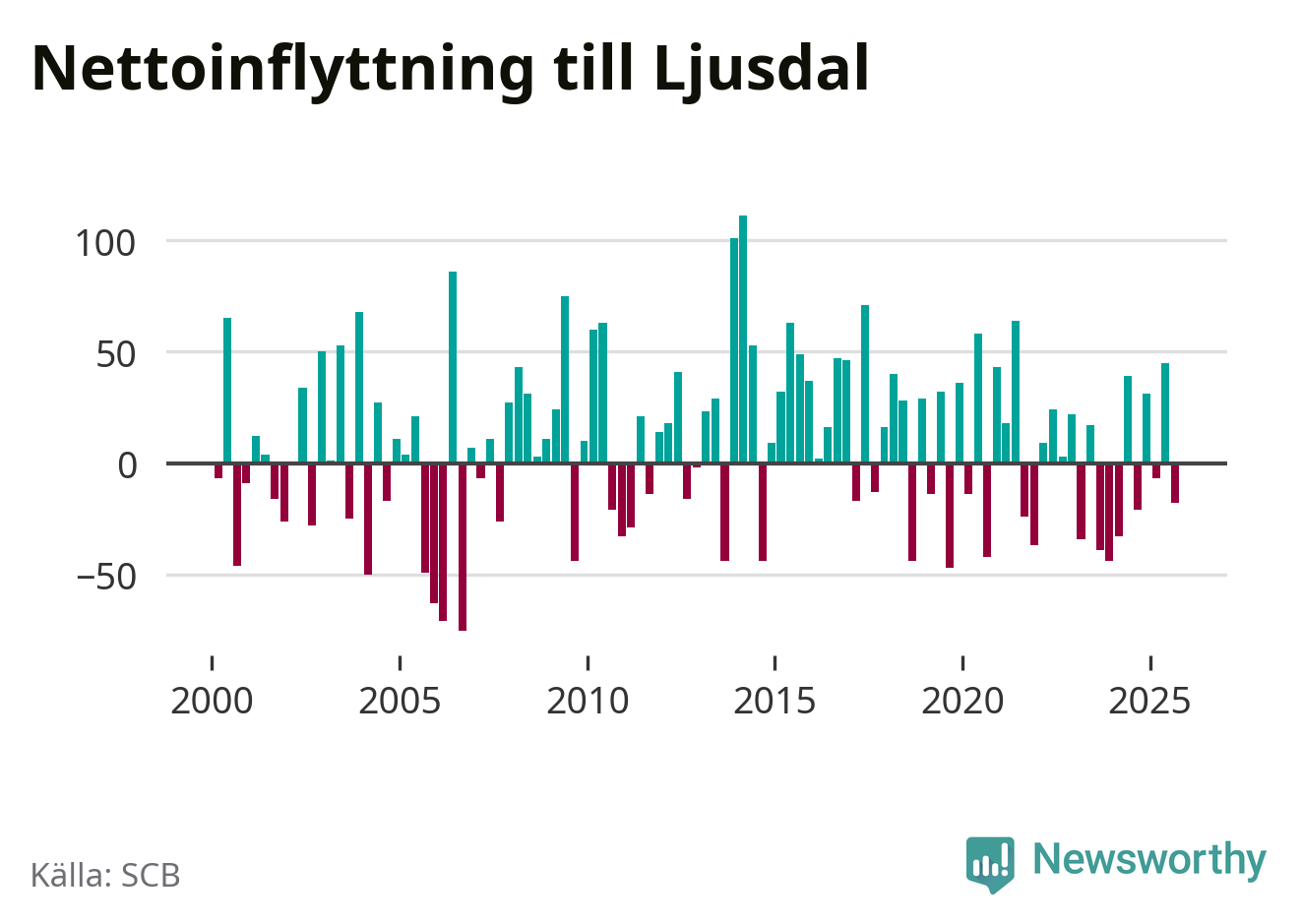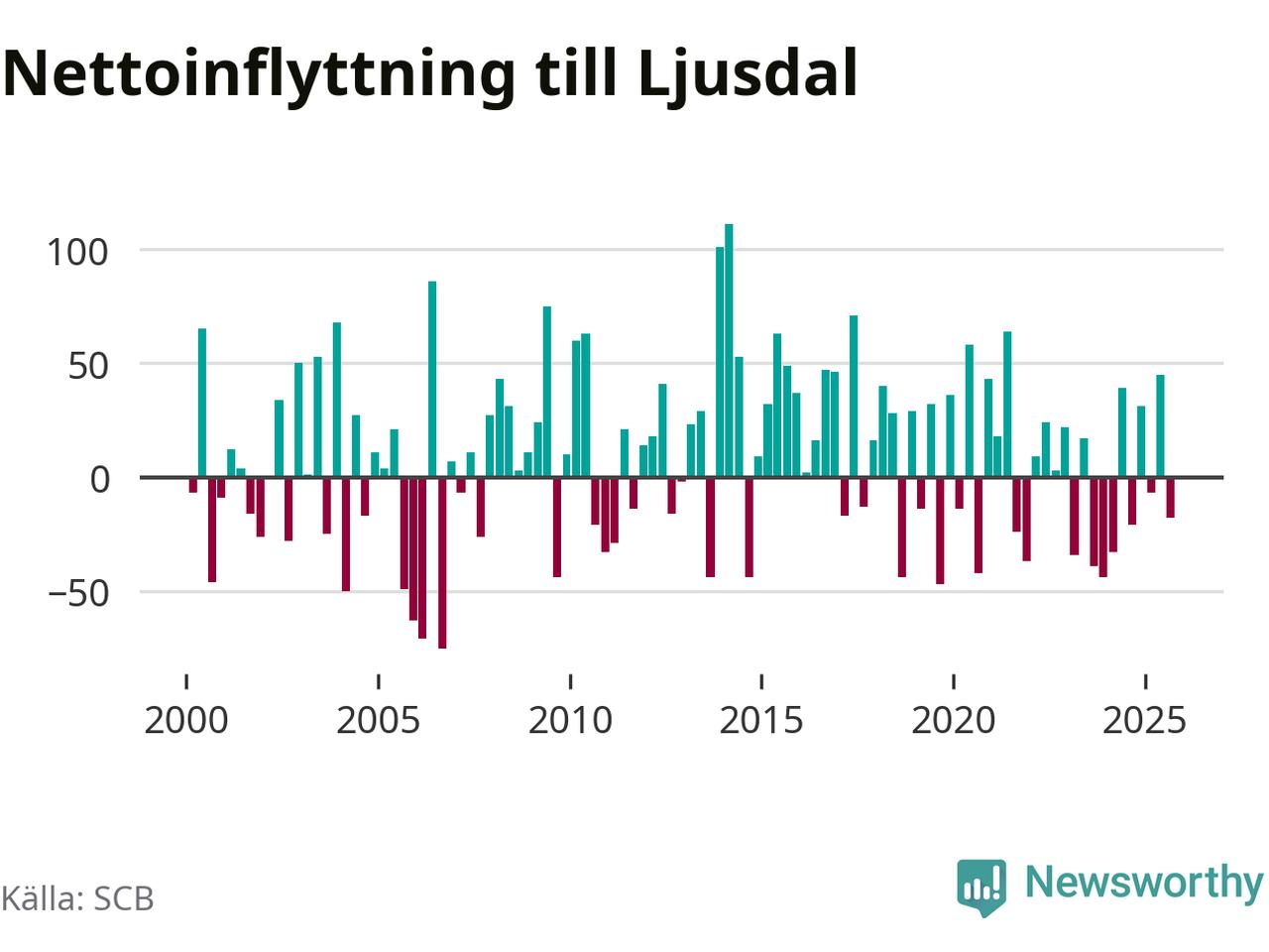 Under tredje kvartalet 2025 flyttade 188 personer till kommunen medan 206 personer flyttade därifrån. Sedan seklets början har Ljusdal oftast haft ett positivt flyttnetto.