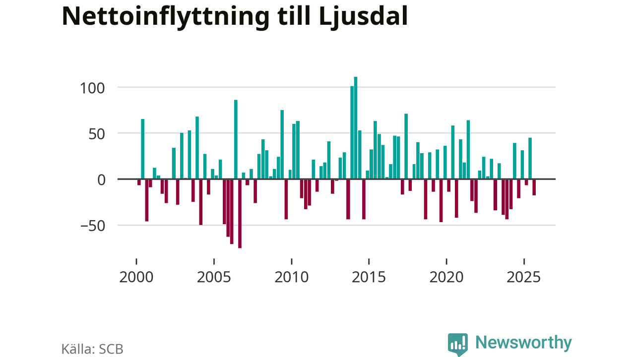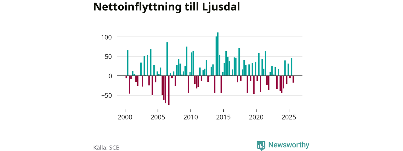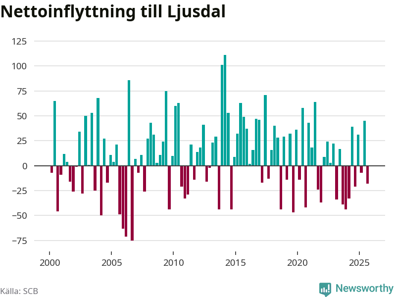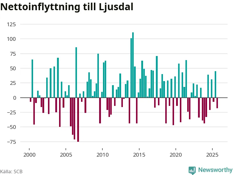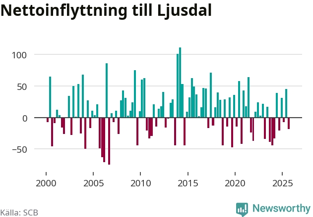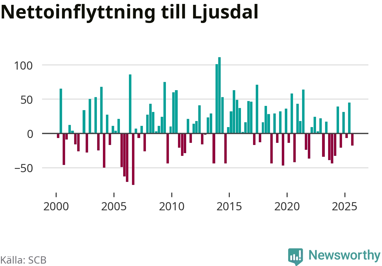 Under tredje kvartalet 2025 flyttade 188 personer till kommunen medan 206 personer flyttade därifrån. Sedan seklets början har Ljusdal oftast haft ett positivt flyttnetto.