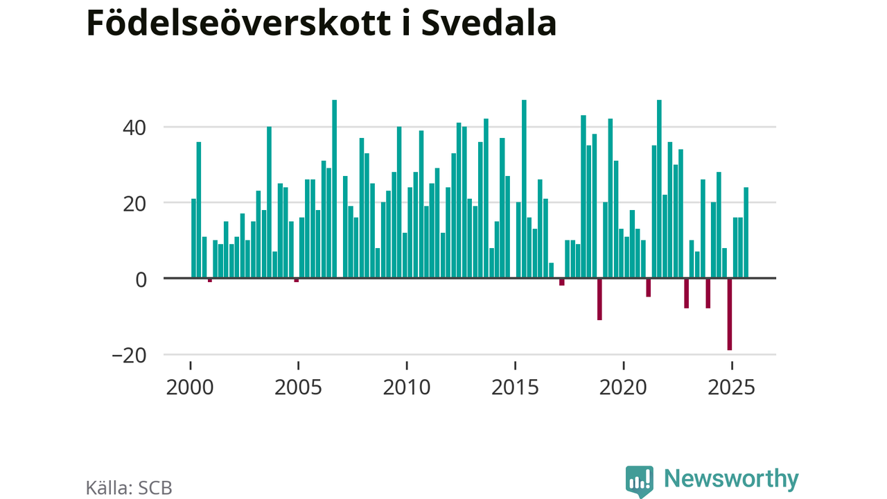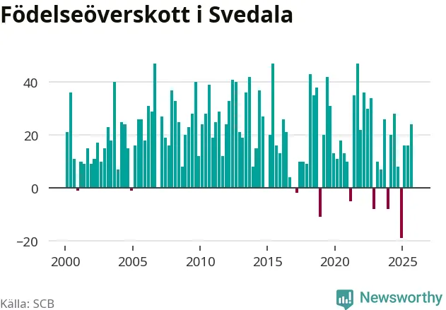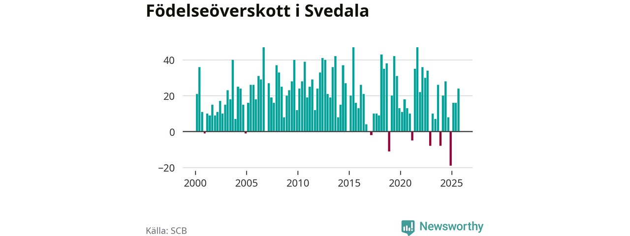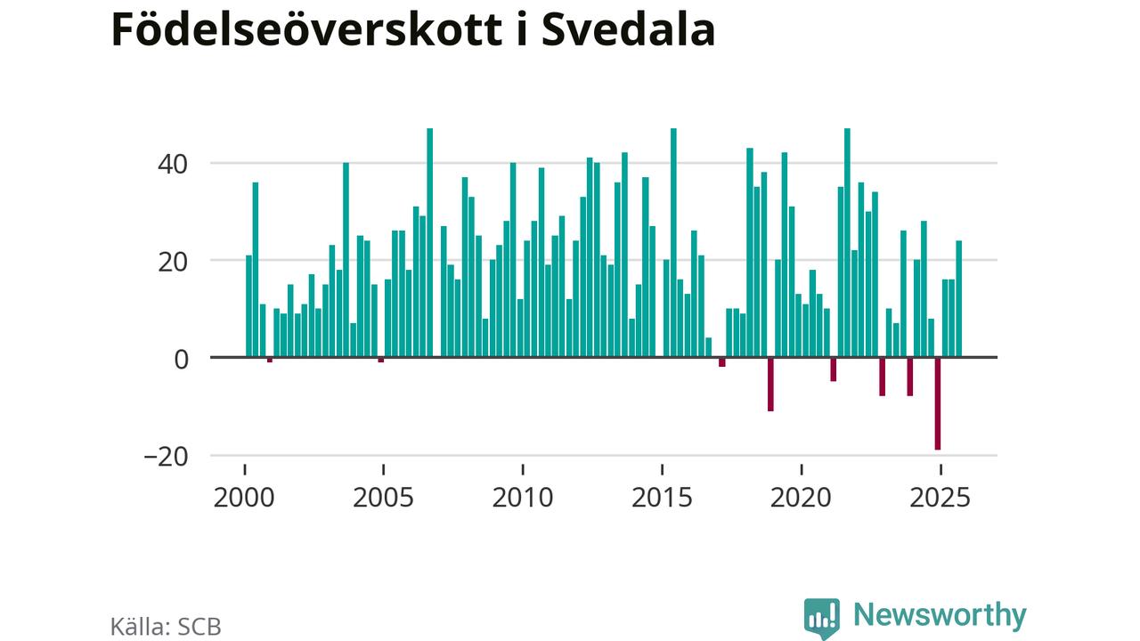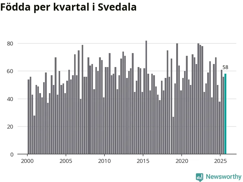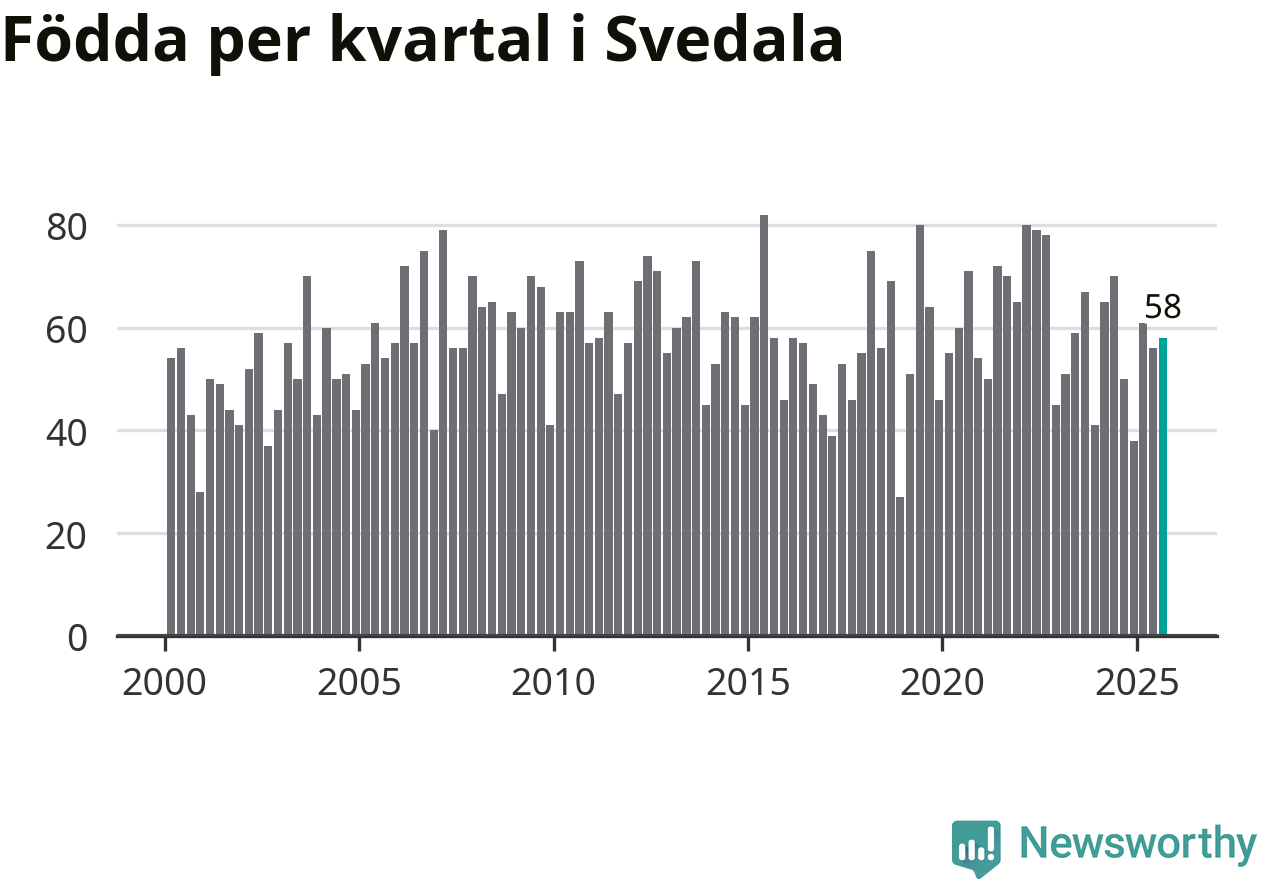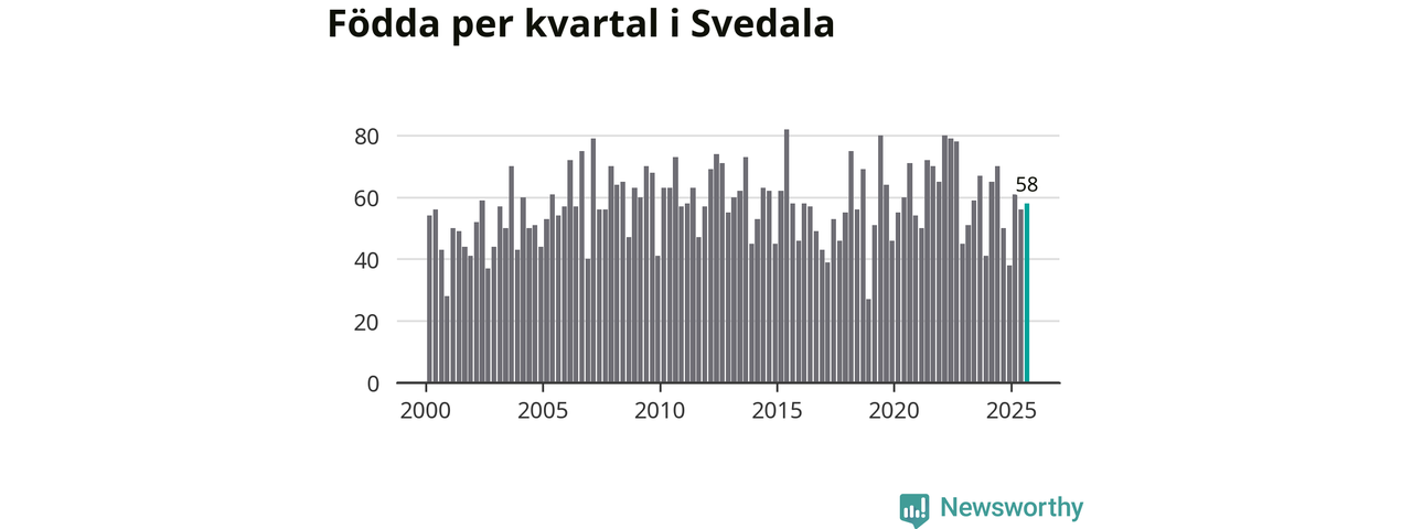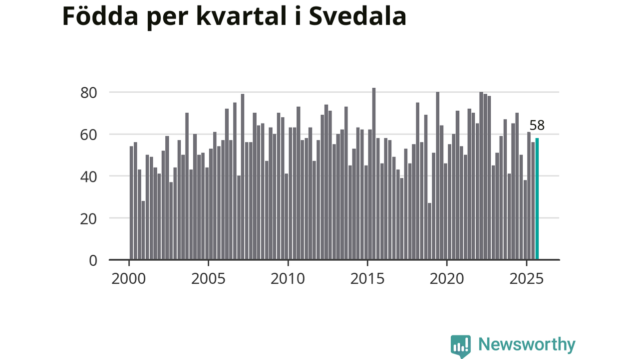 Enligt SCB:s siffror föddes 58 barn i Svedala under det senaste kvartalet. Samtidigt avled 34 personer. Svedala hade alltså ett positivt födelsenetto, vilket kommunen historiskt sett nästan alltid har haft.