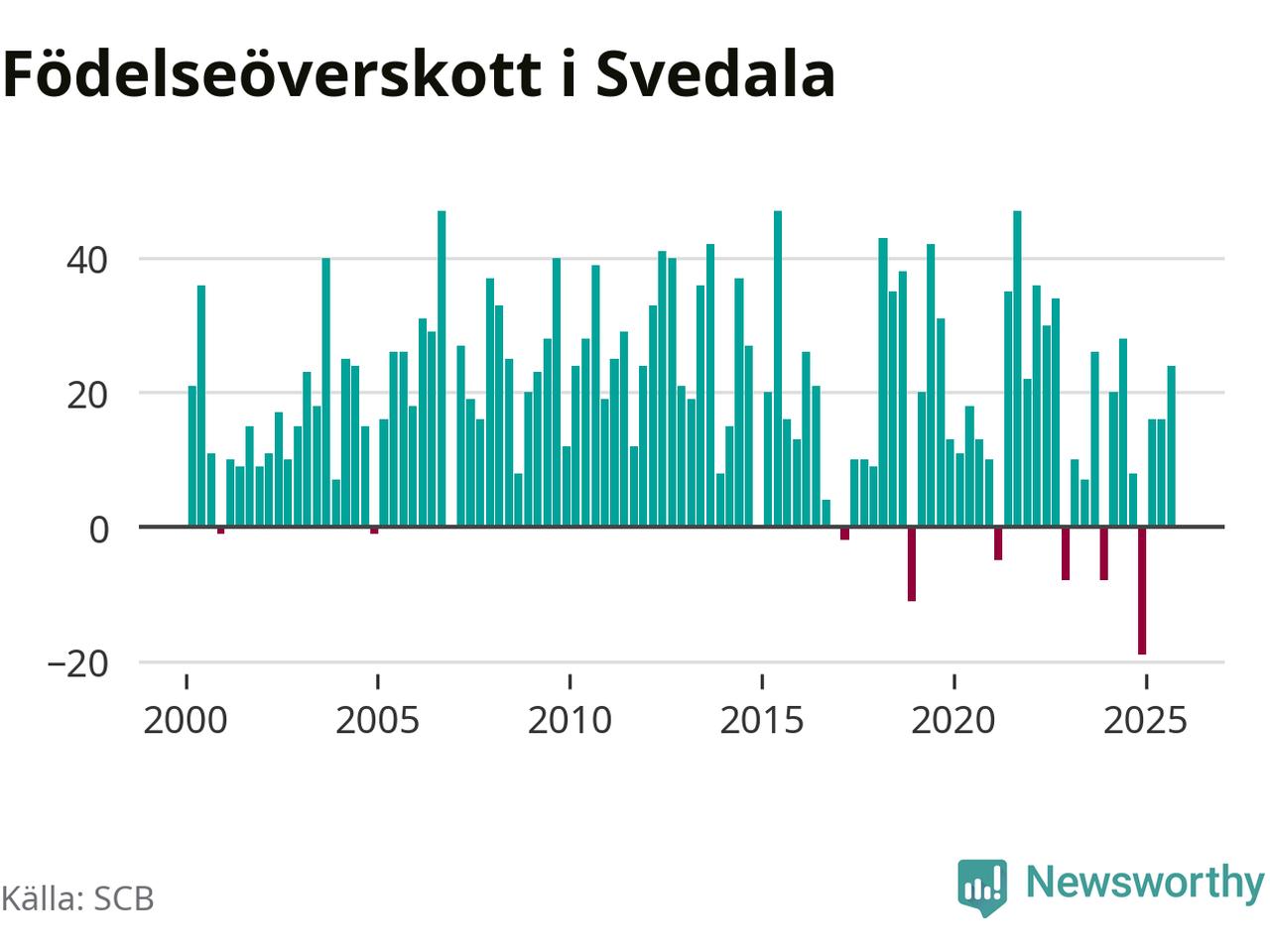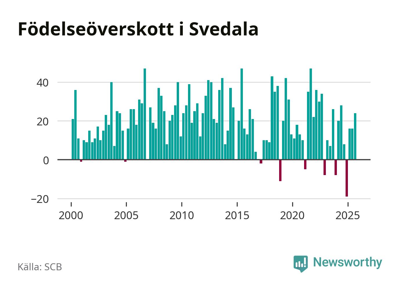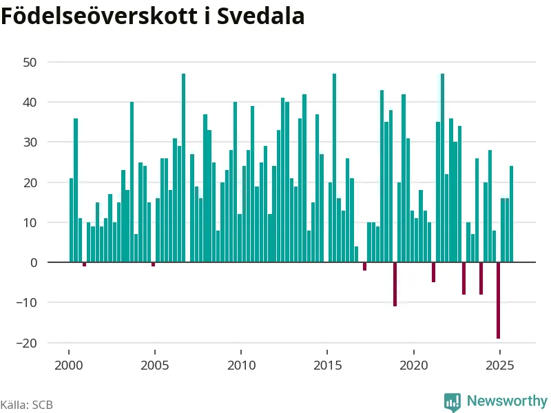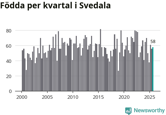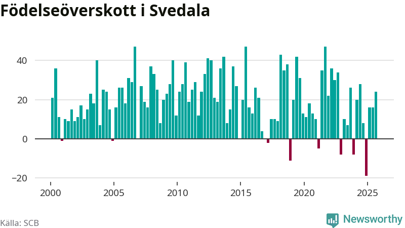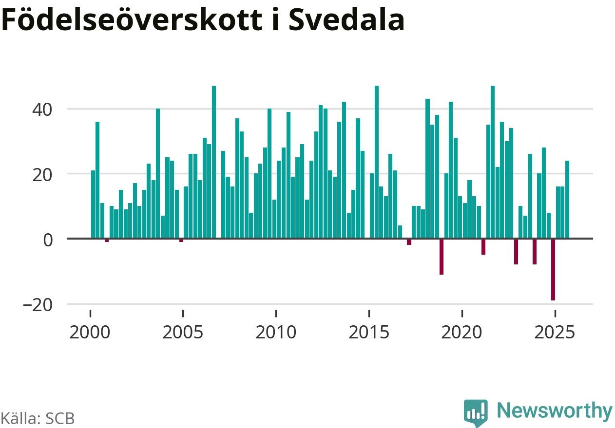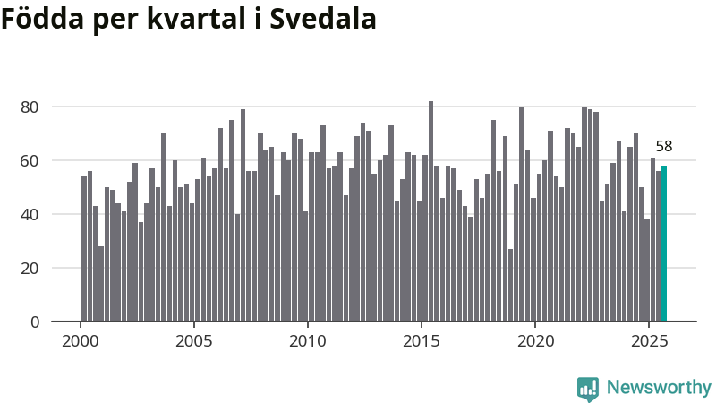 Enligt SCB:s siffror föddes 58 barn i Svedala under det senaste kvartalet. Samtidigt avled 34 personer. Svedala hade alltså ett positivt födelsenetto, vilket kommunen historiskt sett nästan alltid har haft.