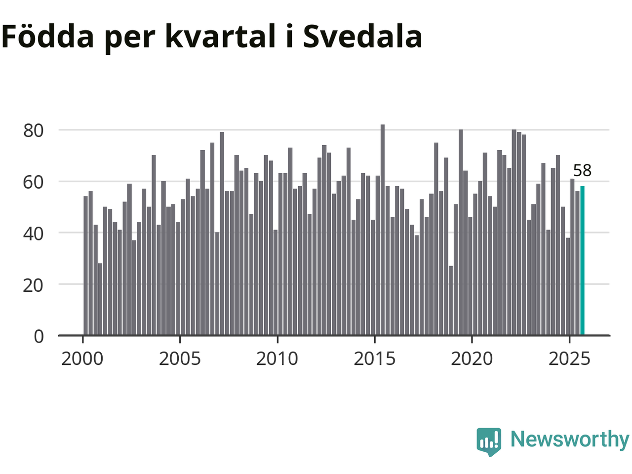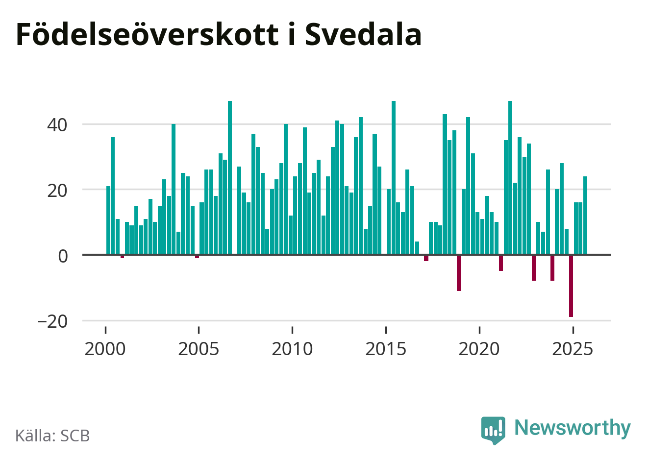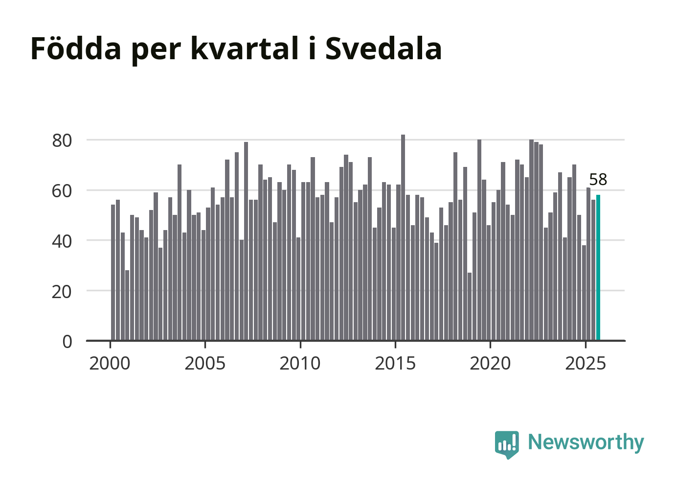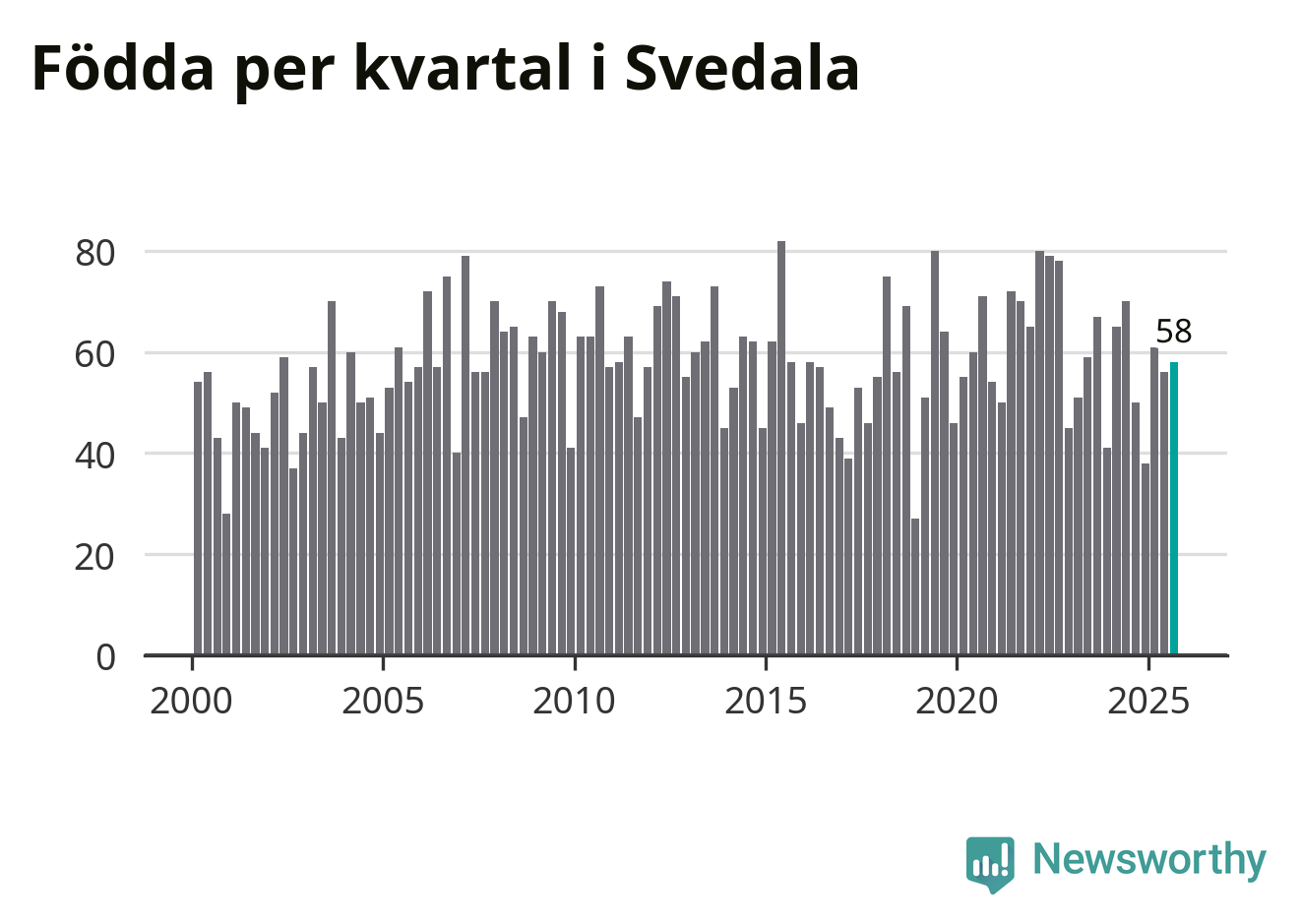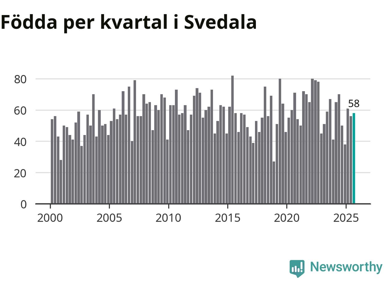 Enligt SCB:s siffror föddes 58 barn i Svedala under det senaste kvartalet. Samtidigt avled 34 personer. Svedala hade alltså ett positivt födelsenetto, vilket kommunen historiskt sett nästan alltid har haft.