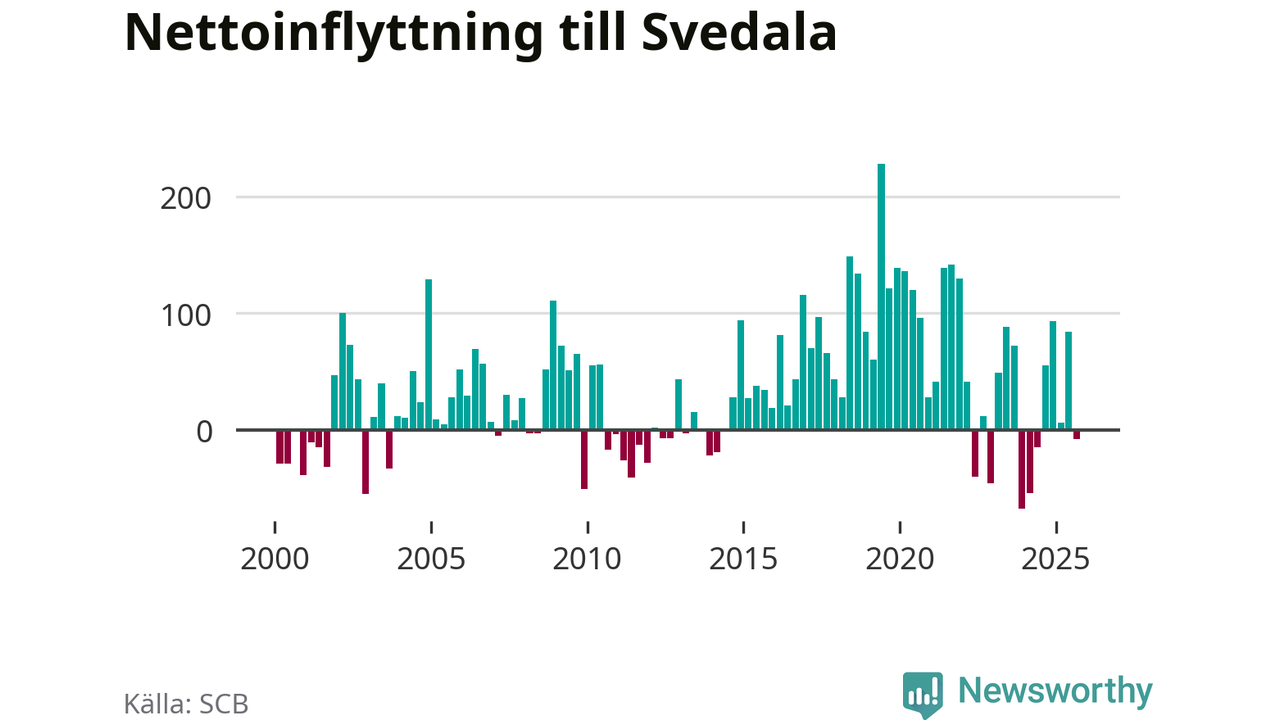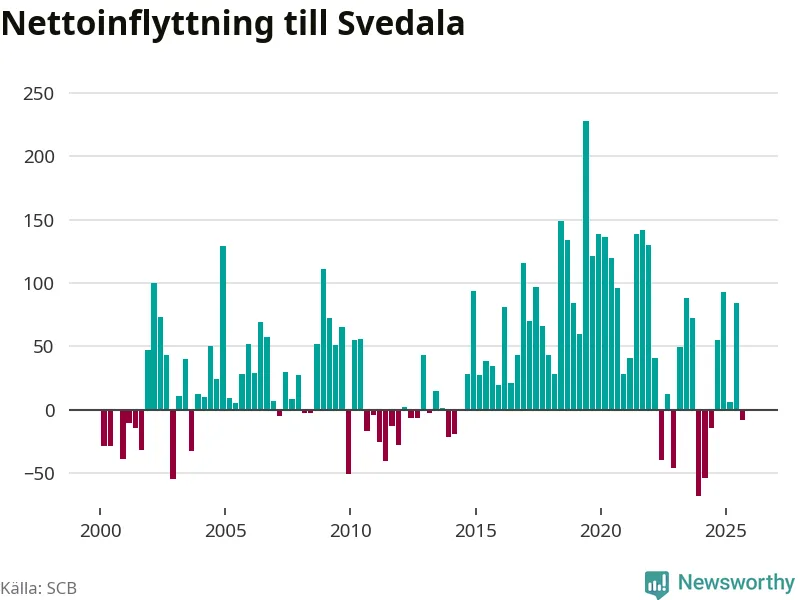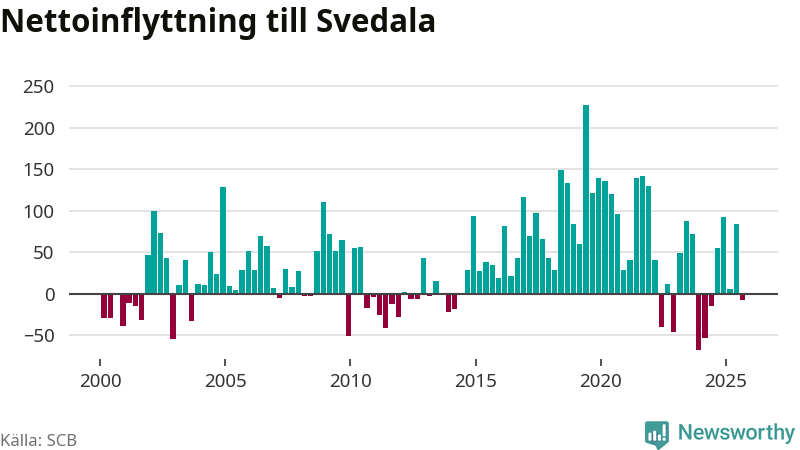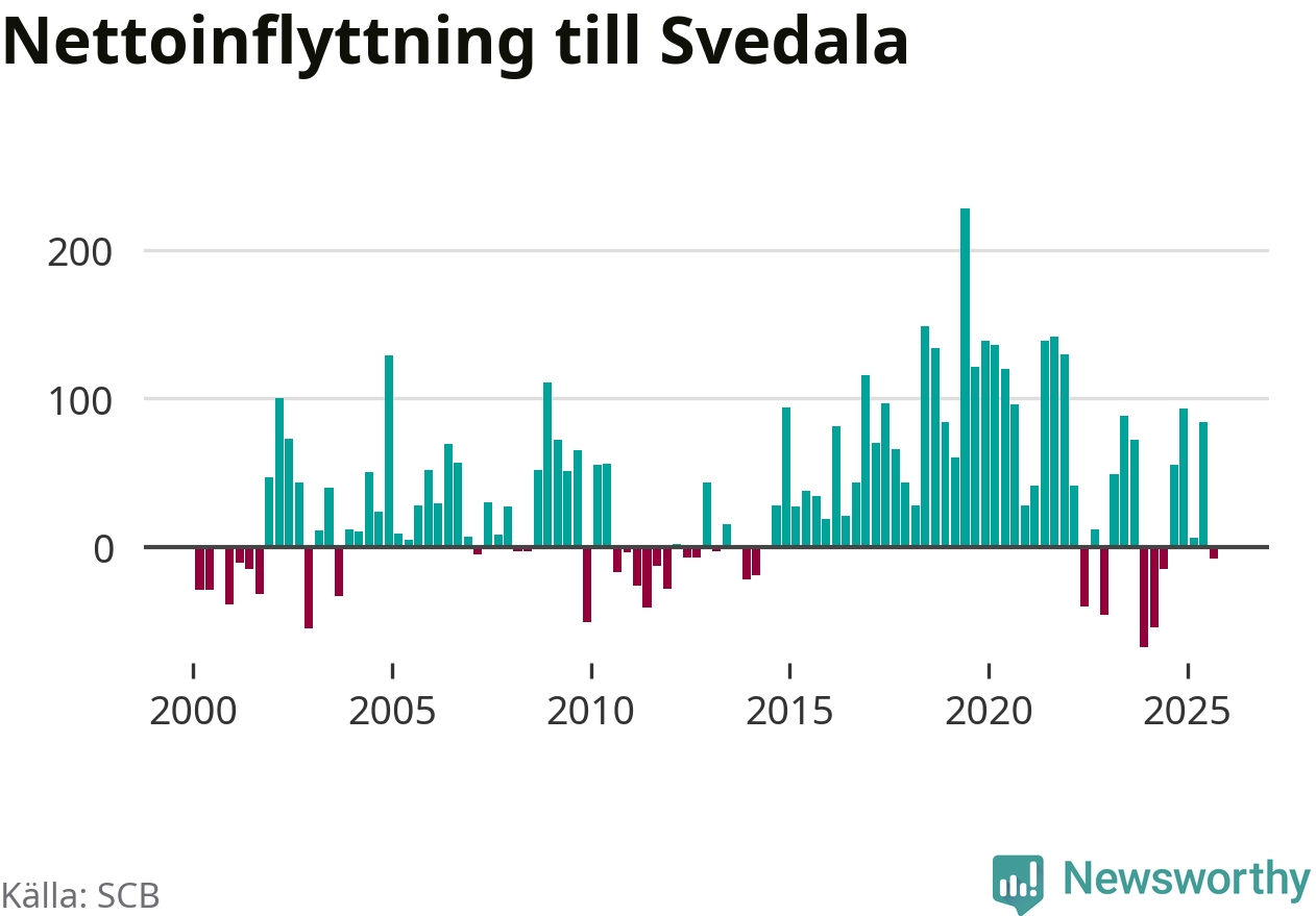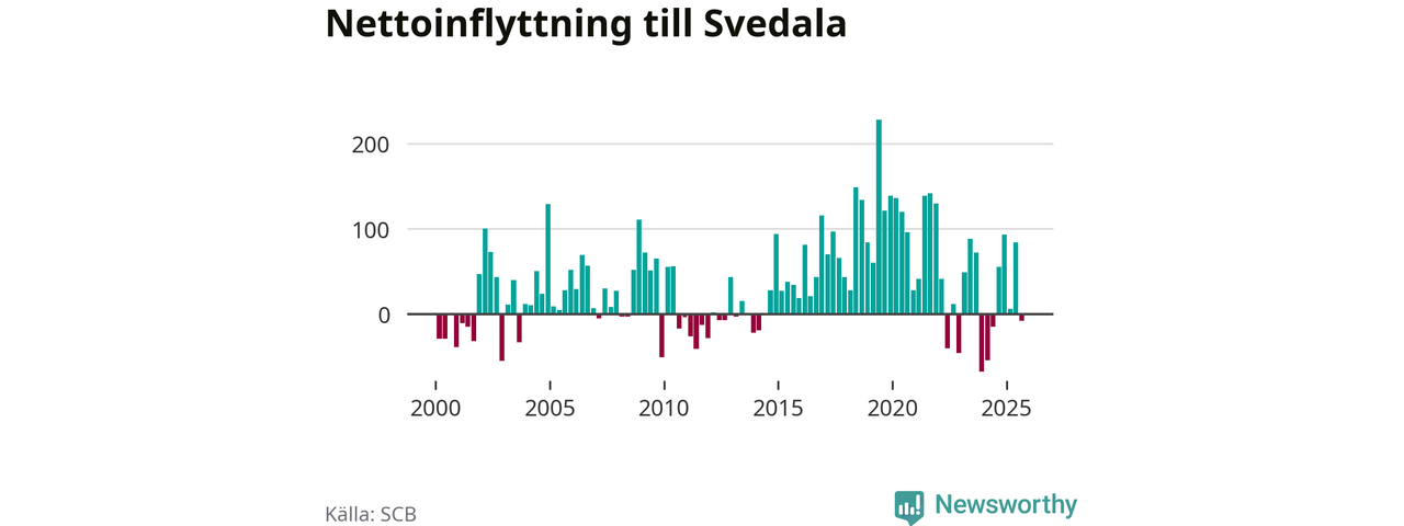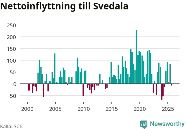 Under tredje kvartalet 2025 flyttade 344 personer till kommunen medan 352 personer flyttade därifrån. Det är historiskt sett en stor utflyttning under ett kvartal. Skillnaden mellan antalet in- och utflyttade är så liten att den lika gärna kan bero på SCB:s slumpmässiga brus. Sedan seklets början har Svedala haft ett positivt flyttnetto under nästan alla kvartal.
