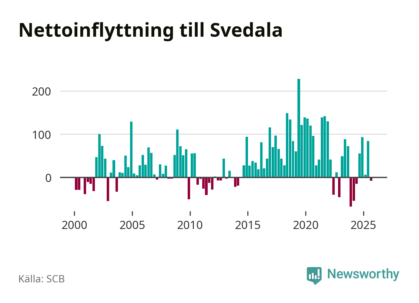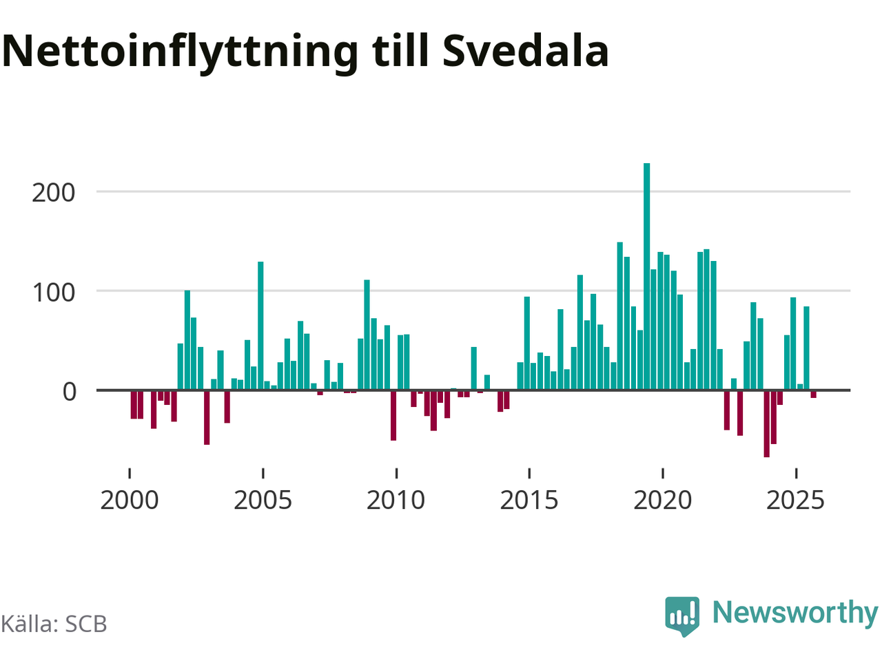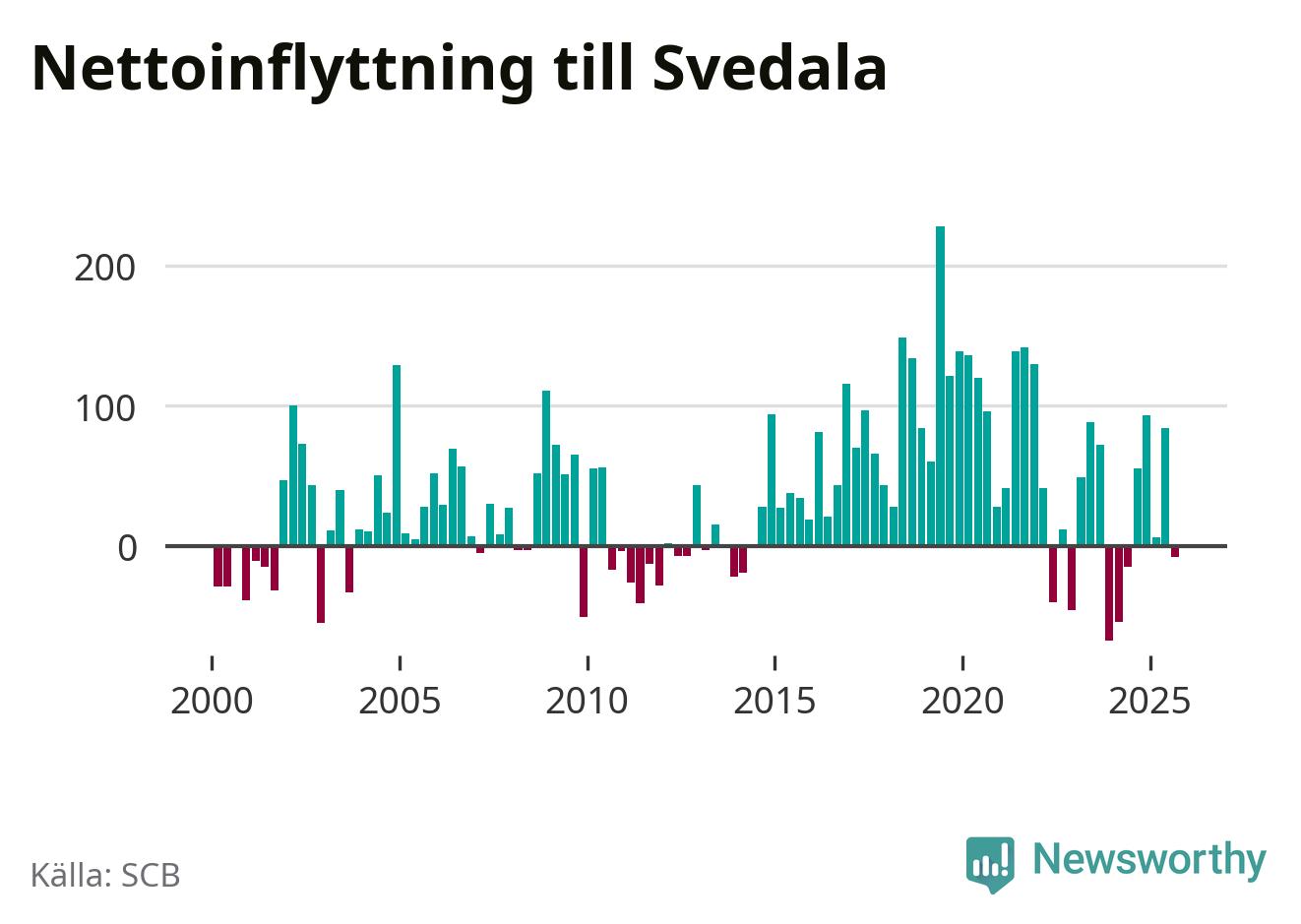 Under tredje kvartalet 2025 flyttade 344 personer till kommunen medan 352 personer flyttade därifrån. Det är historiskt sett en stor utflyttning under ett kvartal. Skillnaden mellan antalet in- och utflyttade är så liten att den lika gärna kan bero på SCB:s slumpmässiga brus. Sedan seklets början har Svedala haft ett positivt flyttnetto under nästan alla kvartal.