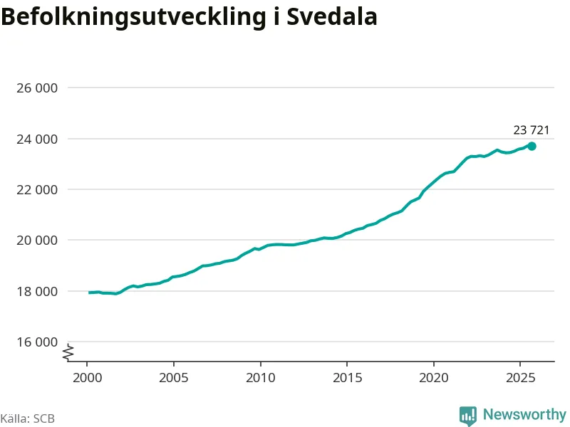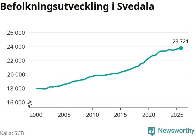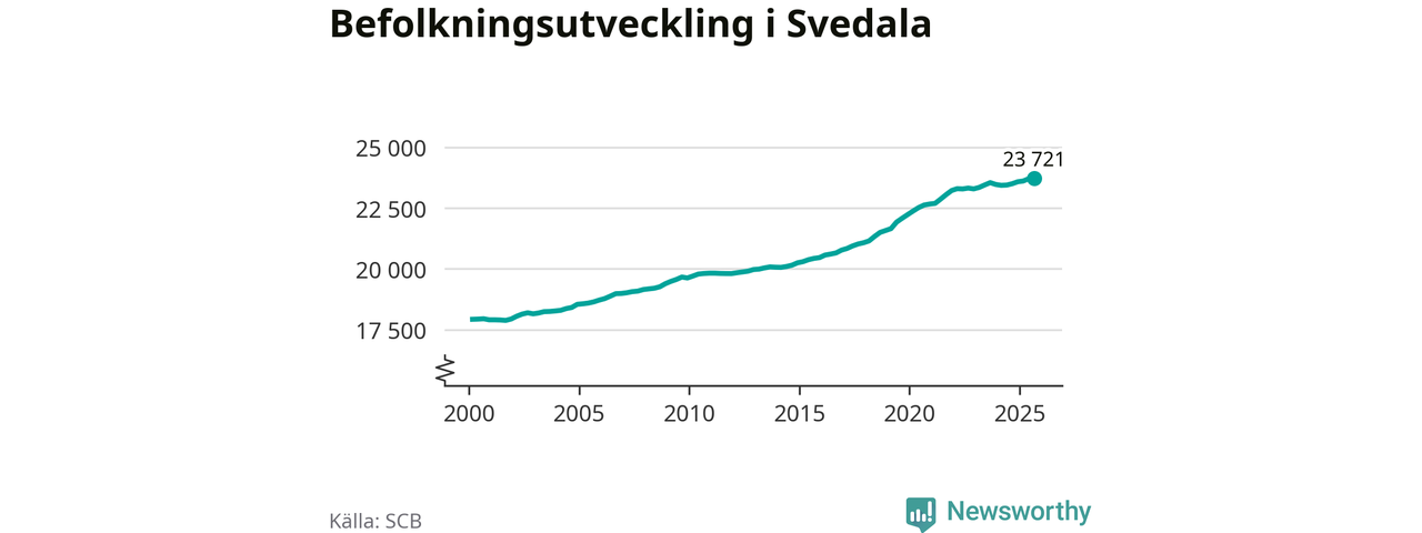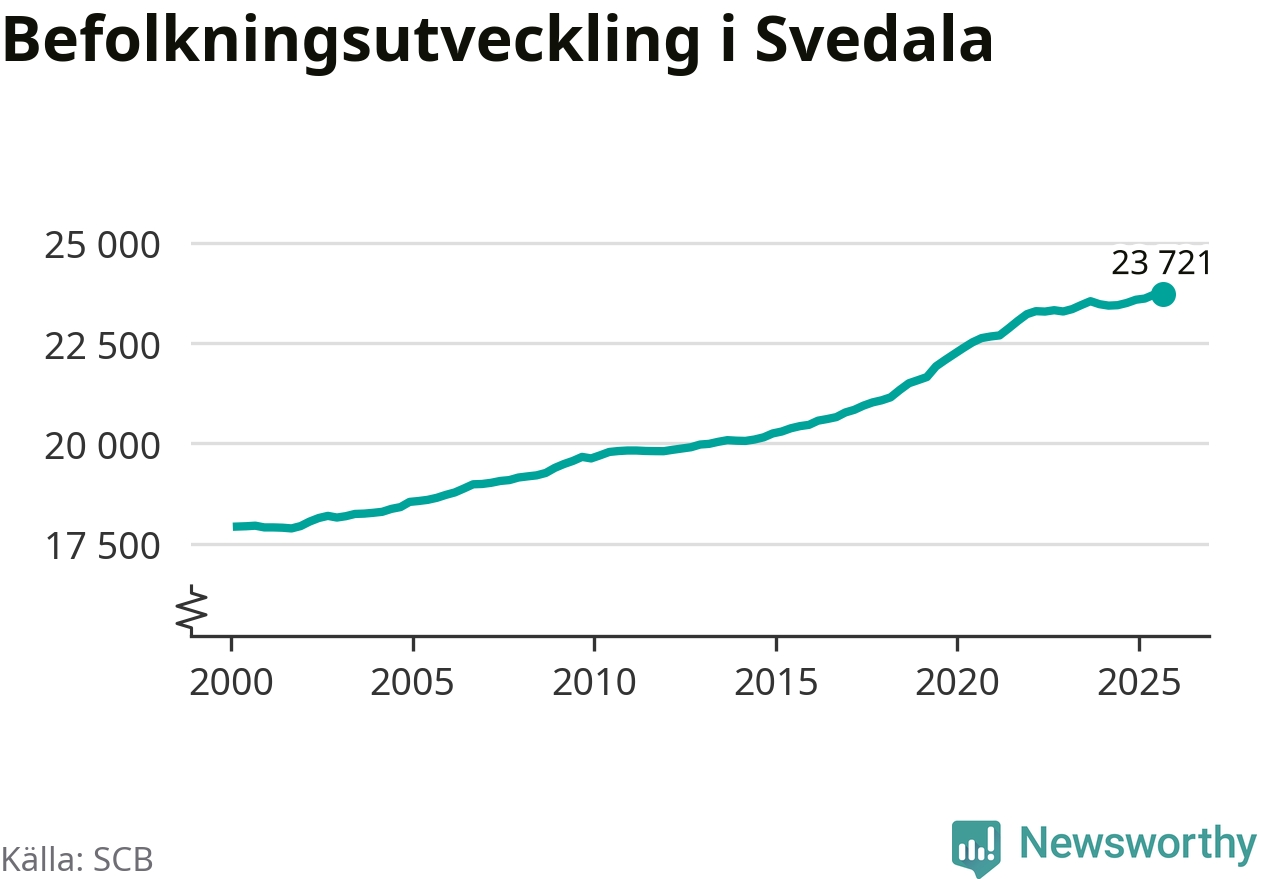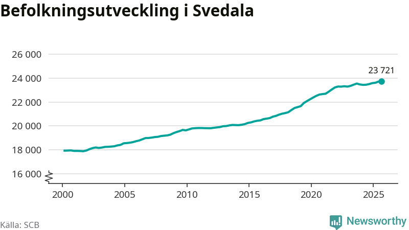 Jämfört med för ett år sedan har befolkningen i Svedala ökat med 220 personer – vilket motsvarar en ökning på 0,9 procent. Sedan millennieskiftet har folkmängden ökat med runt 5 800 personer, eller 32 procent.
