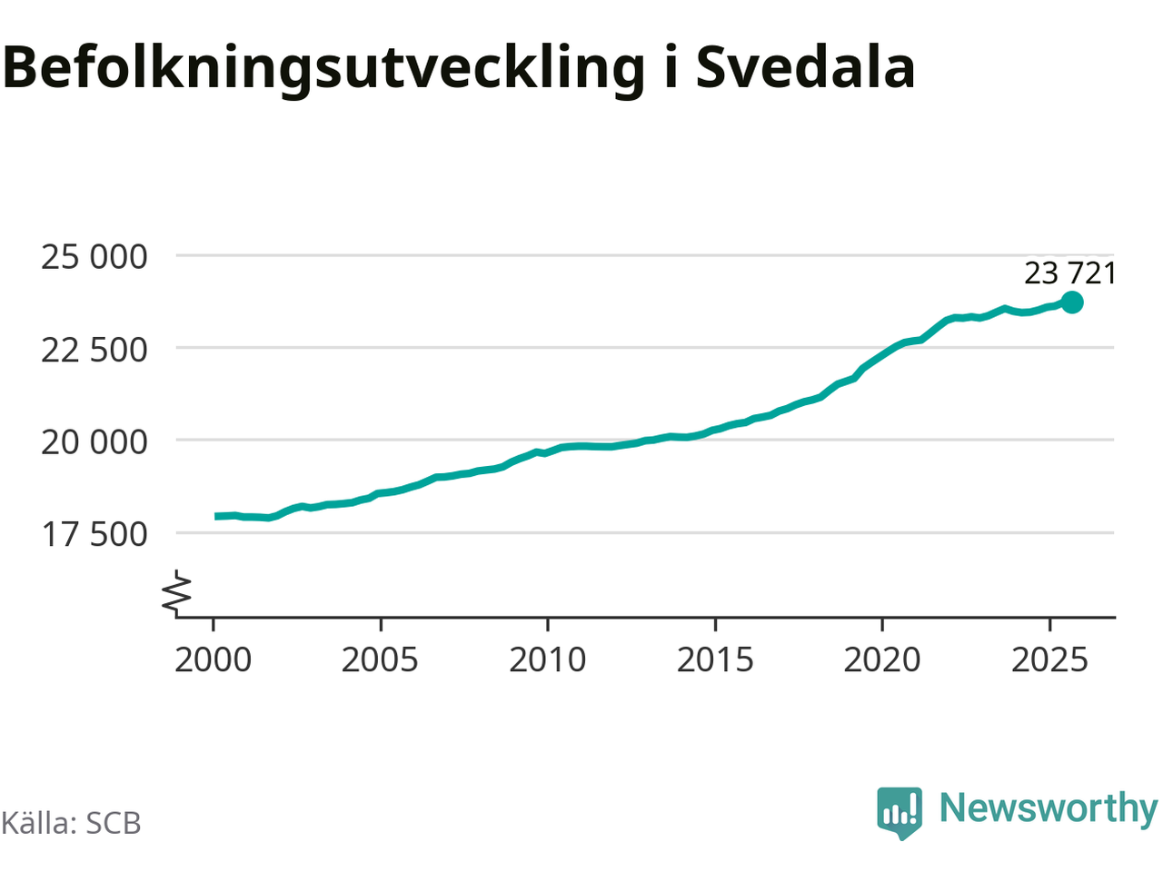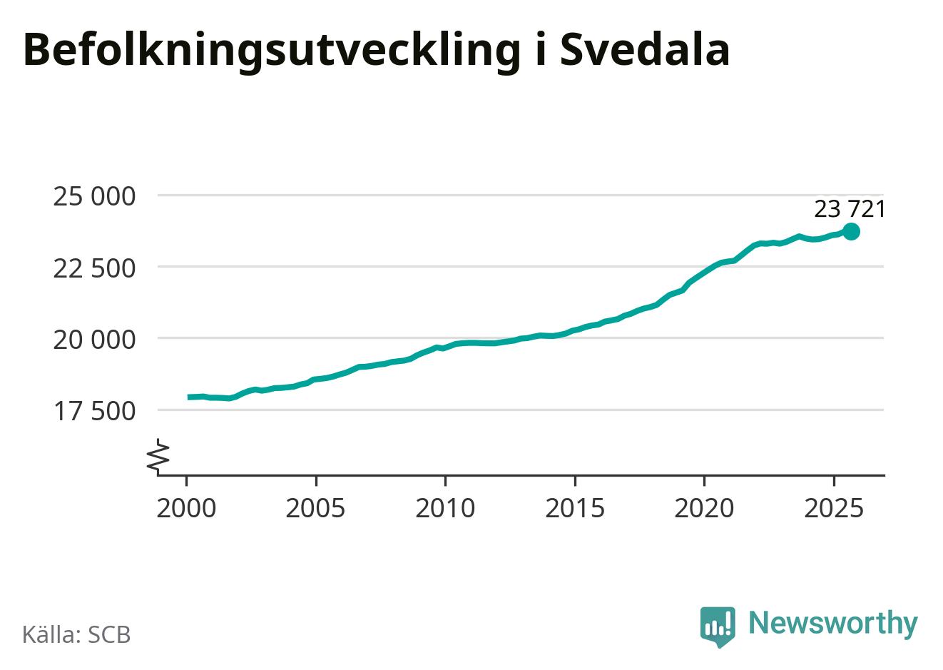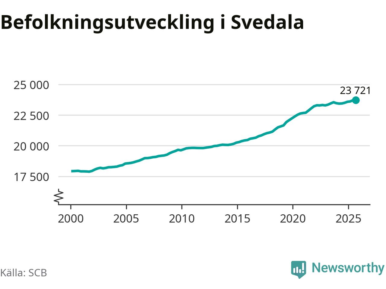 Jämfört med för ett år sedan har befolkningen i Svedala ökat med 220 personer – vilket motsvarar en ökning på 0,9 procent. Sedan millennieskiftet har folkmängden ökat med runt 5 800 personer, eller 32 procent.