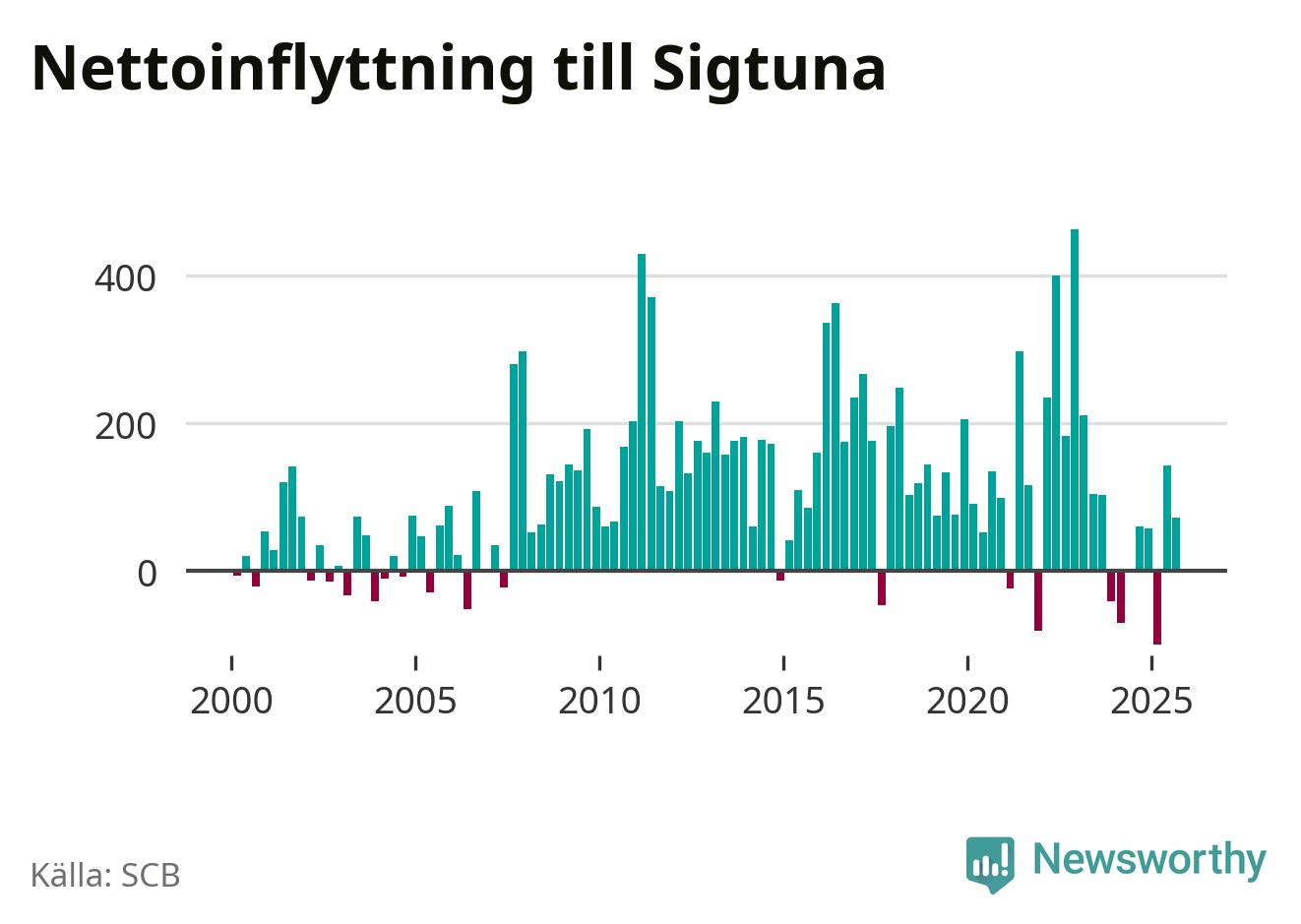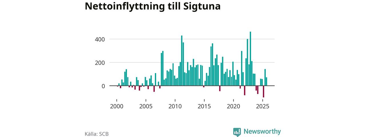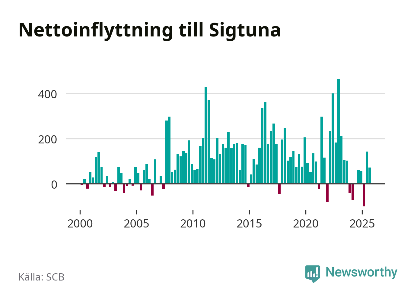 Under tredje kvartalet 2025 flyttade 1 323 personer till kommunen medan 1 251 personer flyttade därifrån. Det är historiskt sett en stor inflyttning under ett kvartal – men samtidigt var utflyttningen relativt stor. Sedan seklets början har Sigtuna haft ett positivt flyttnetto under nästan alla kvartal, inklusive det senaste kvartalet.