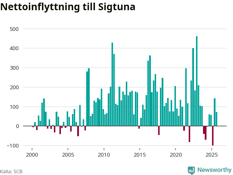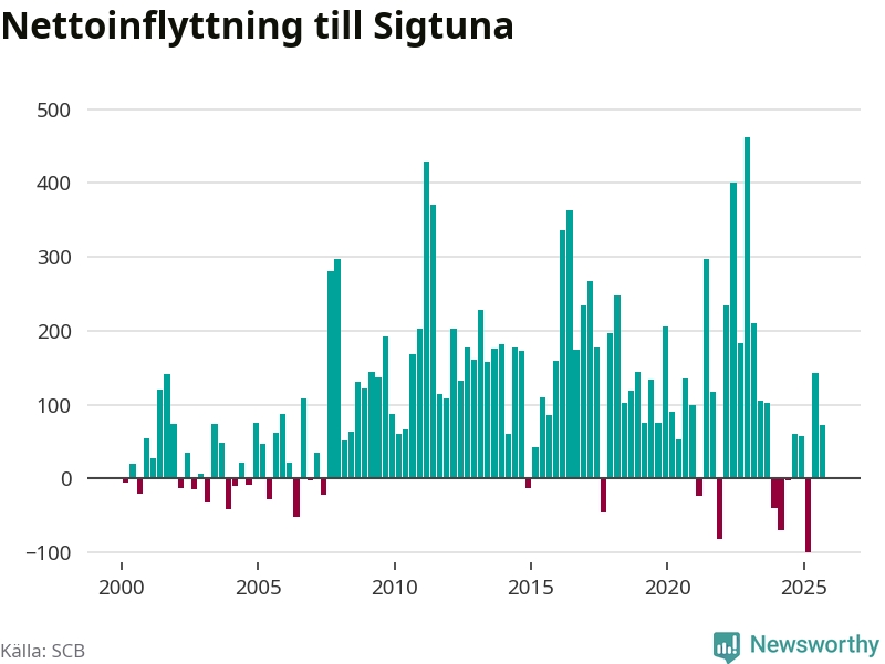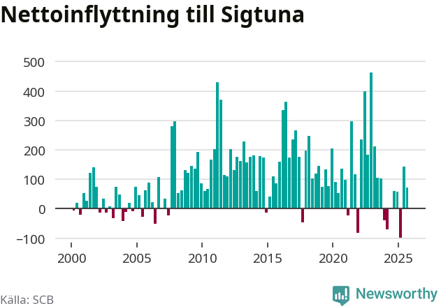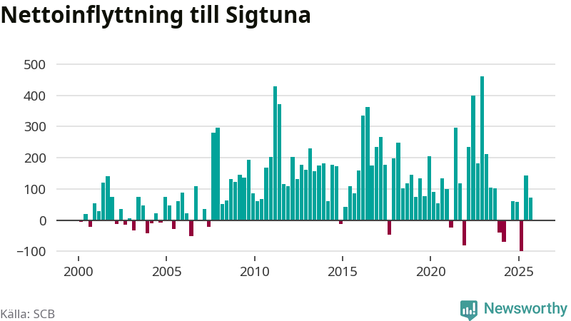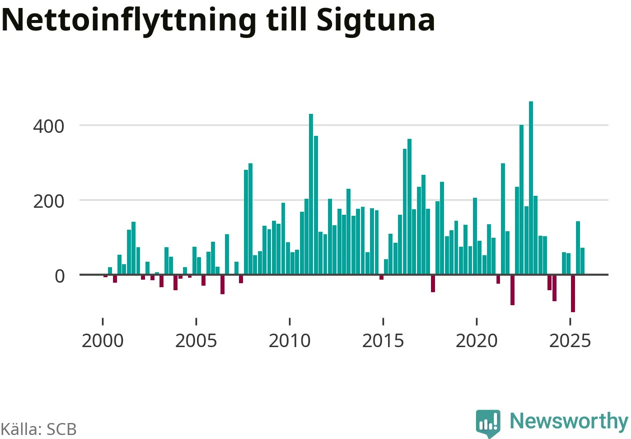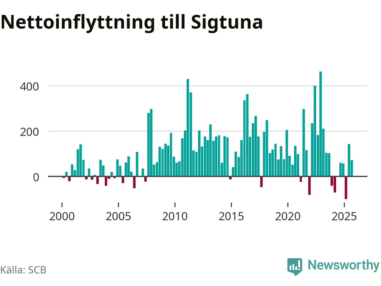 Under tredje kvartalet 2025 flyttade 1 323 personer till kommunen medan 1 251 personer flyttade därifrån. Det är historiskt sett en stor inflyttning under ett kvartal – men samtidigt var utflyttningen relativt stor. Sedan seklets början har Sigtuna haft ett positivt flyttnetto under nästan alla kvartal, inklusive det senaste kvartalet.