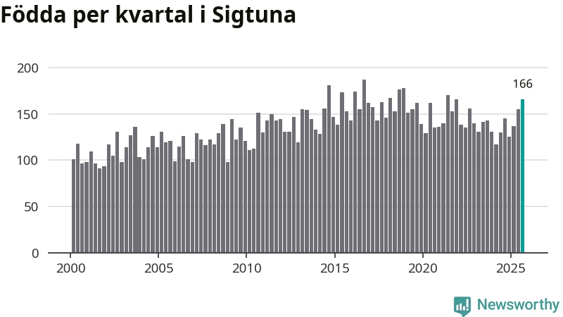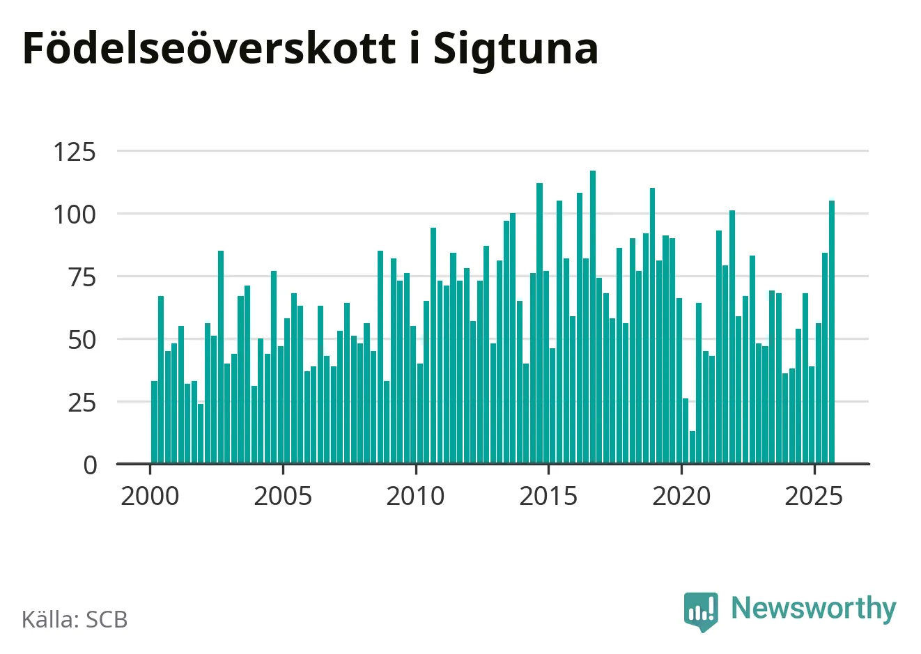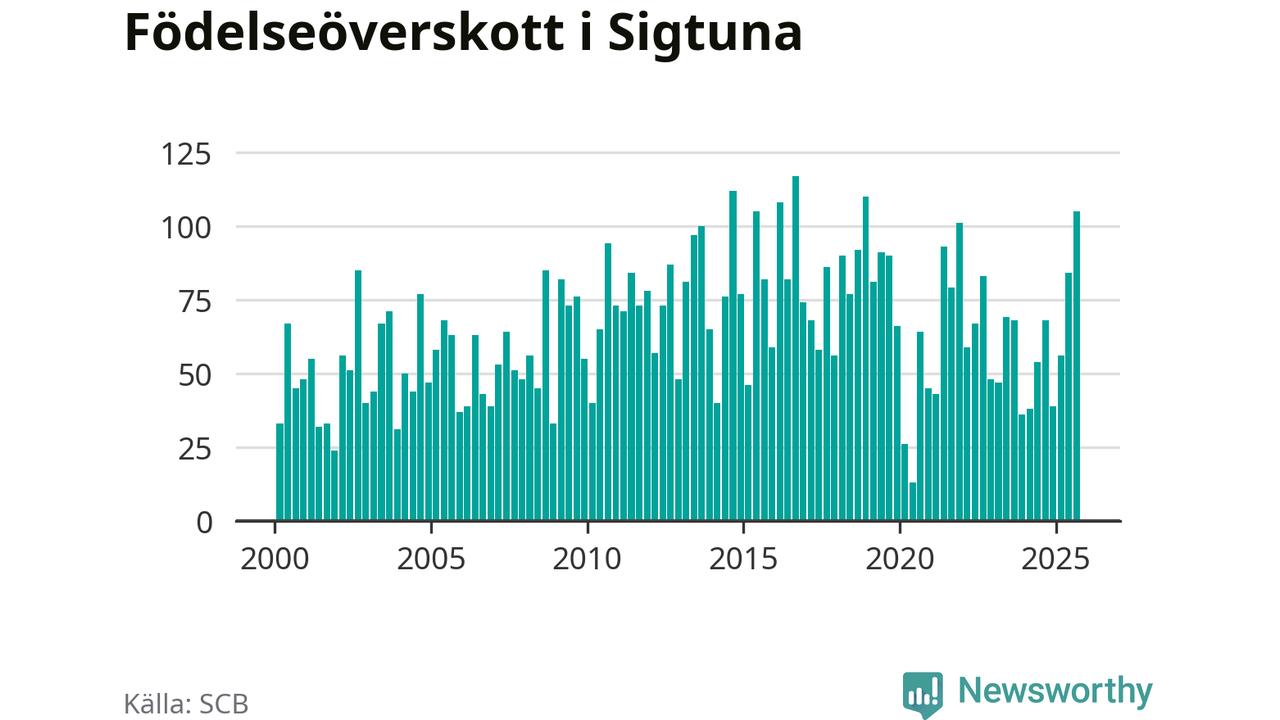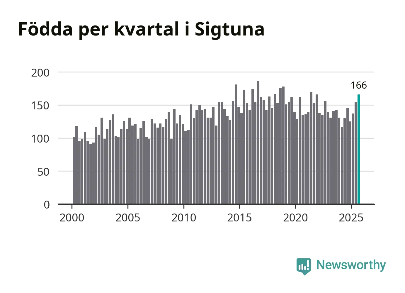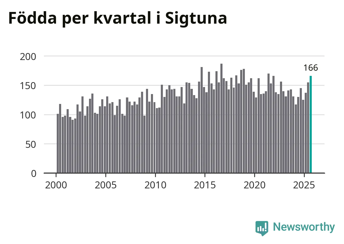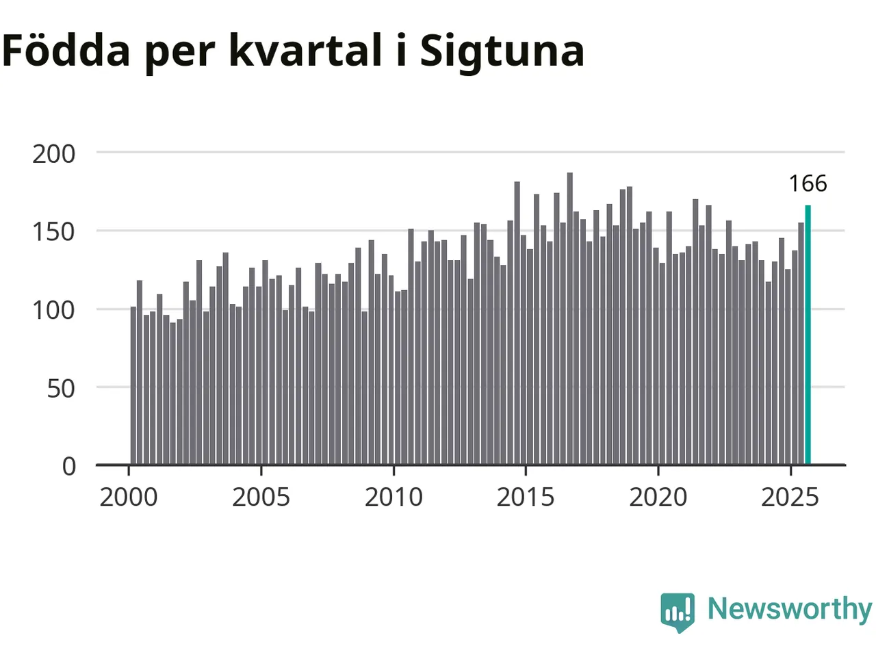 Enligt SCB:s siffror föddes 166 barn i Sigtuna under det senaste kvartalet, vilket är en relativt hög siffra historiskt sett. Samtidigt avled 61 personer. Sigtuna hade alltså ett positivt födelsenetto, vilket kommunen historiskt sett i princip alltid har haft.