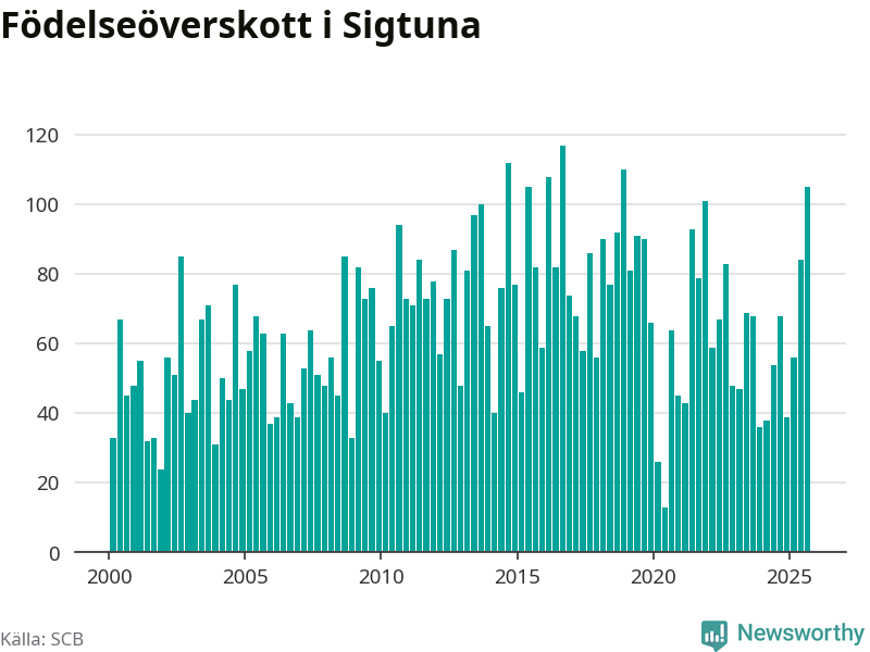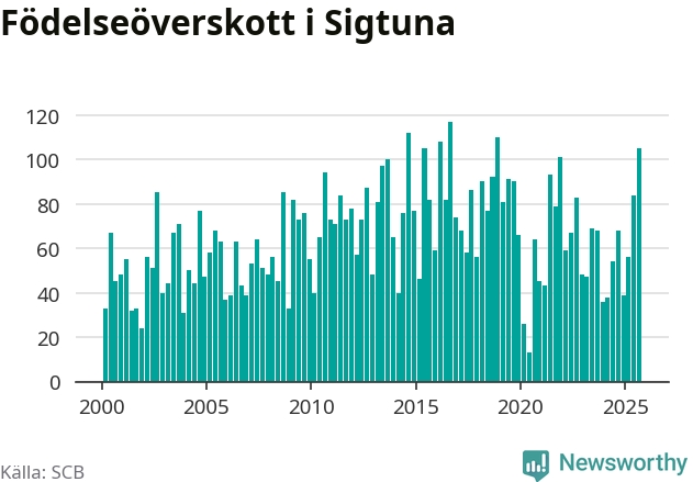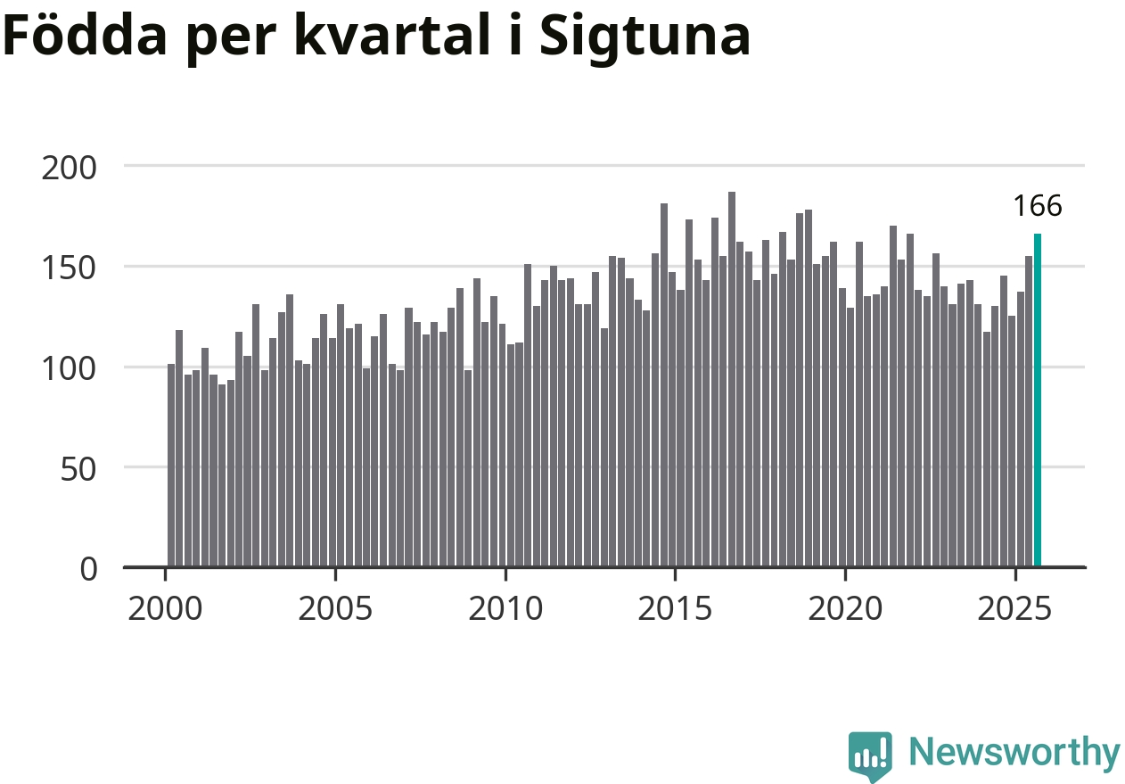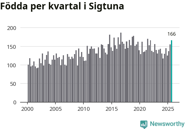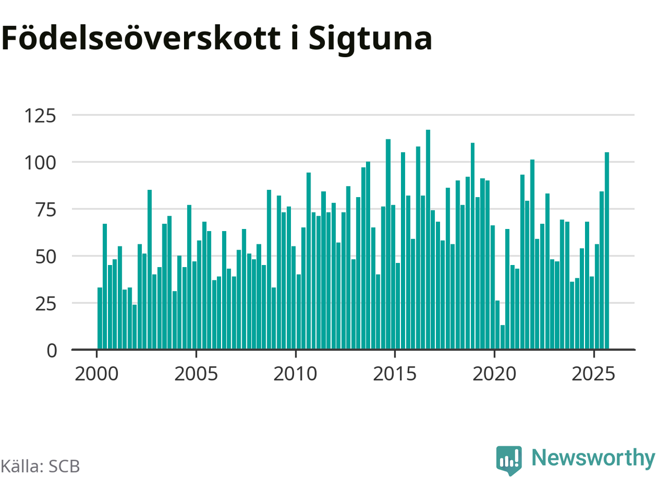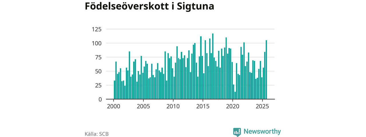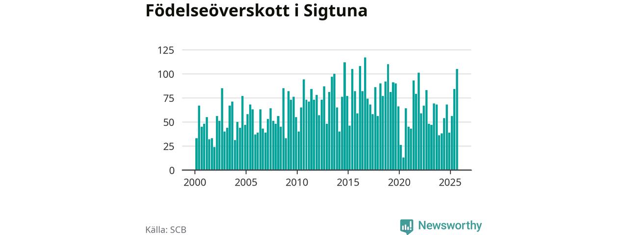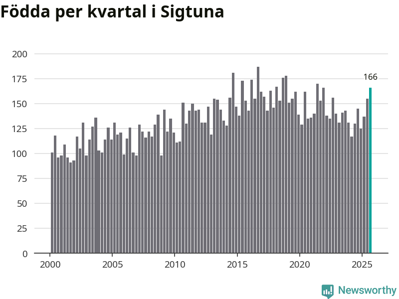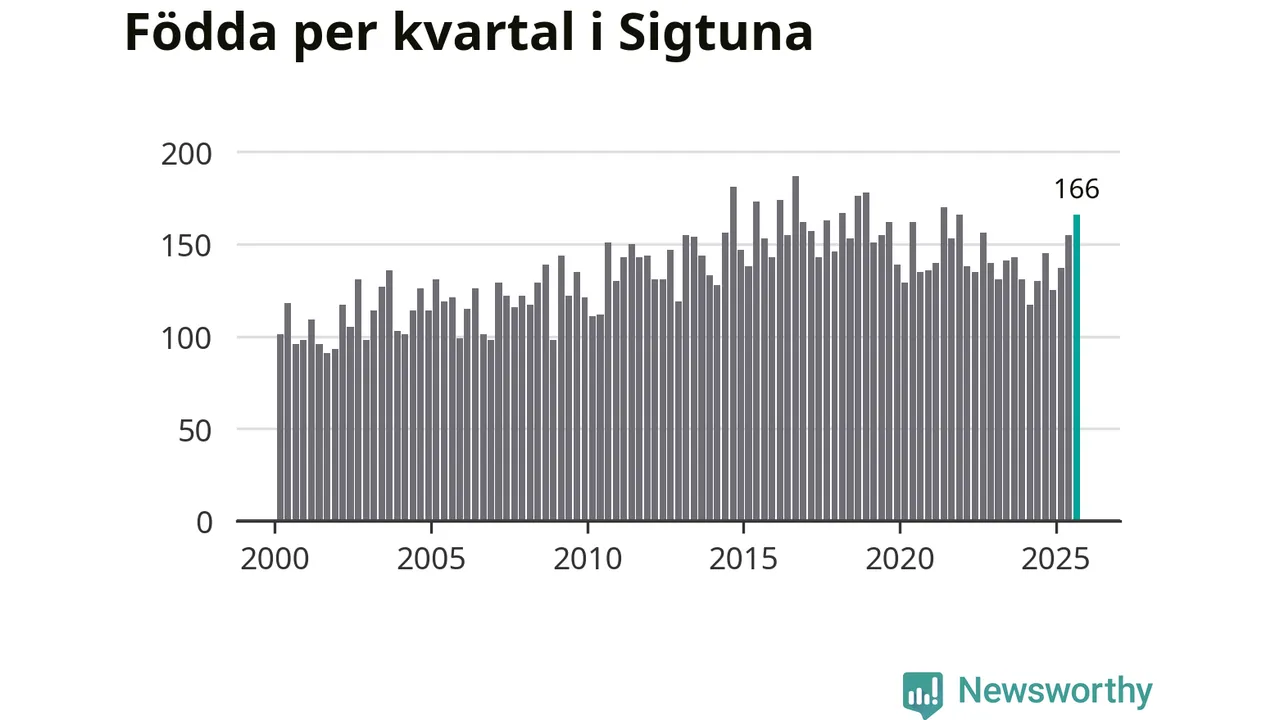 Enligt SCB:s siffror föddes 166 barn i Sigtuna under det senaste kvartalet, vilket är en relativt hög siffra historiskt sett. Samtidigt avled 61 personer. Sigtuna hade alltså ett positivt födelsenetto, vilket kommunen historiskt sett i princip alltid har haft.