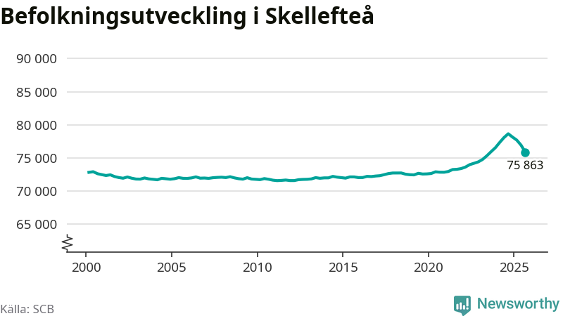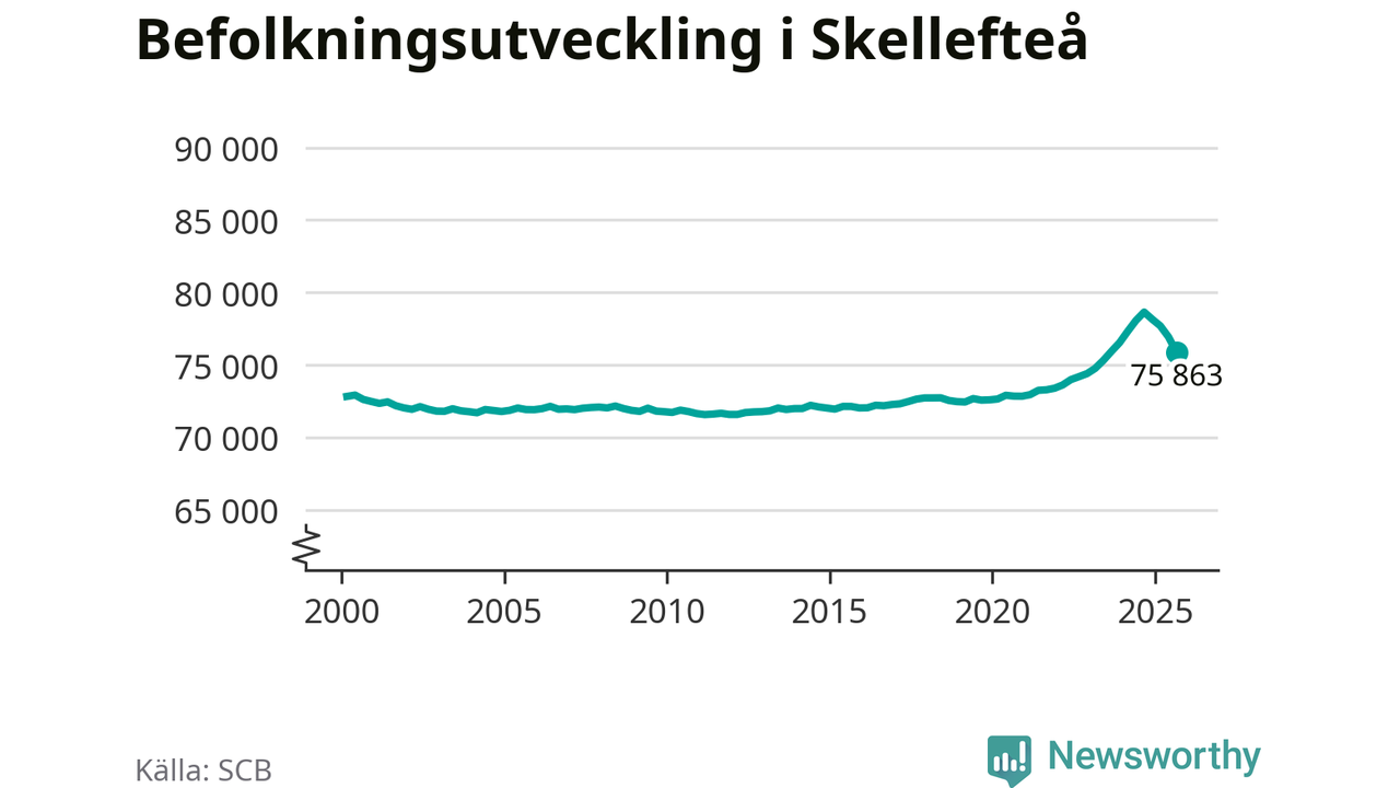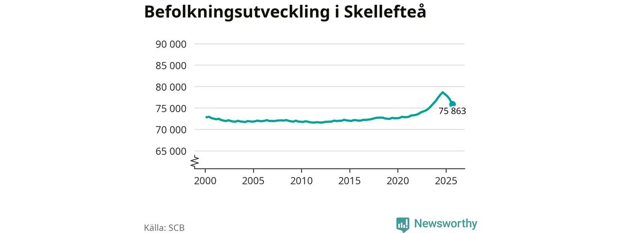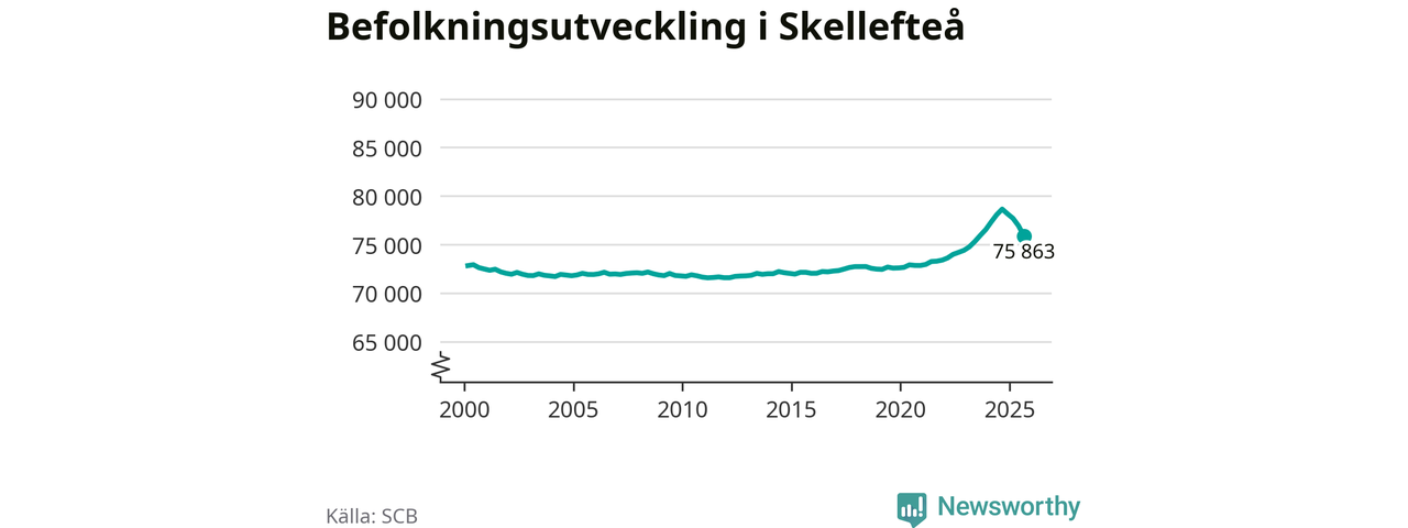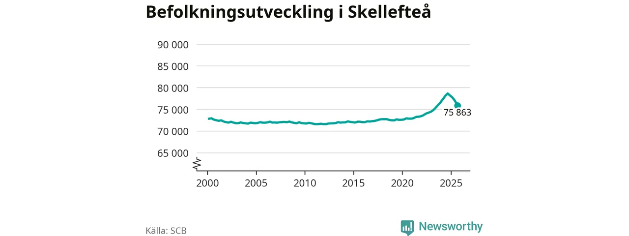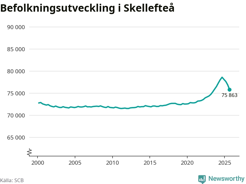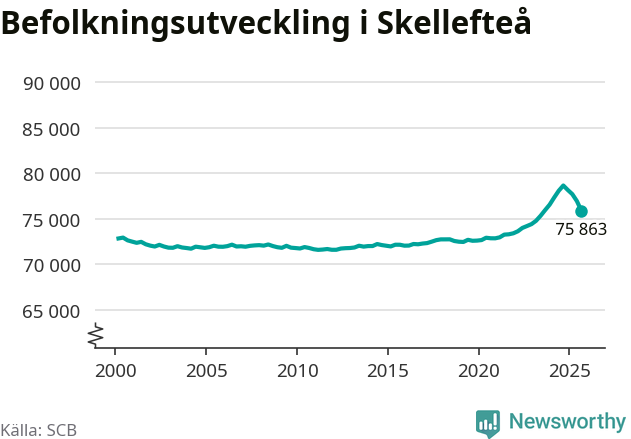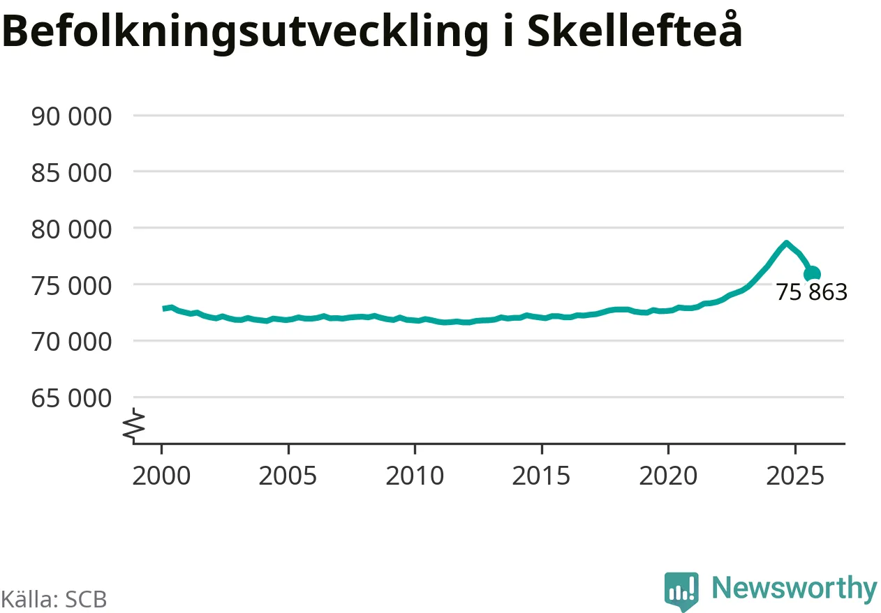 Jämfört med för ett år sedan har befolkningen i Skellefteå minskat med ungefär 2 780 personer – vilket motsvarar en nedgång på 3,5 procent. Sedan millennieskiftet har folkmängden ökat med runt 3 040 personer, eller 4 procent.