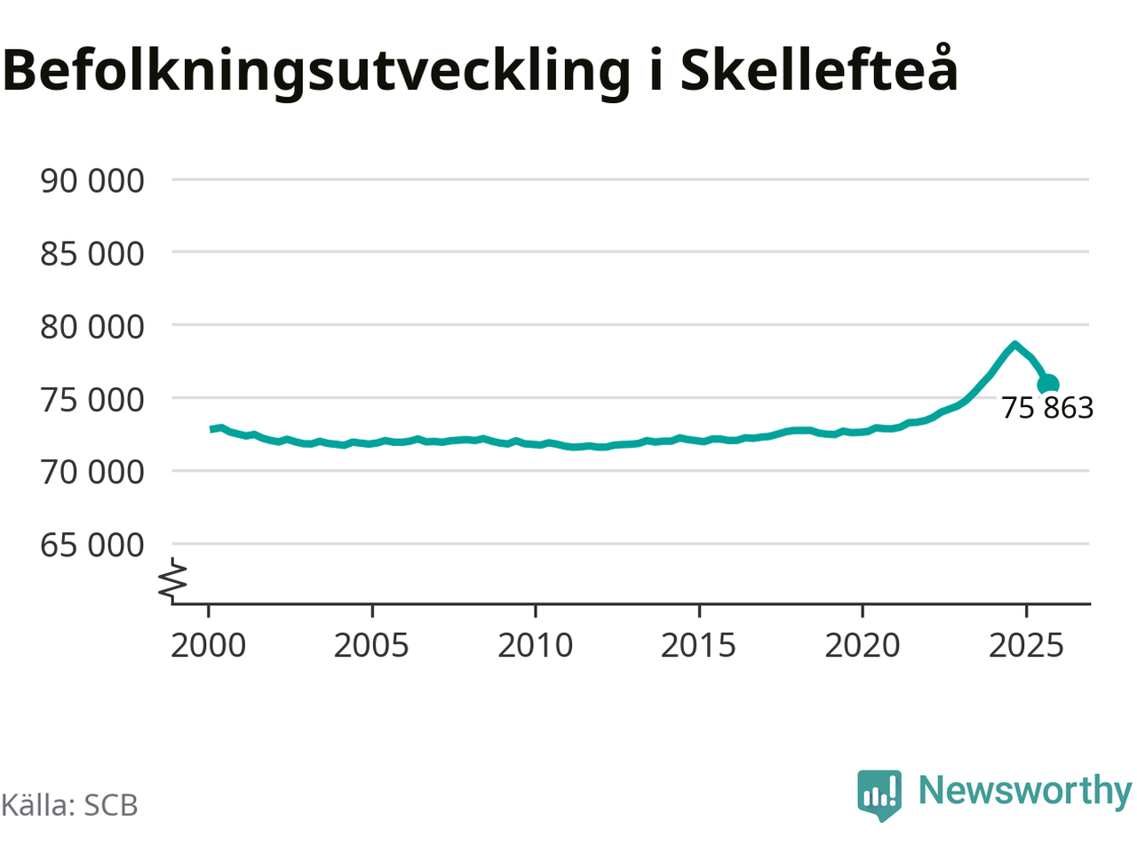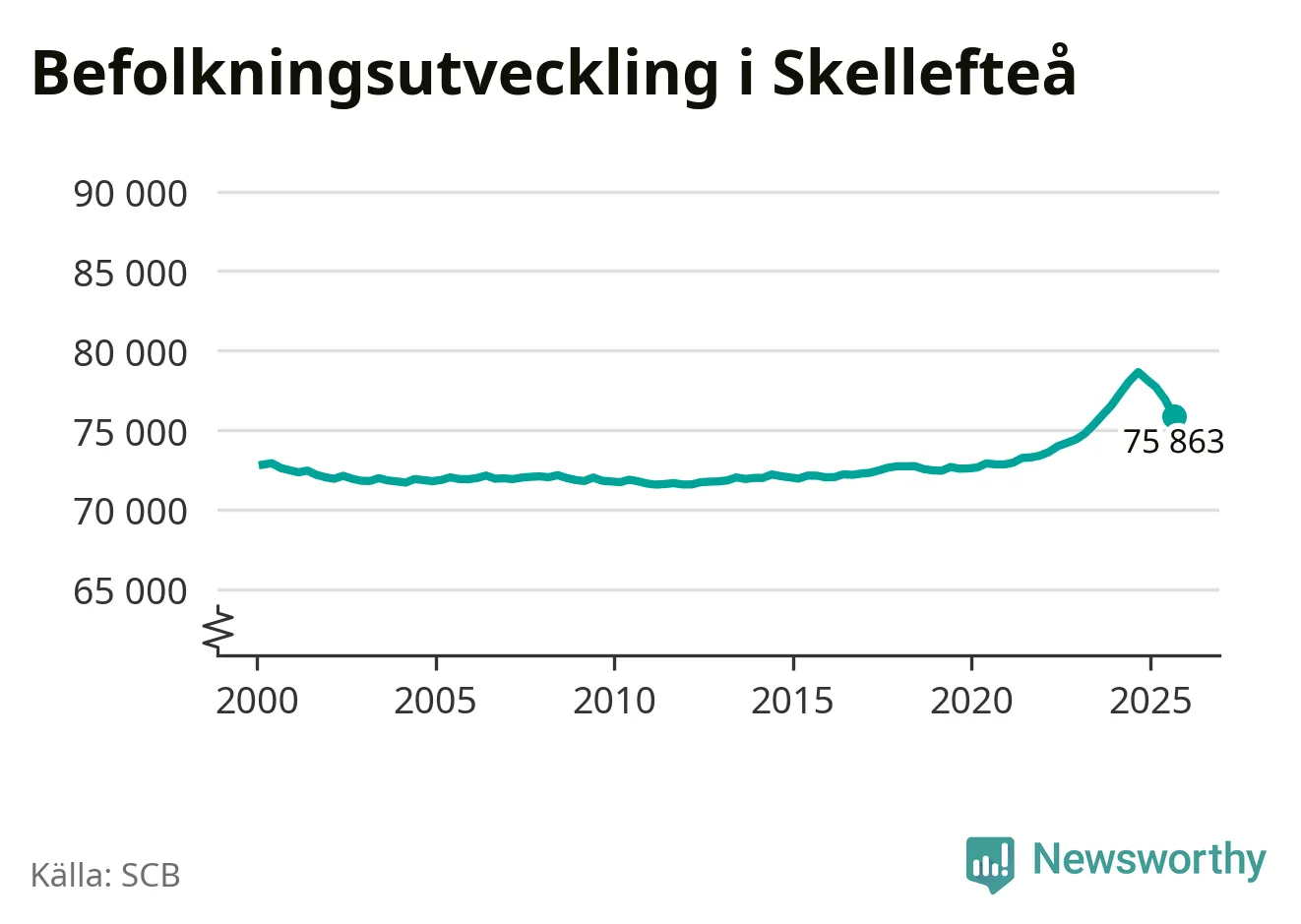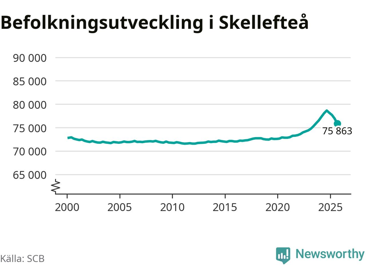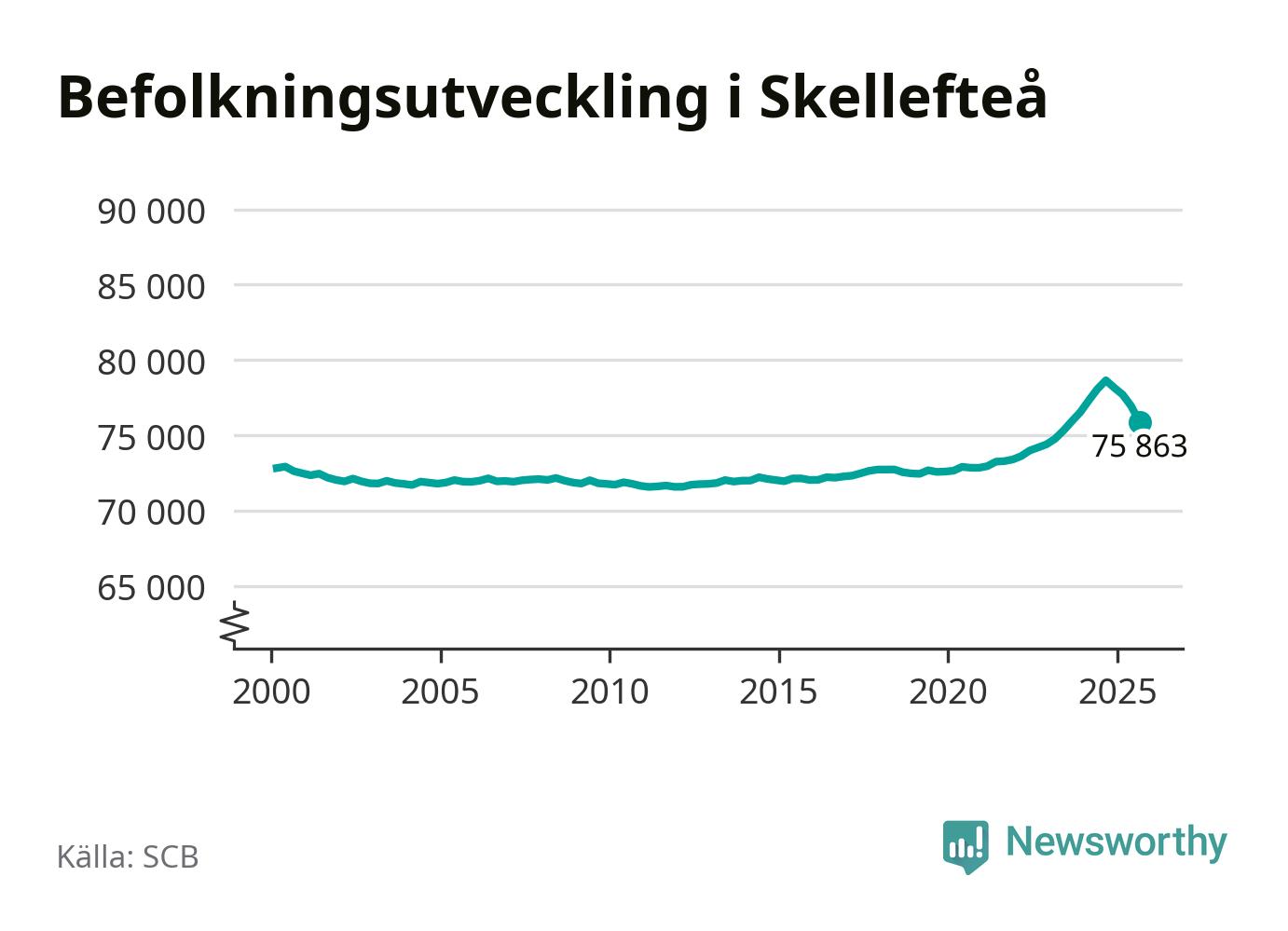 Jämfört med för ett år sedan har befolkningen i Skellefteå minskat med ungefär 2 780 personer – vilket motsvarar en nedgång på 3,5 procent. Sedan millennieskiftet har folkmängden ökat med runt 3 040 personer, eller 4 procent.