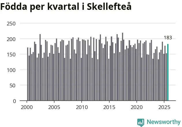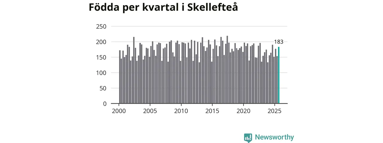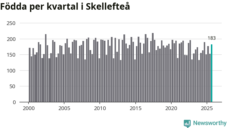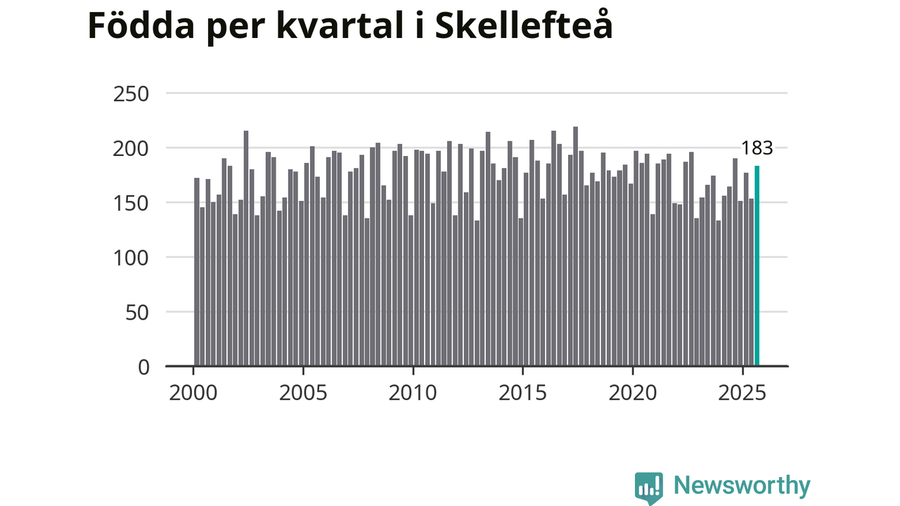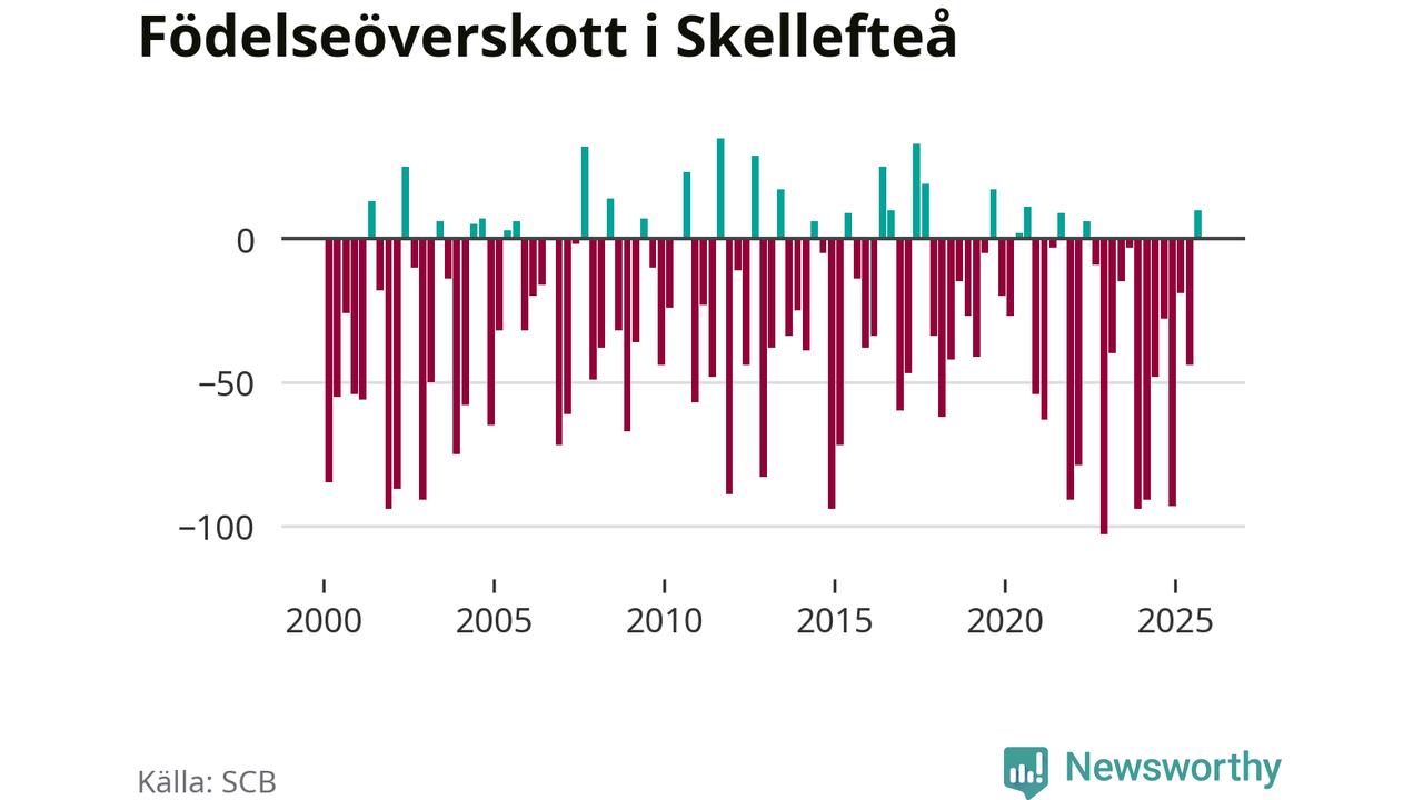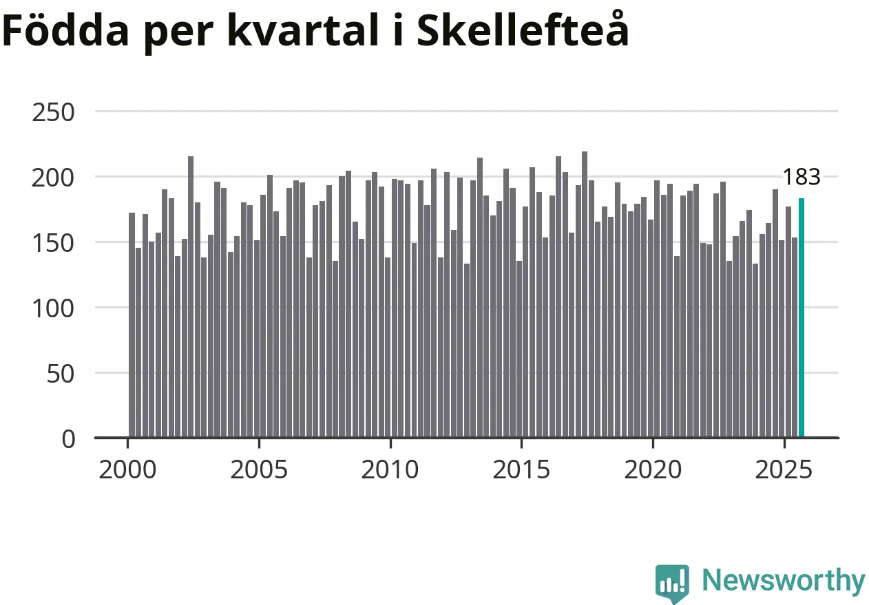 Enligt SCB:s siffror föddes 183 barn i Skellefteå under det senaste kvartalet. Samtidigt avled relativt få – 173 personer. Skillnaden mellan antal födda och döda är så liten att det inte går att säga om det beror på något annat än SCB:s röjandeskydd. Kommunen har oftast haft negativt födelsenetto tidigare.