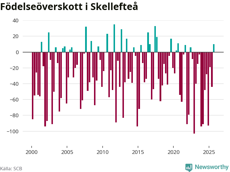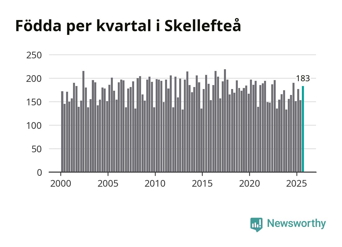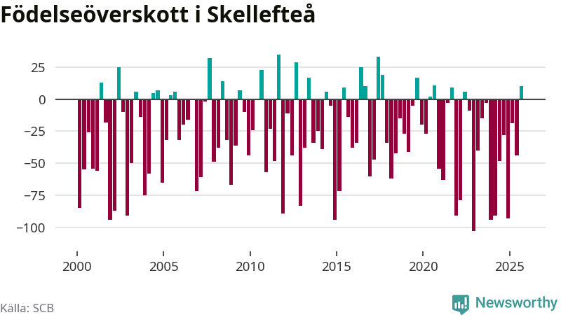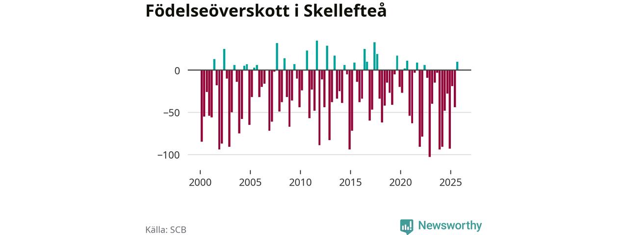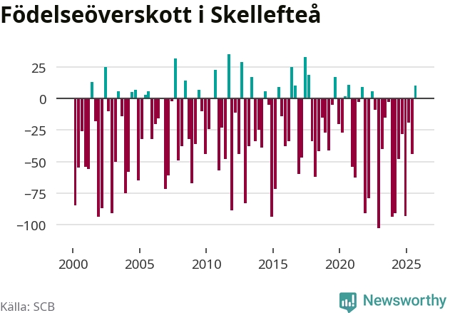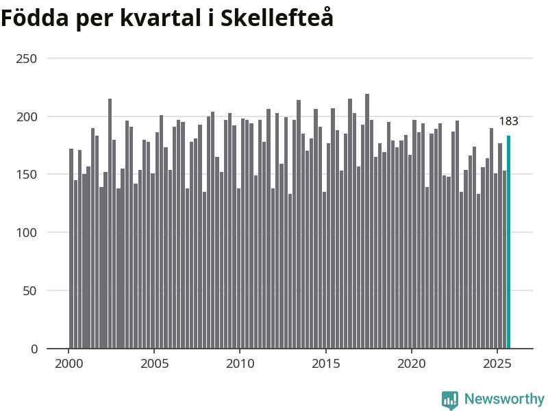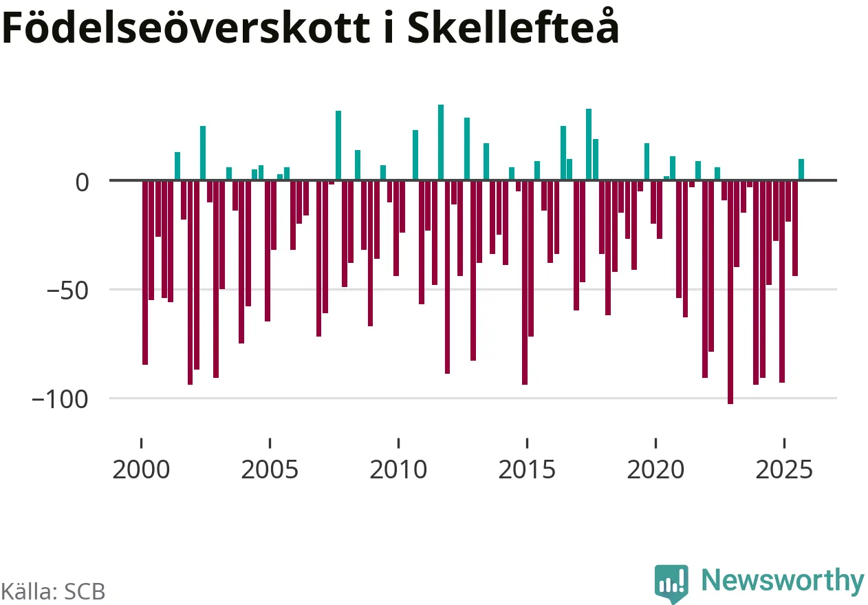 Enligt SCB:s siffror föddes 183 barn i Skellefteå under det senaste kvartalet. Samtidigt avled relativt få – 173 personer. Skillnaden mellan antal födda och döda är så liten att det inte går att säga om det beror på något annat än SCB:s röjandeskydd. Kommunen har oftast haft negativt födelsenetto tidigare.