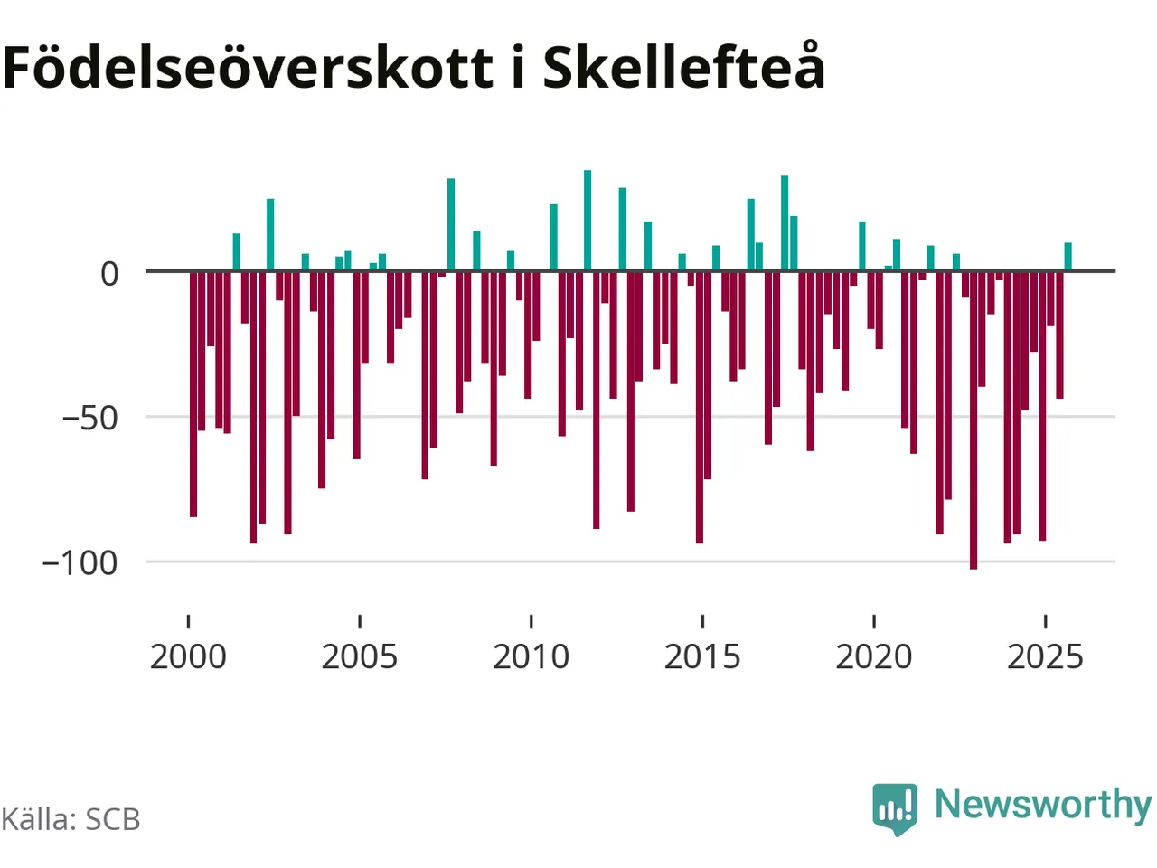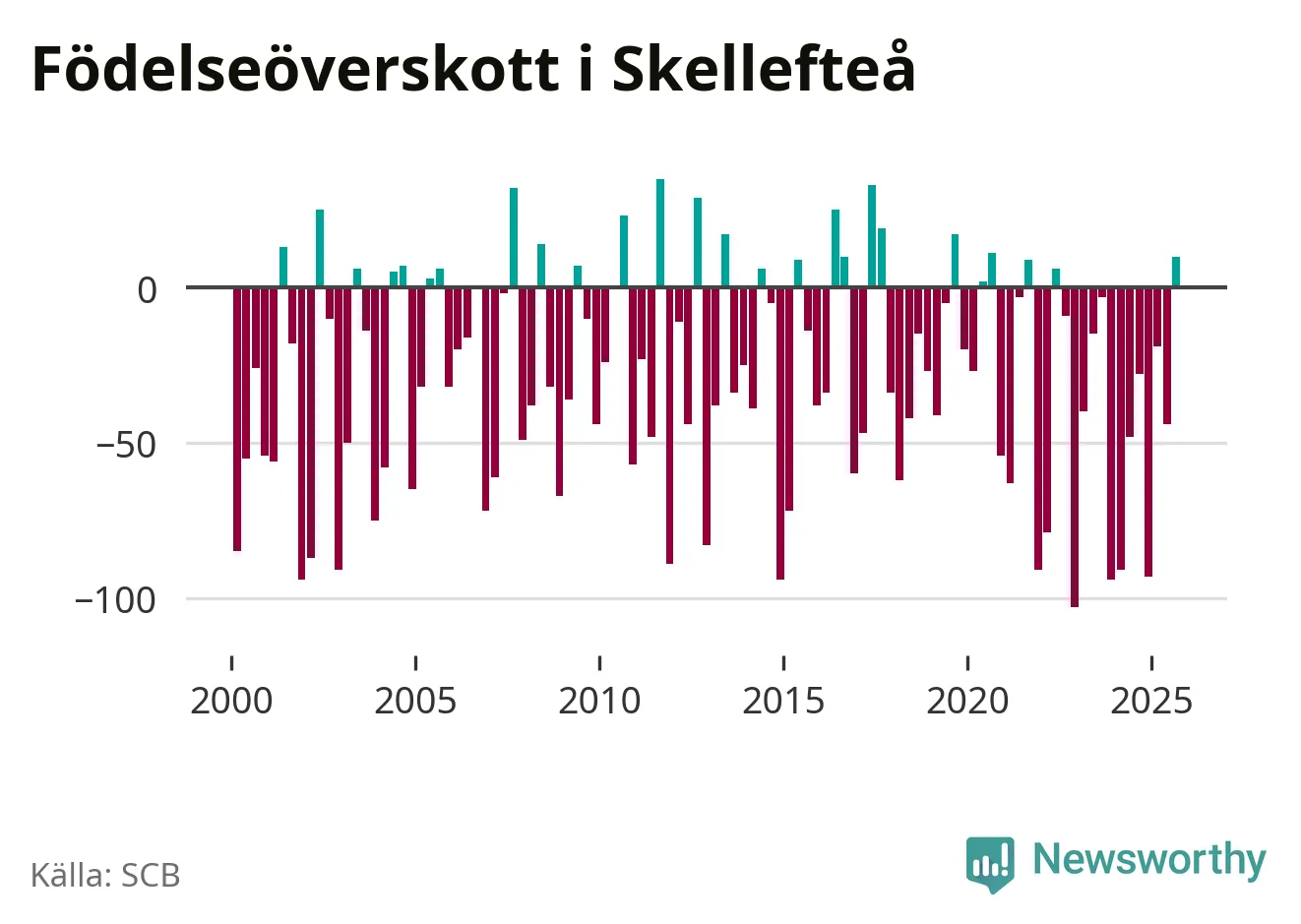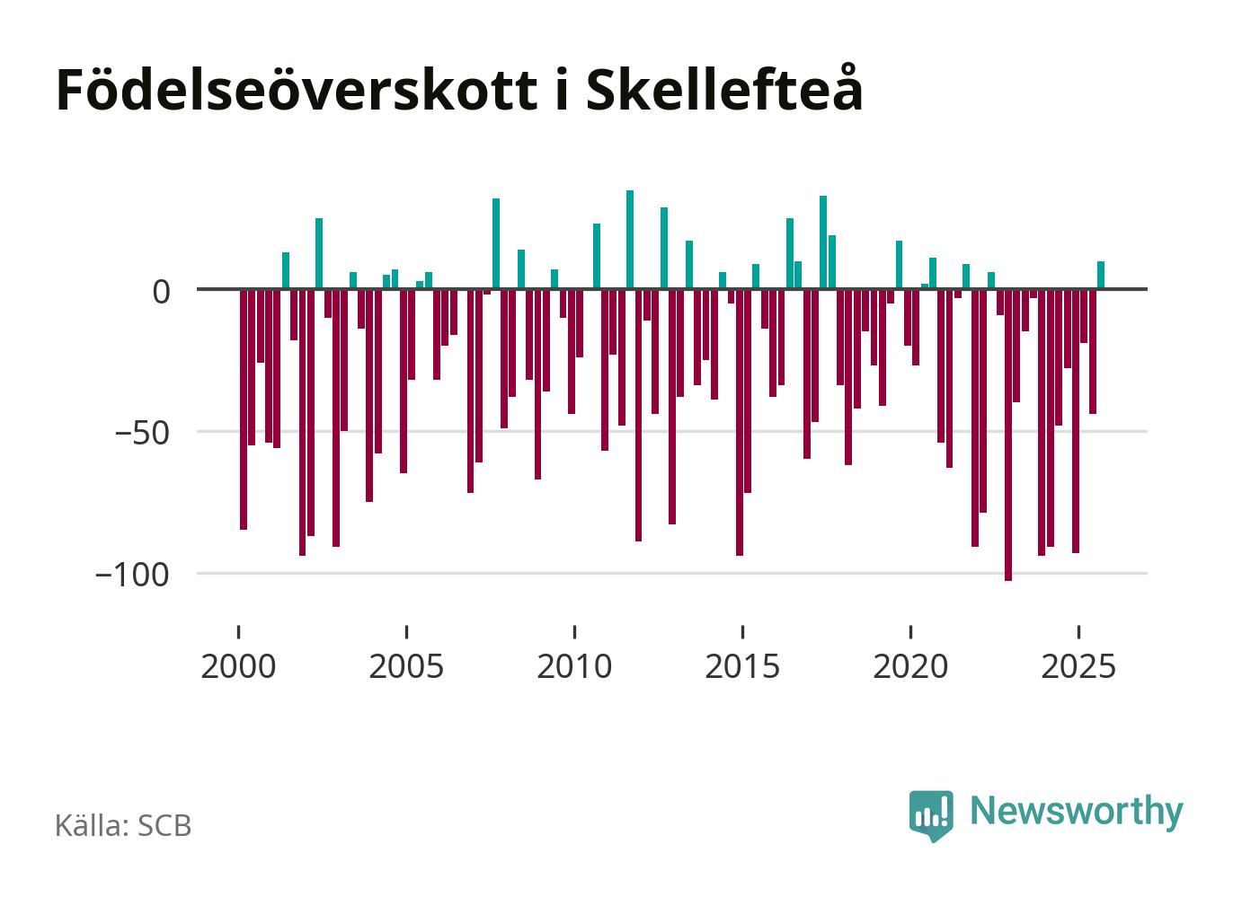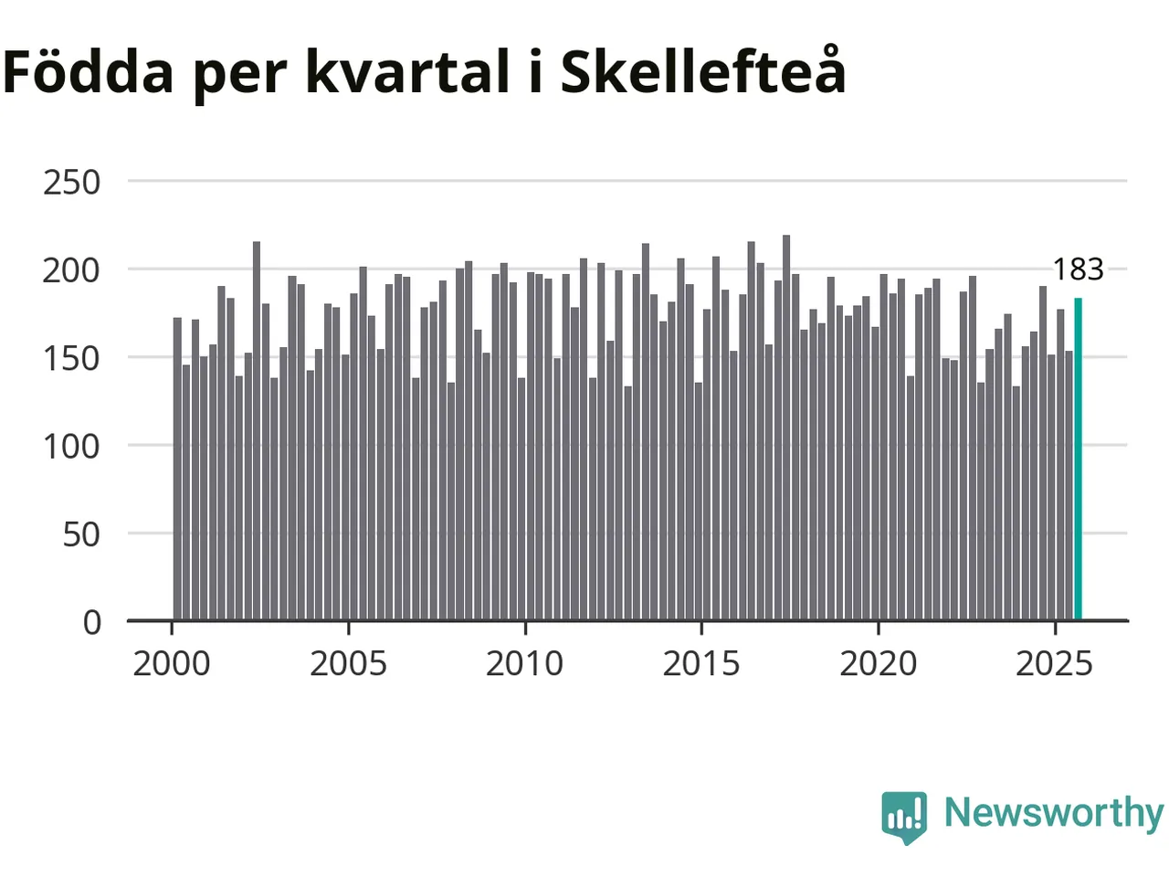 Enligt SCB:s siffror föddes 183 barn i Skellefteå under det senaste kvartalet. Samtidigt avled relativt få – 173 personer. Skillnaden mellan antal födda och döda är så liten att det inte går att säga om det beror på något annat än SCB:s röjandeskydd. Kommunen har oftast haft negativt födelsenetto tidigare.