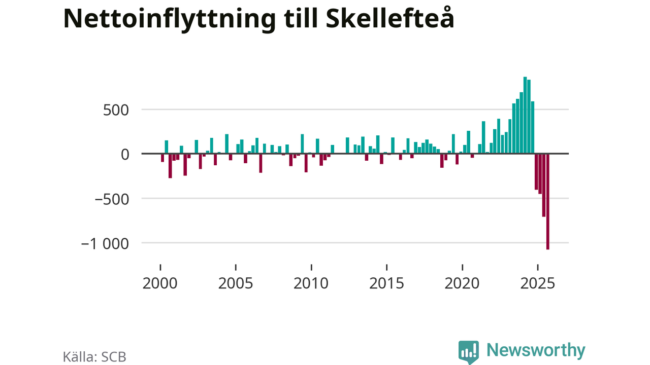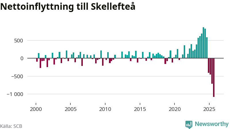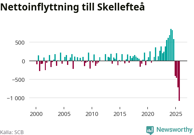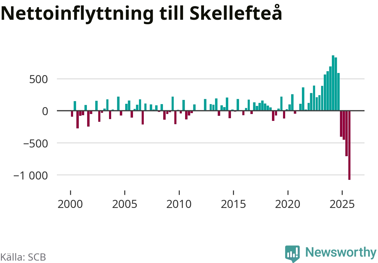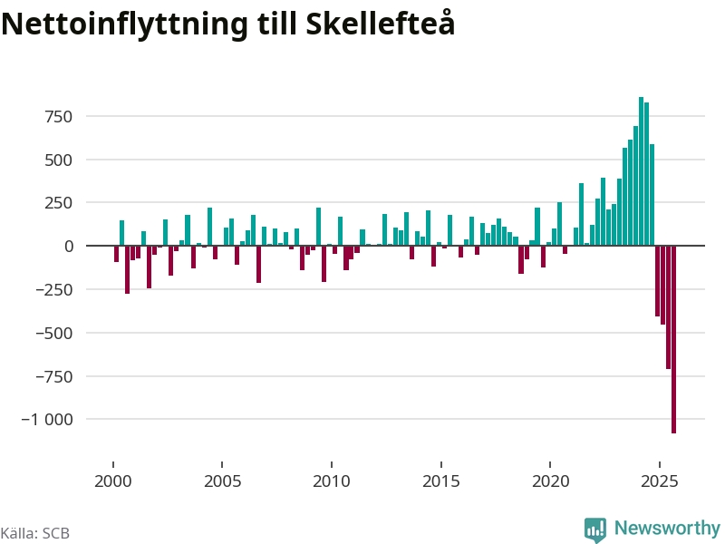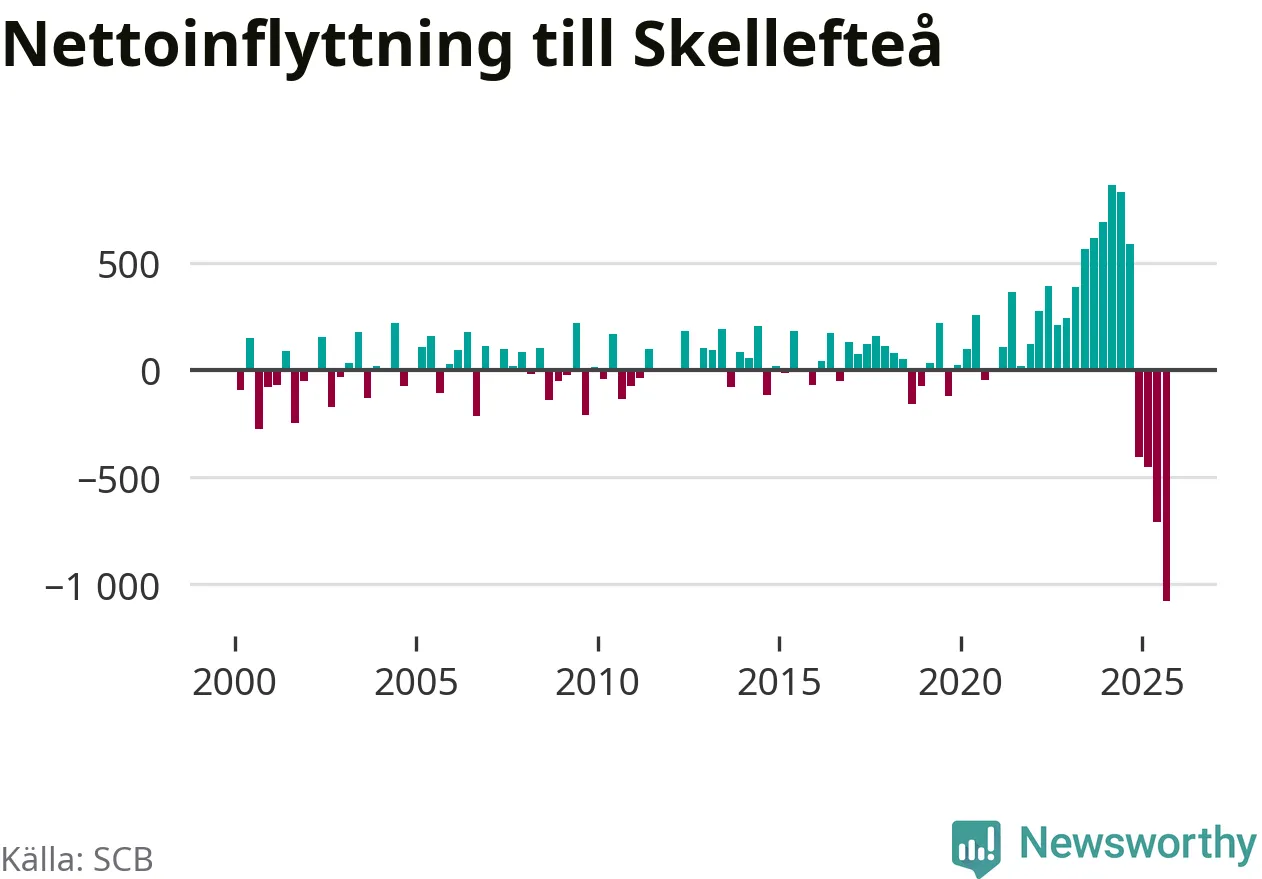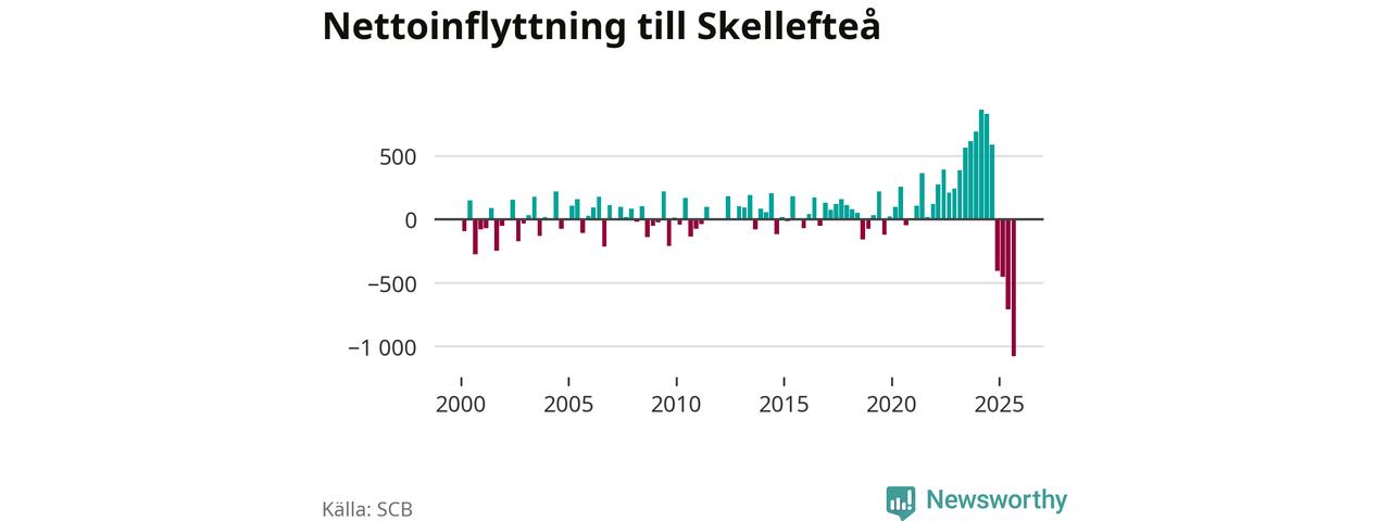 Under tredje kvartalet 2025 flyttade 809 personer till kommunen medan 1 888 personer flyttade därifrån. Så många har inte flyttat från Skellefteå under något kvartal under det här seklet. Det ger den största nettoutflyttningen under ett kvartal sedan åtminstone år 2000. Sedan seklets början har Skellefteå oftast haft ett positivt flyttnetto.