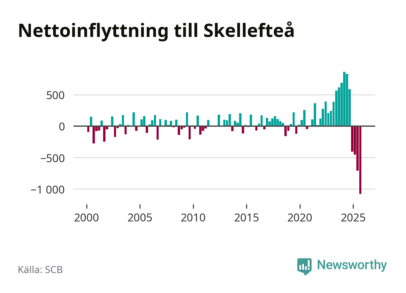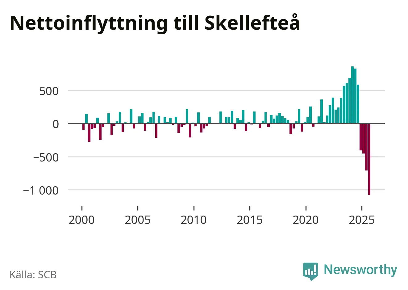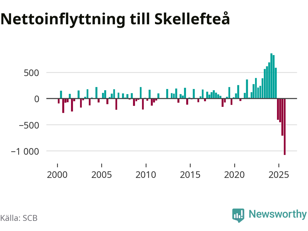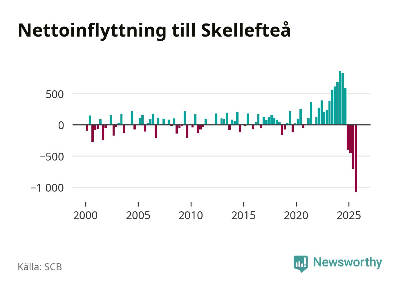 Under tredje kvartalet 2025 flyttade 809 personer till kommunen medan 1 888 personer flyttade därifrån. Så många har inte flyttat från Skellefteå under något kvartal under det här seklet. Det ger den största nettoutflyttningen under ett kvartal sedan åtminstone år 2000. Sedan seklets början har Skellefteå oftast haft ett positivt flyttnetto.