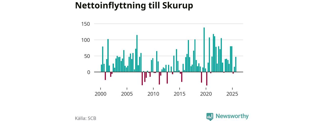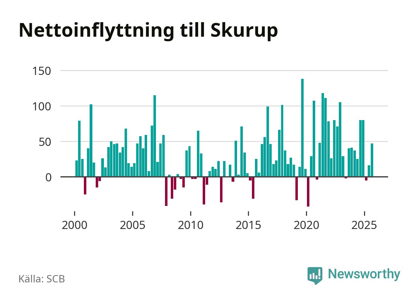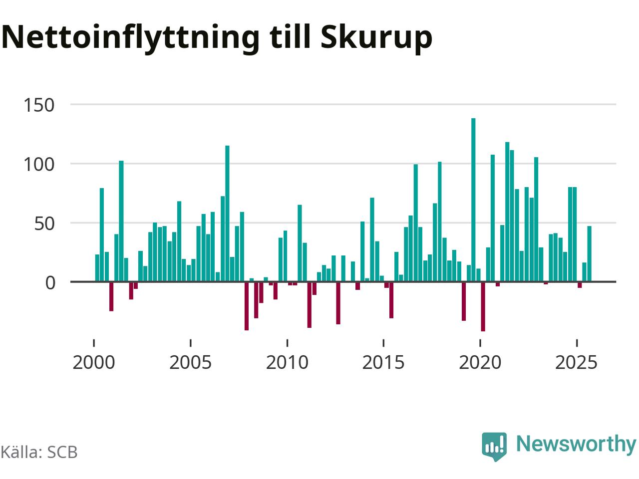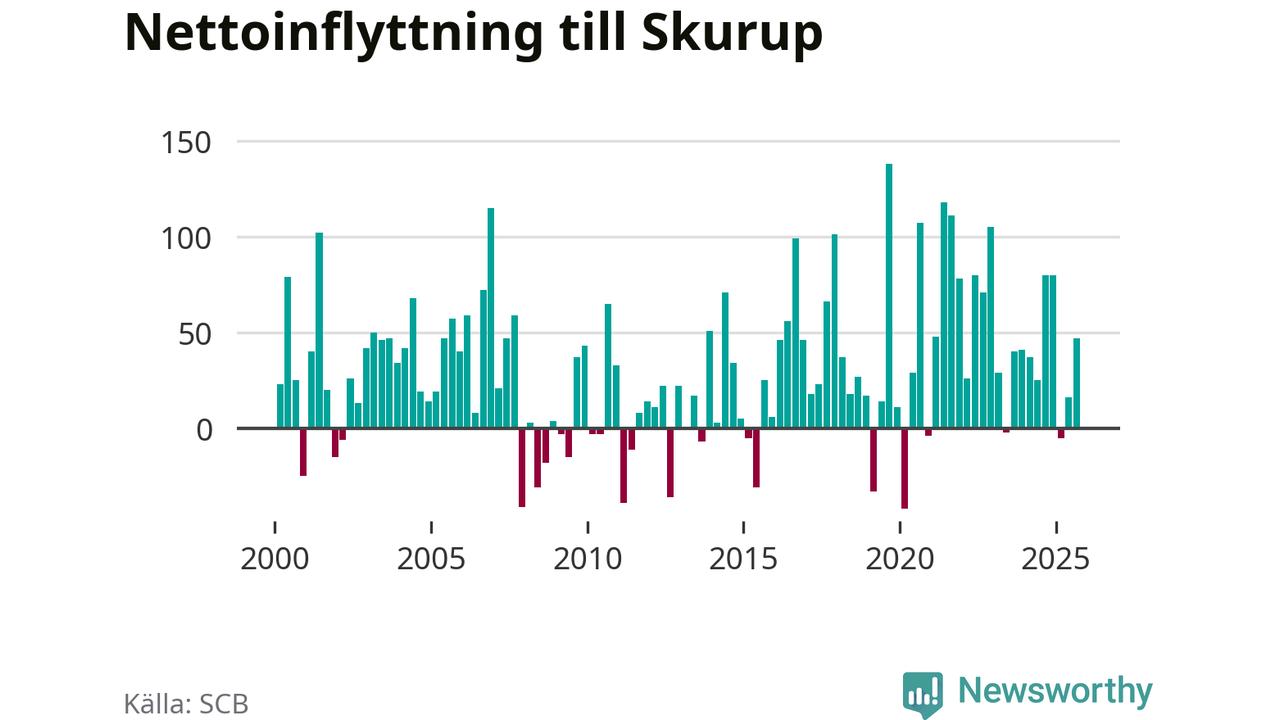 Under tredje kvartalet 2025 flyttade 336 personer till kommunen medan 289 personer flyttade därifrån. Det är historiskt sett en stor utflyttning under ett kvartal. Sedan seklets början har Skurup haft ett positivt flyttnetto under nästan alla kvartal, inklusive det senaste kvartalet.