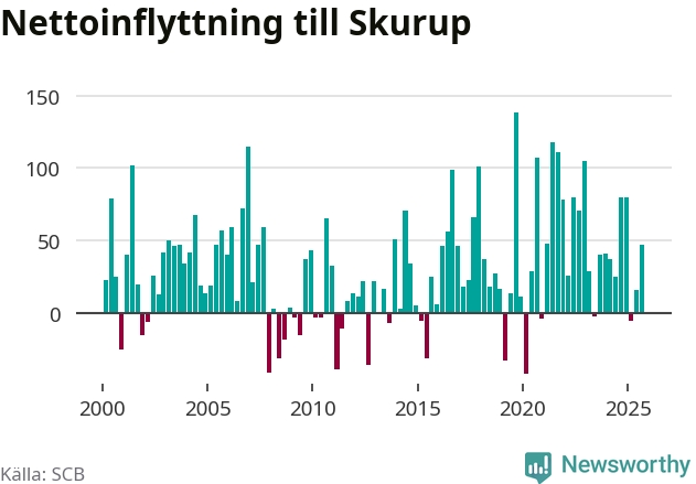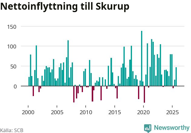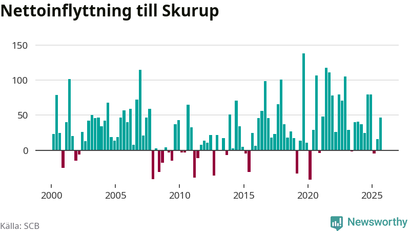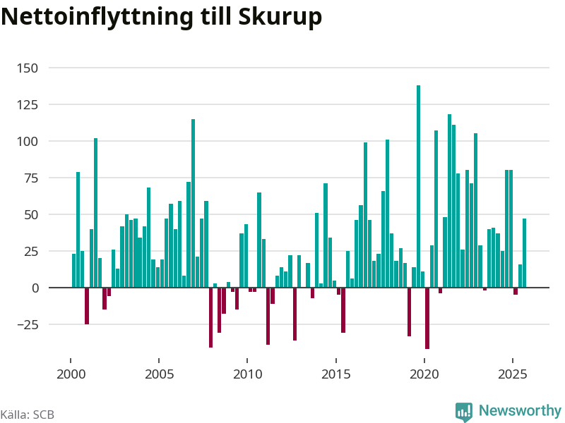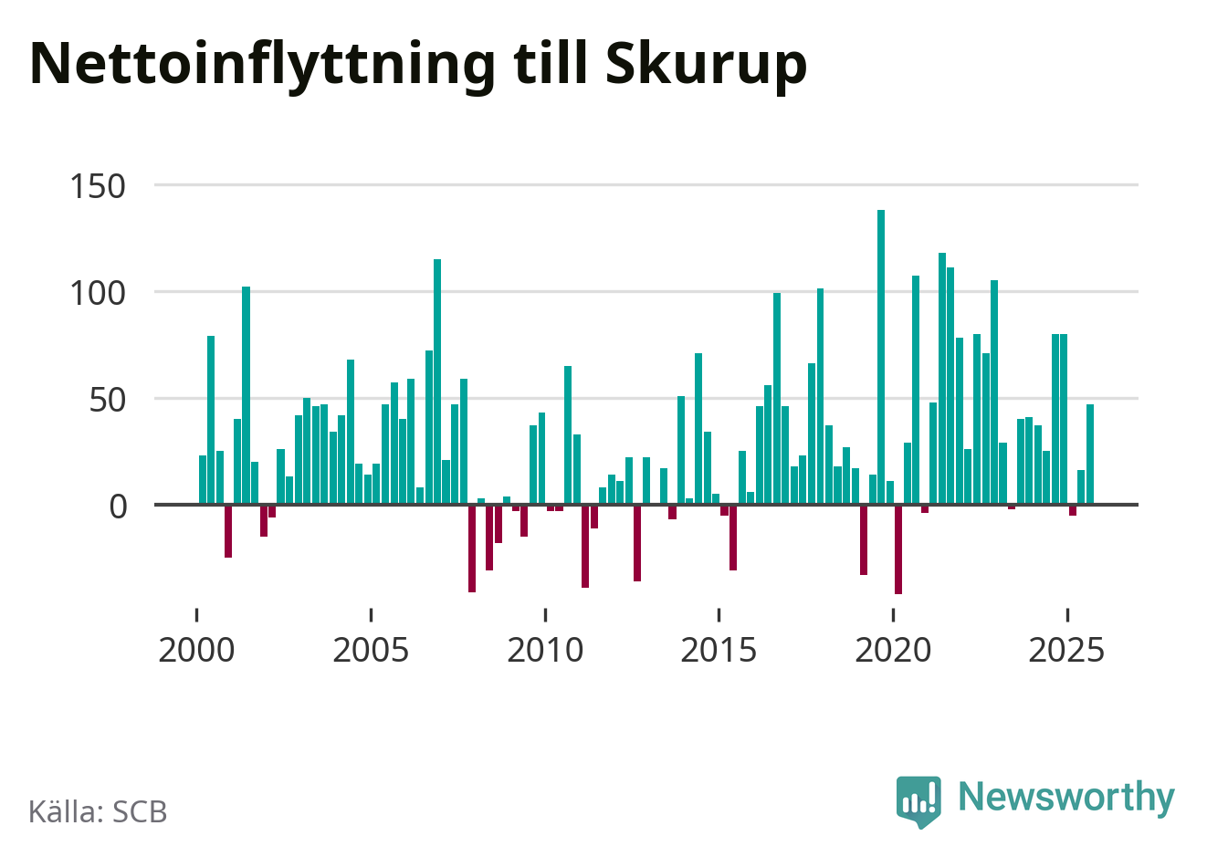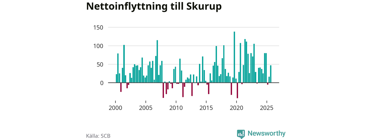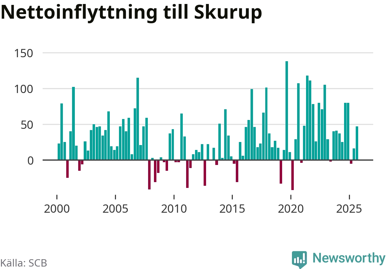 Under tredje kvartalet 2025 flyttade 336 personer till kommunen medan 289 personer flyttade därifrån. Det är historiskt sett en stor utflyttning under ett kvartal. Sedan seklets början har Skurup haft ett positivt flyttnetto under nästan alla kvartal, inklusive det senaste kvartalet.
