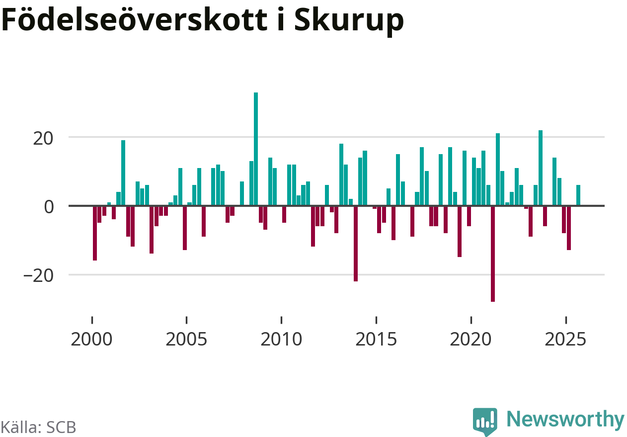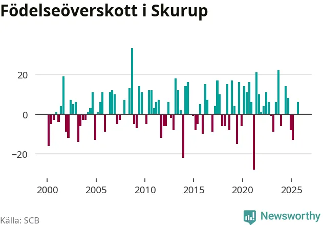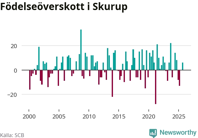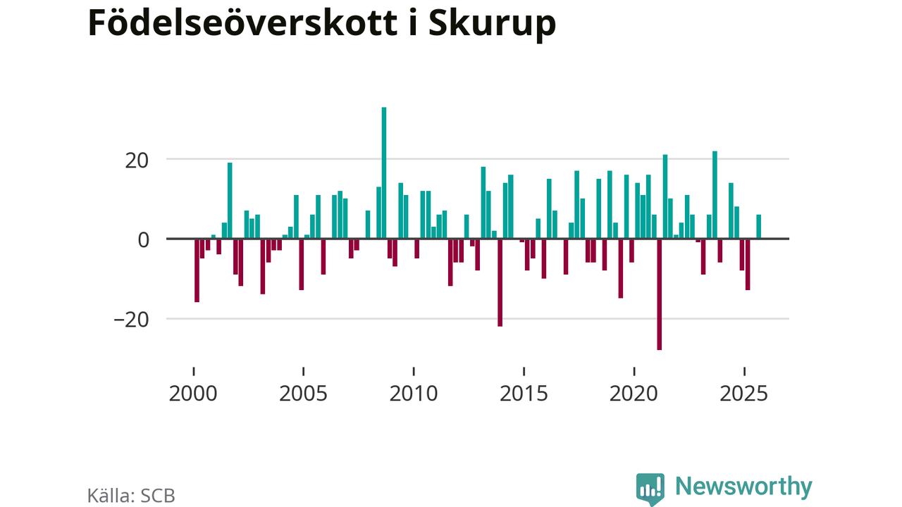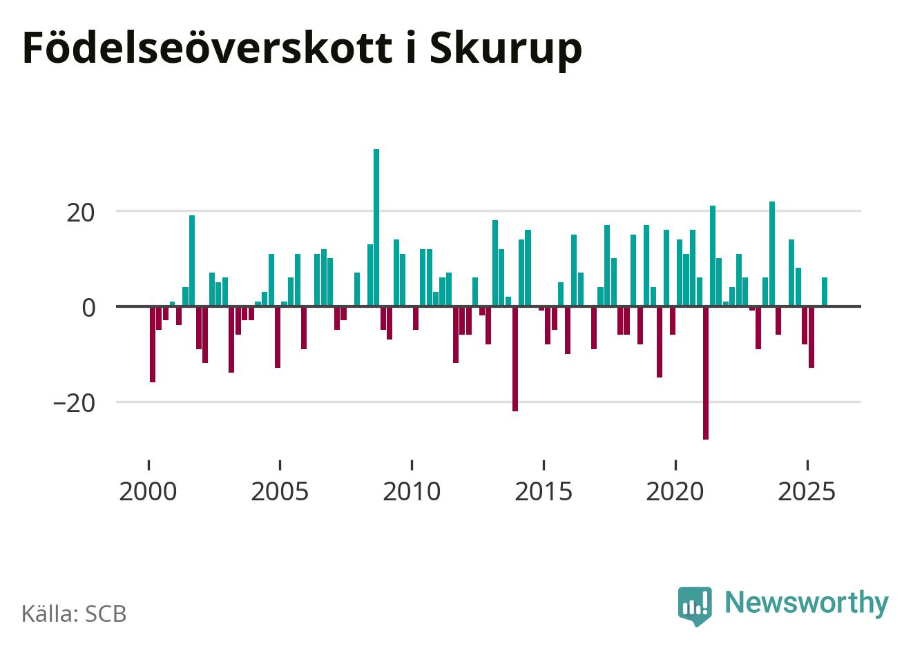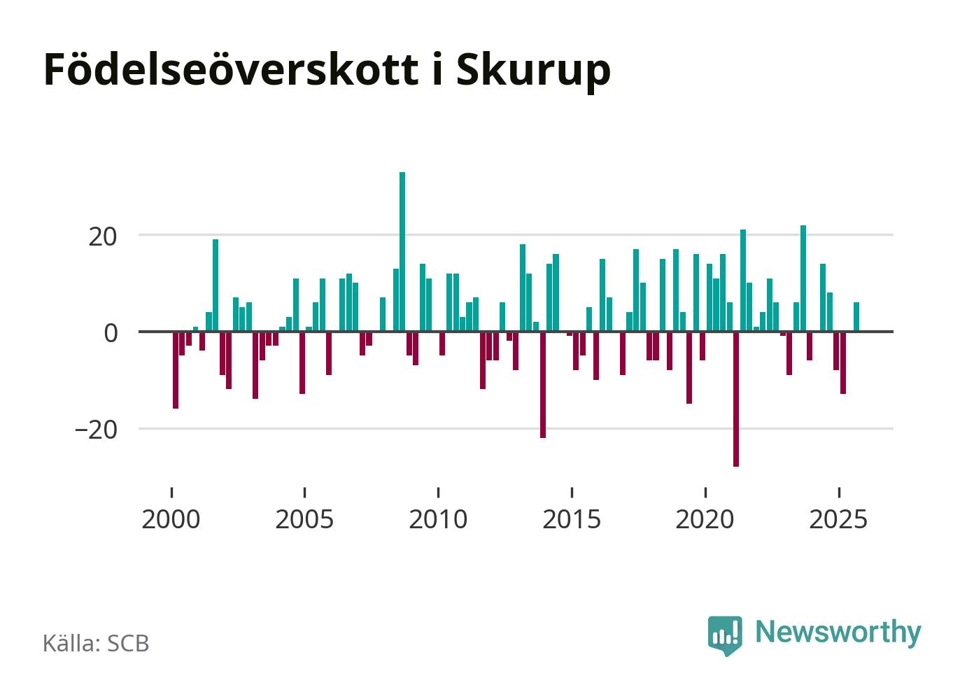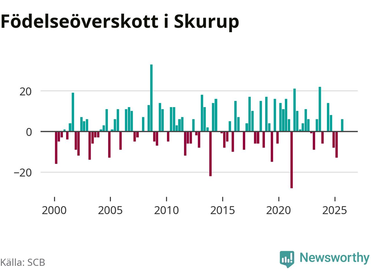Enligt SCB:s siffror föddes 41 barn i Skurup under det senaste kvartalet. Samtidigt avled 35 personer. Skillnaden mellan antal födda och döda är så liten att det inte går att säga om det beror på något annat än SCB:s röjandeskydd. Kommunen har oftast haft positivt födelsenetto tidigare.
