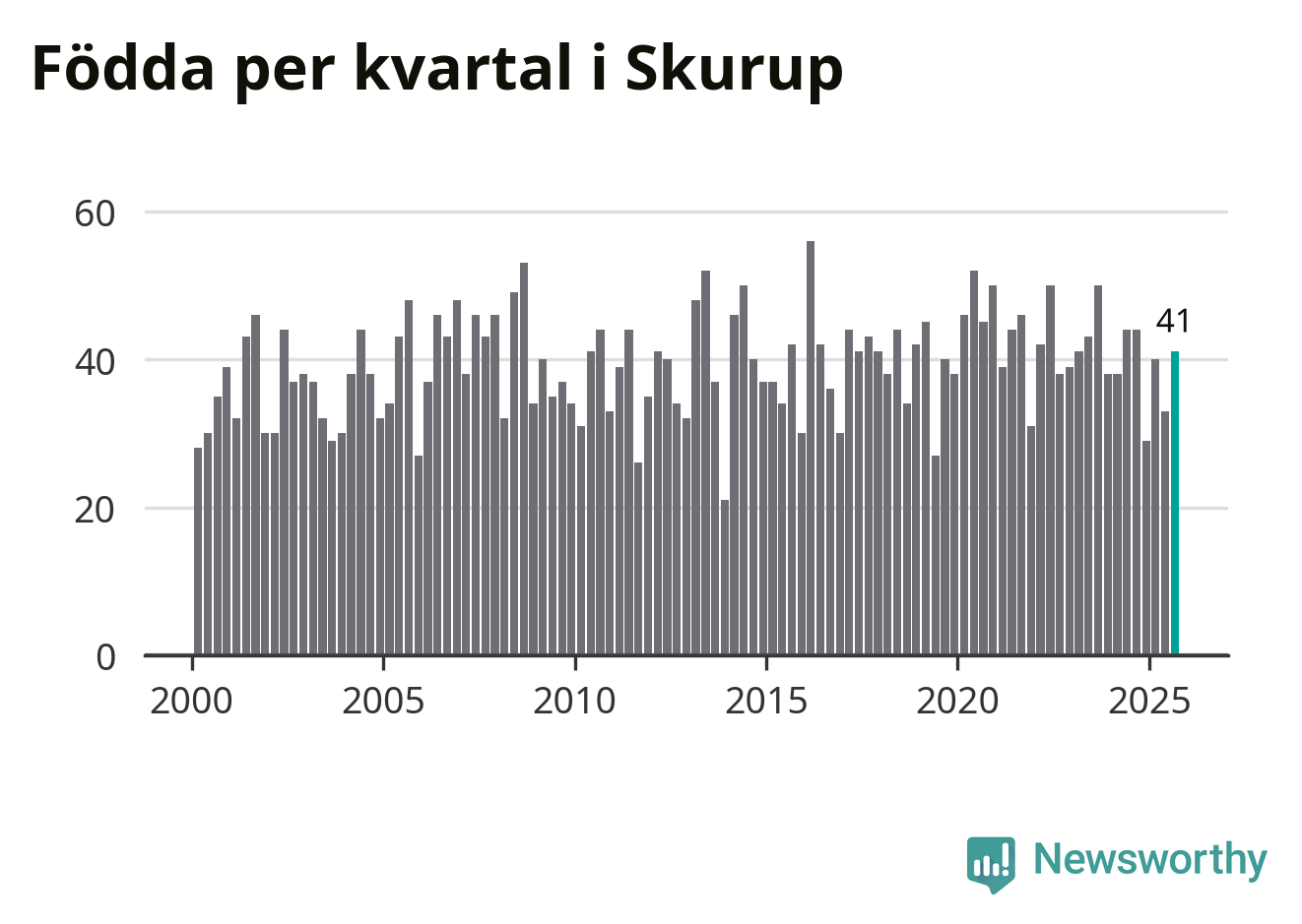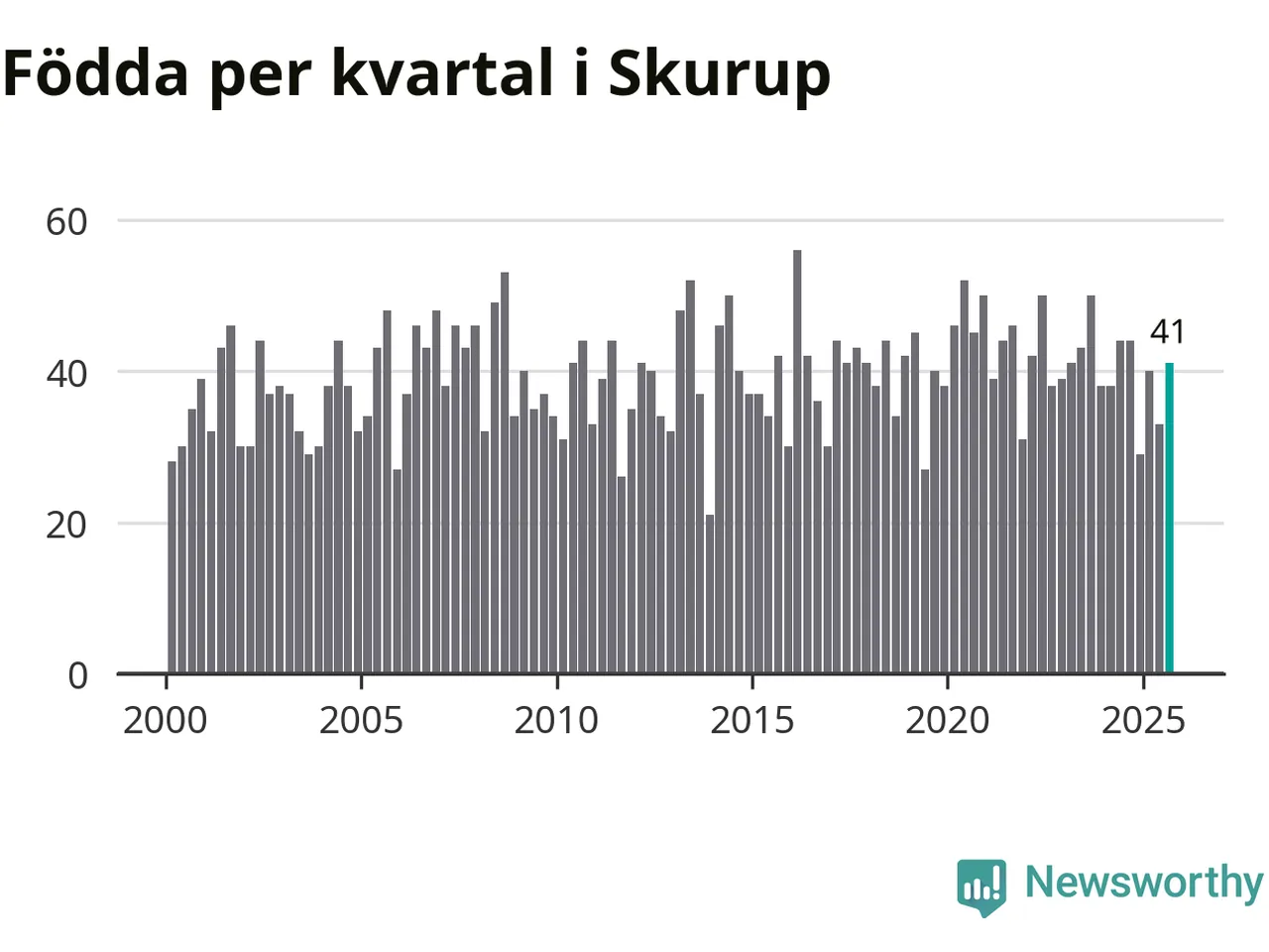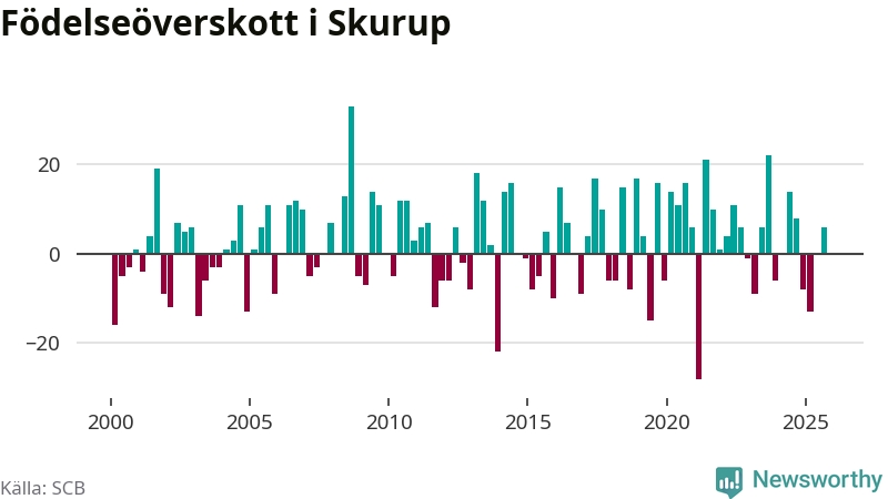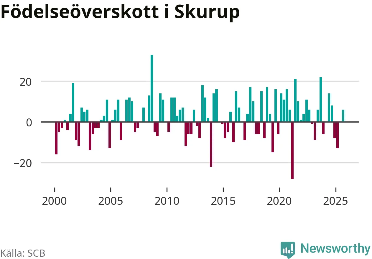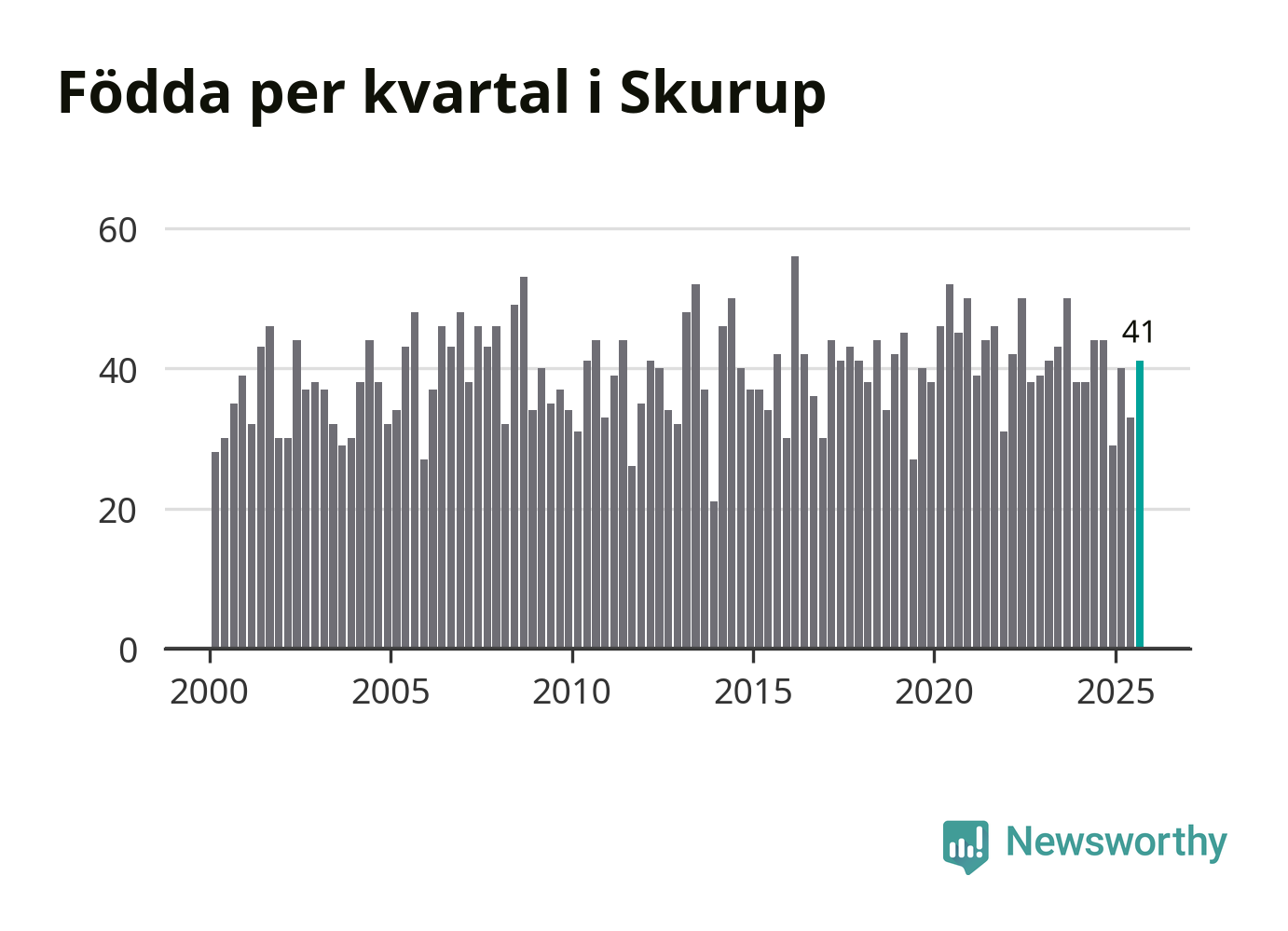 Enligt SCB:s siffror föddes 41 barn i Skurup under det senaste kvartalet. Samtidigt avled 35 personer. Skillnaden mellan antal födda och döda är så liten att det inte går att säga om det beror på något annat än SCB:s röjandeskydd. Kommunen har oftast haft positivt födelsenetto tidigare.