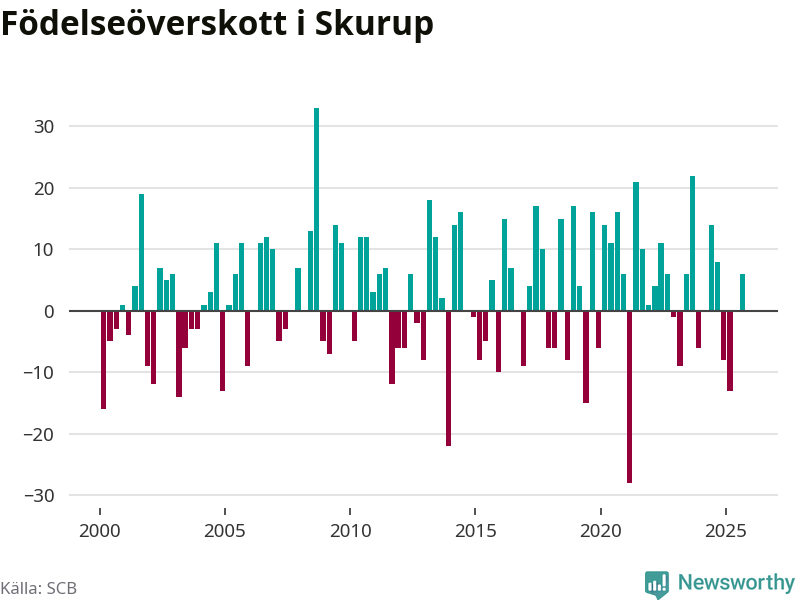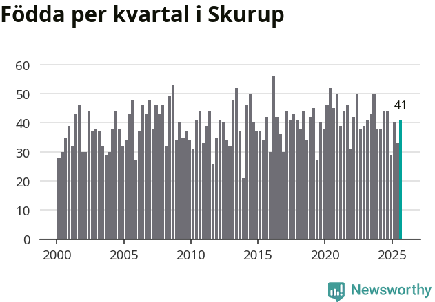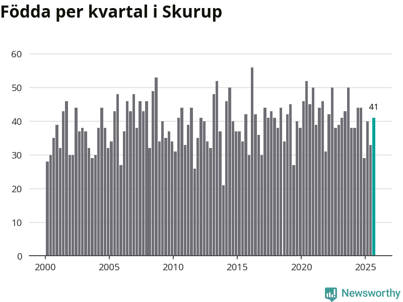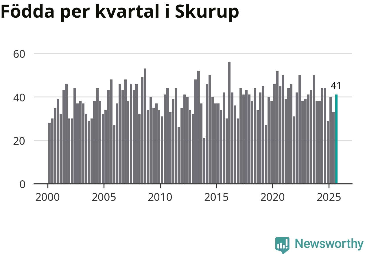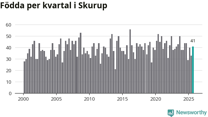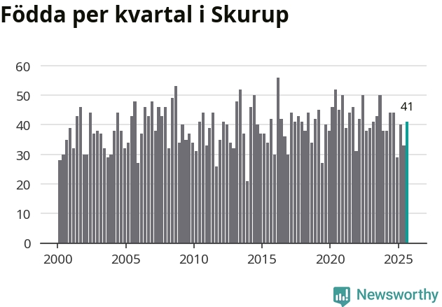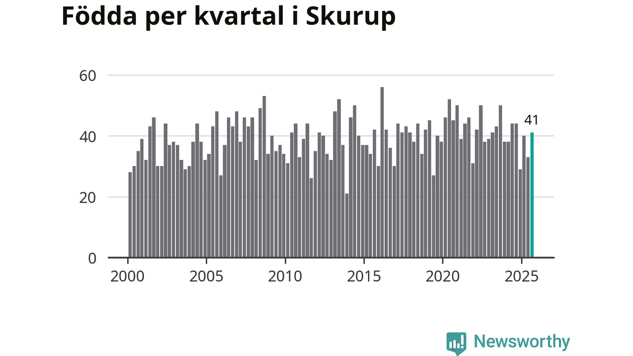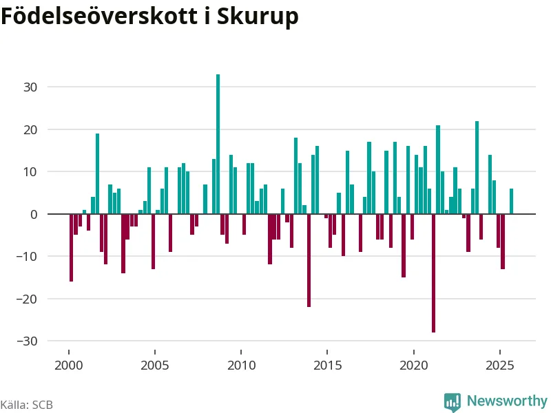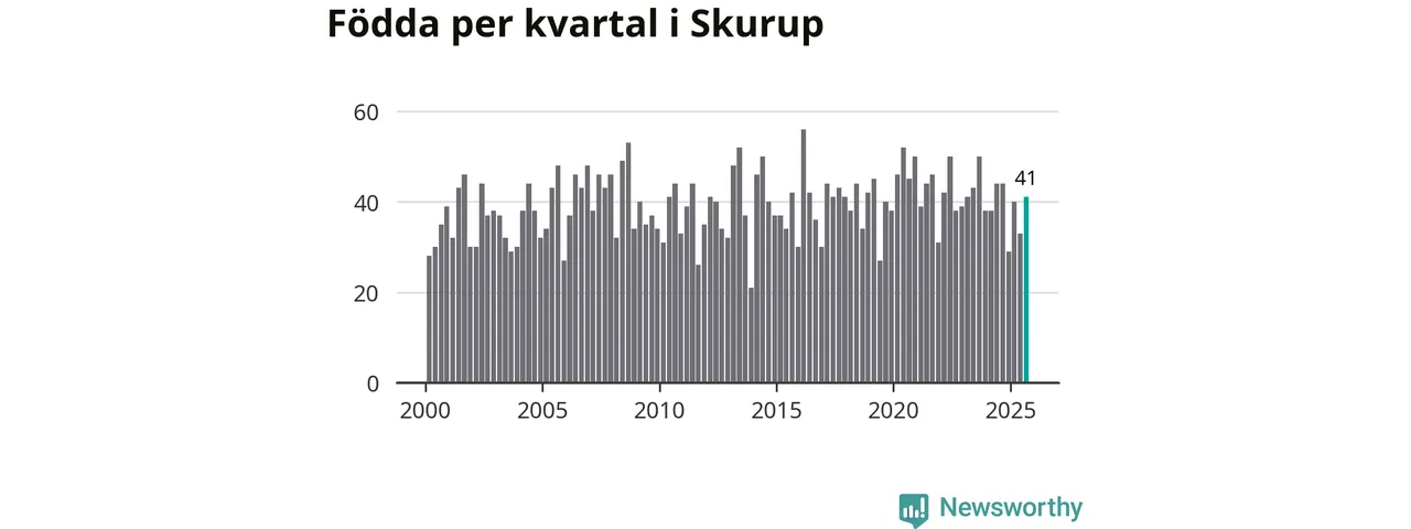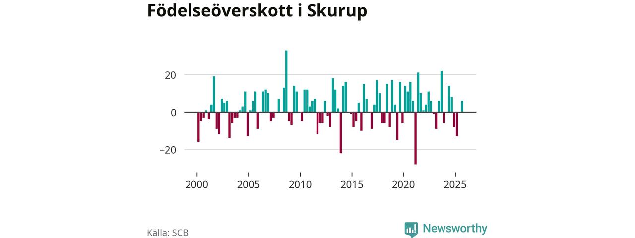 Enligt SCB:s siffror föddes 41 barn i Skurup under det senaste kvartalet. Samtidigt avled 35 personer. Skillnaden mellan antal födda och döda är så liten att det inte går att säga om det beror på något annat än SCB:s röjandeskydd. Kommunen har oftast haft positivt födelsenetto tidigare.