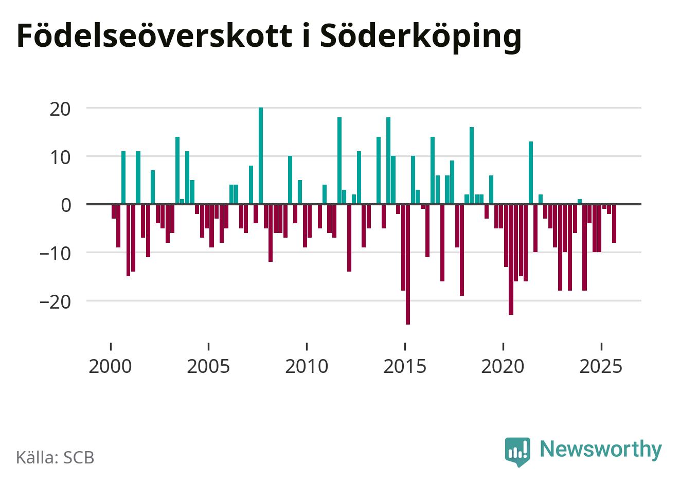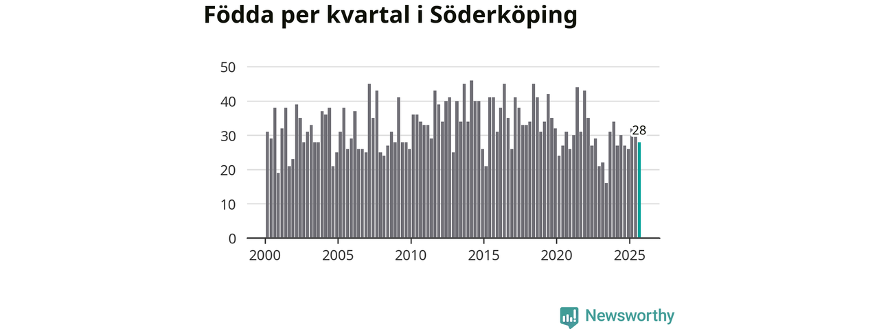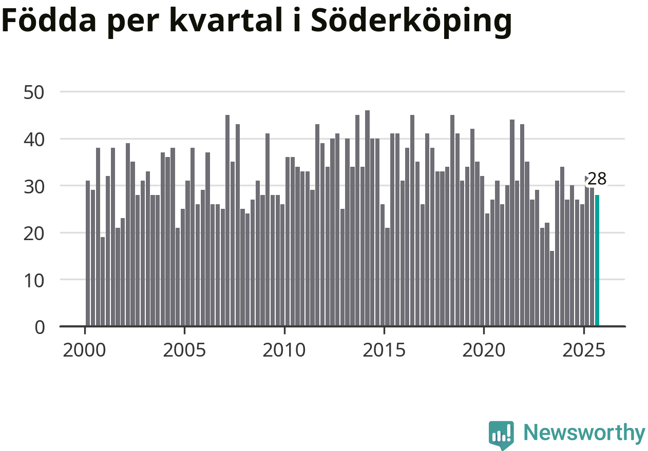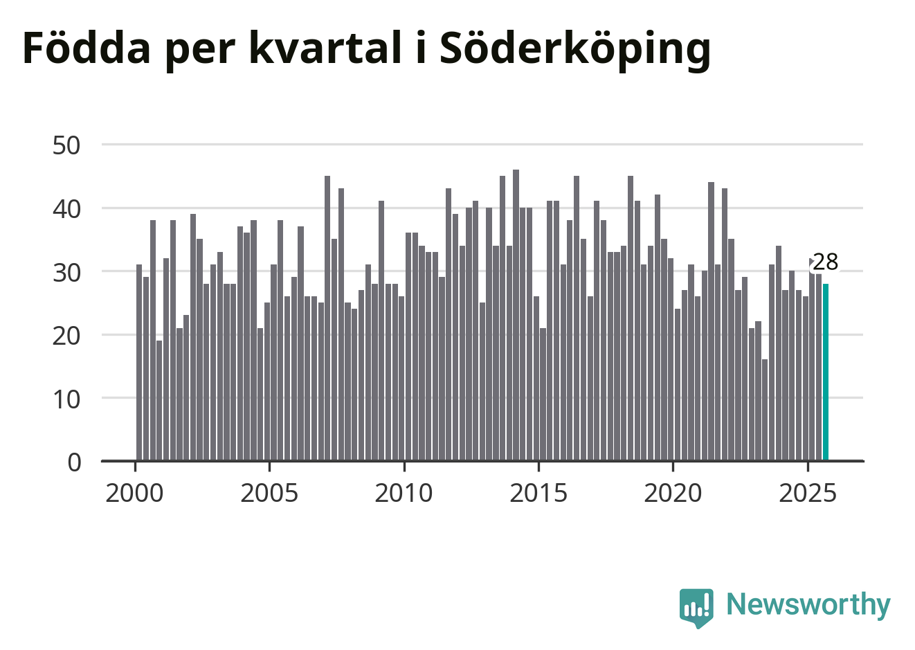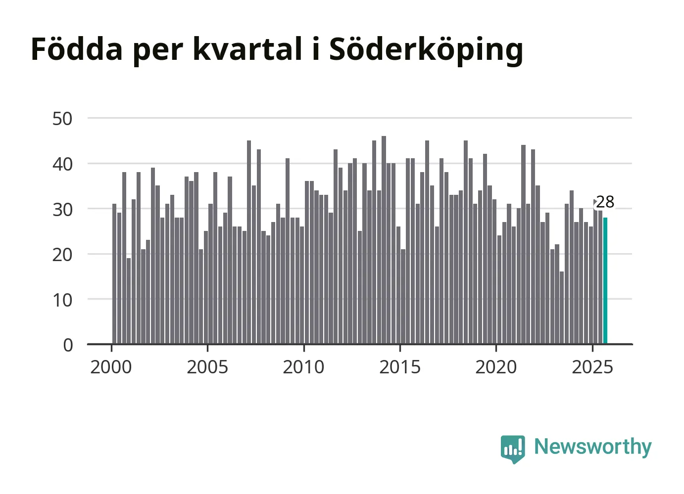 Enligt SCB:s siffror föddes 28 barn i Söderköping under det senaste kvartalet. Samtidigt avled 36 personer. Skillnaden mellan antal födda och döda är så liten att det inte går att säga om det beror på något annat än SCB:s röjandeskydd. Kommunen har oftast haft negativt födelsenetto tidigare.