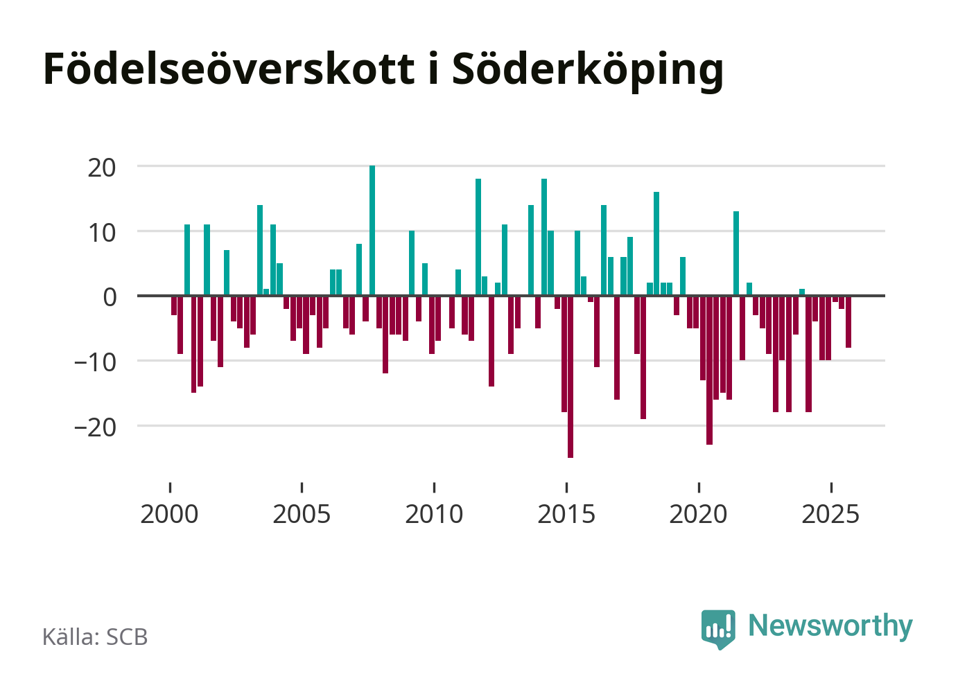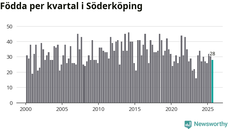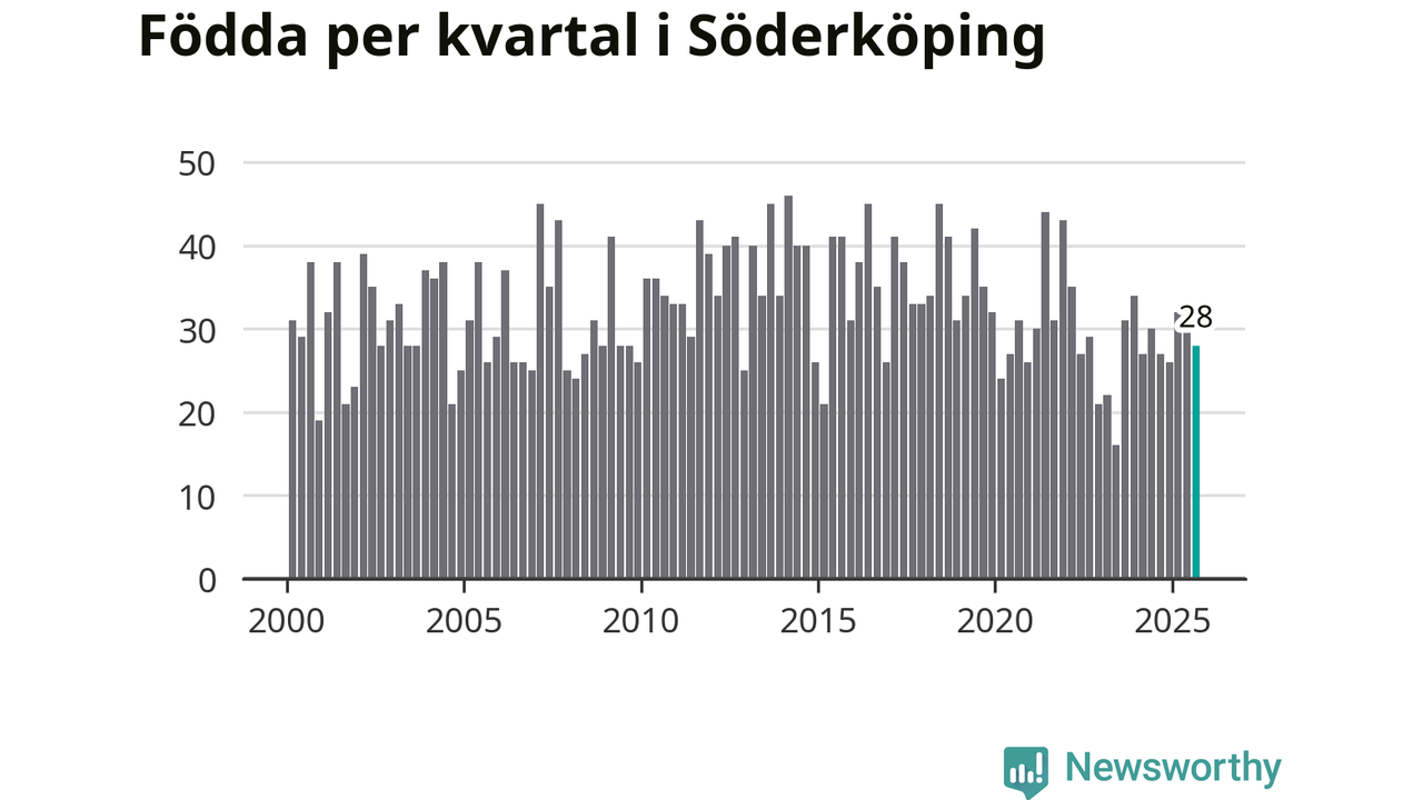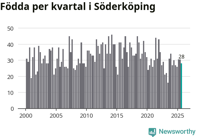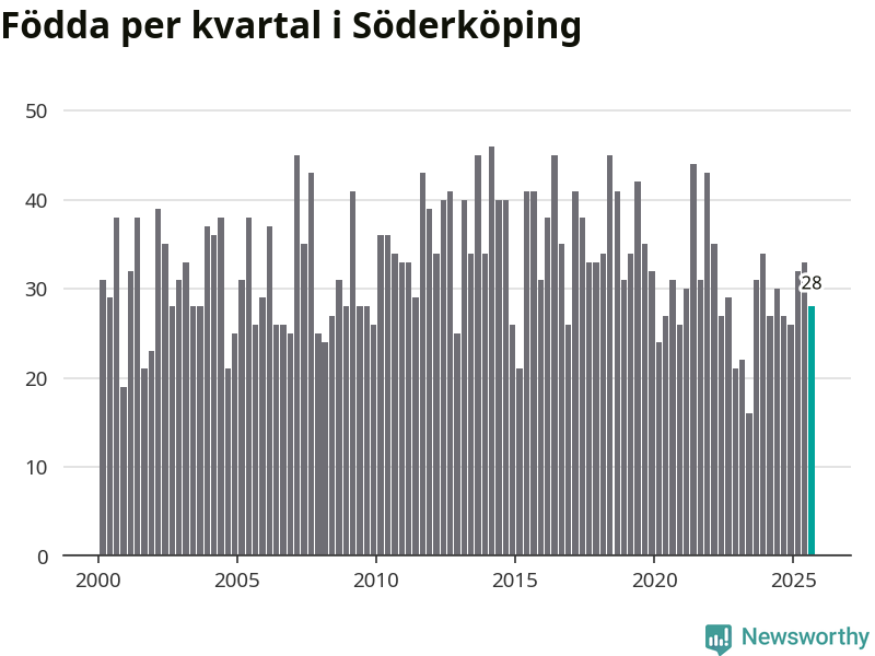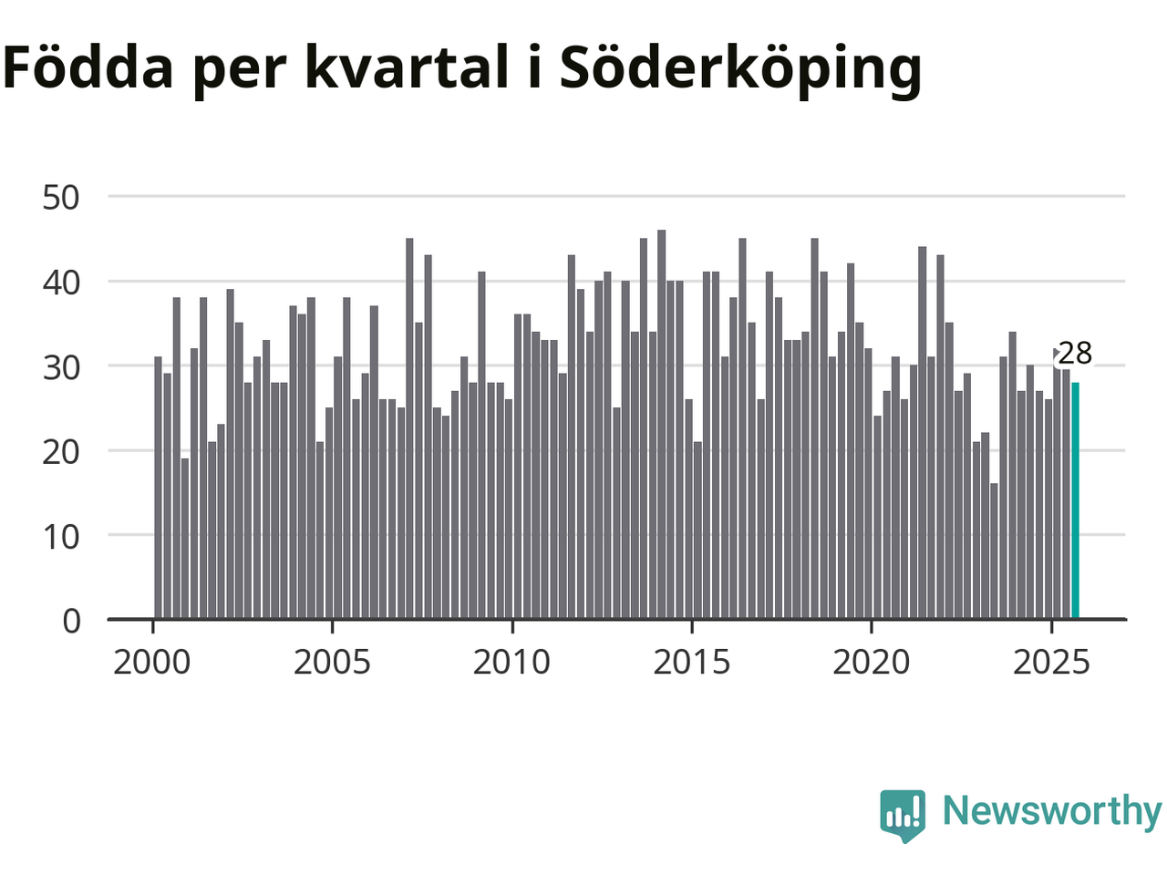 Enligt SCB:s siffror föddes 28 barn i Söderköping under det senaste kvartalet. Samtidigt avled 36 personer. Skillnaden mellan antal födda och döda är så liten att det inte går att säga om det beror på något annat än SCB:s röjandeskydd. Kommunen har oftast haft negativt födelsenetto tidigare.