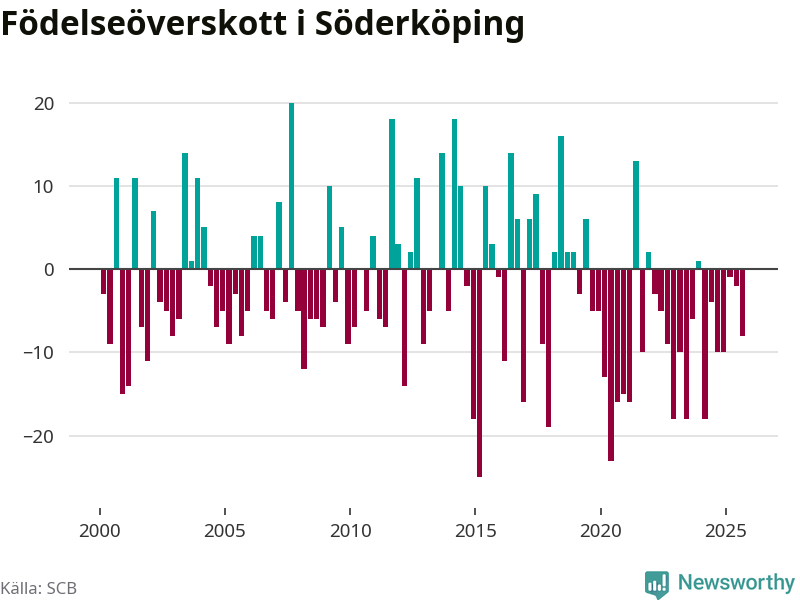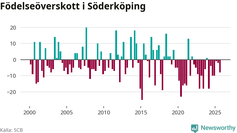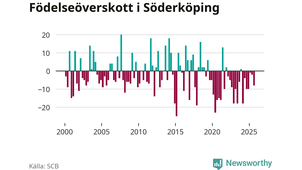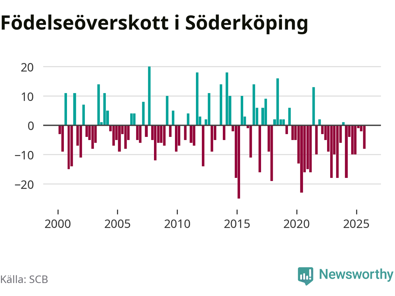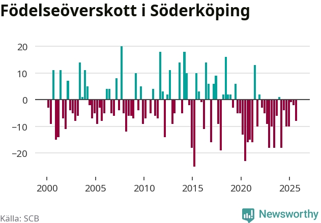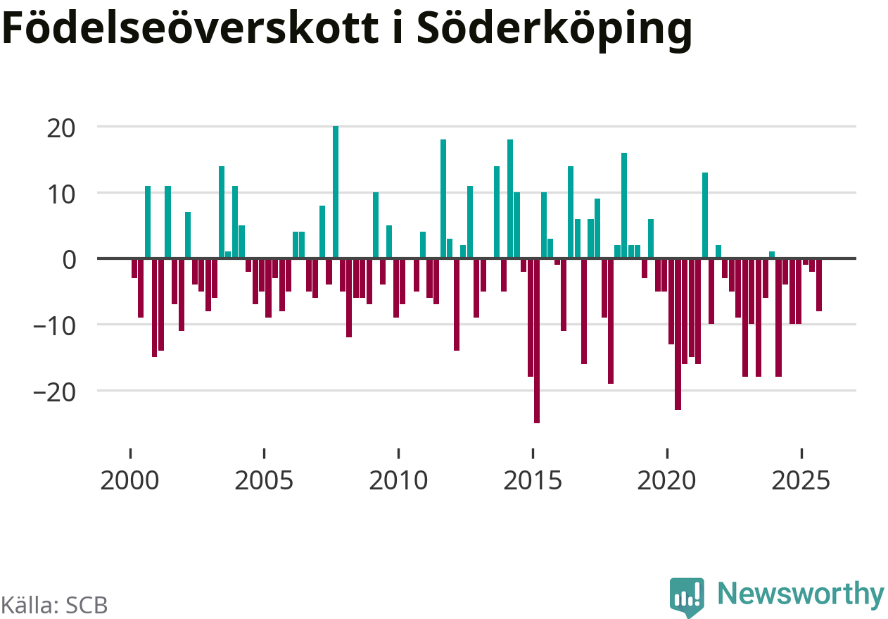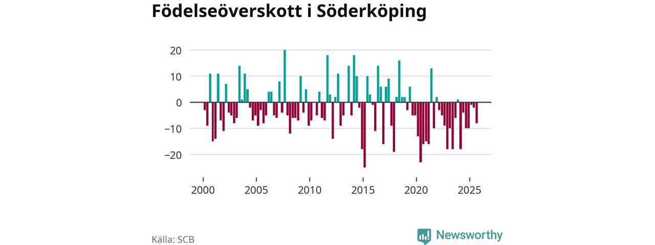 Enligt SCB:s siffror föddes 28 barn i Söderköping under det senaste kvartalet. Samtidigt avled 36 personer. Skillnaden mellan antal födda och döda är så liten att det inte går att säga om det beror på något annat än SCB:s röjandeskydd. Kommunen har oftast haft negativt födelsenetto tidigare.