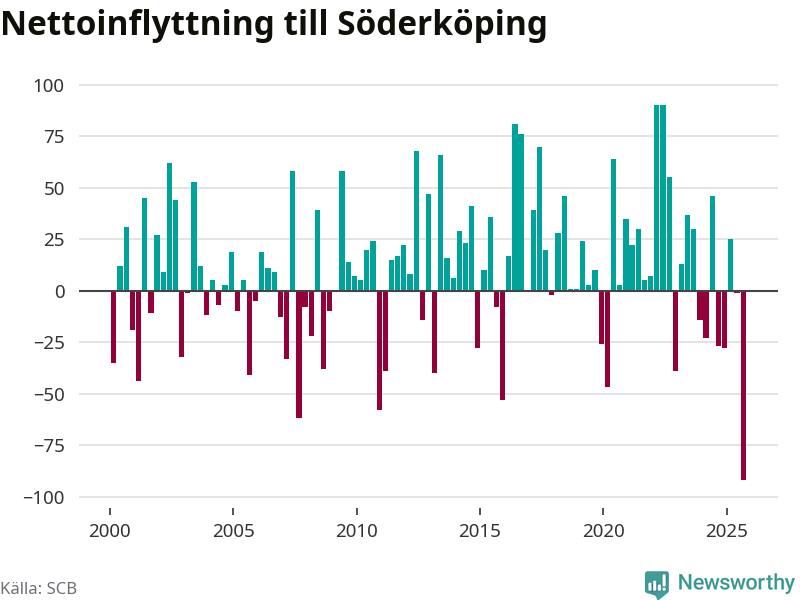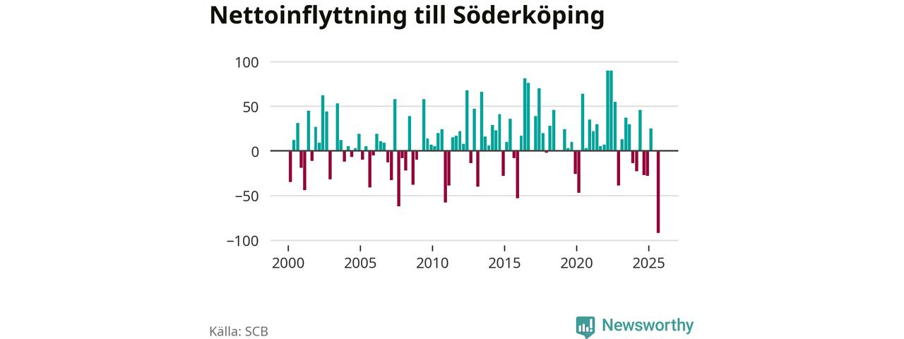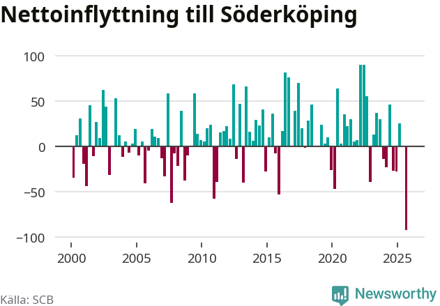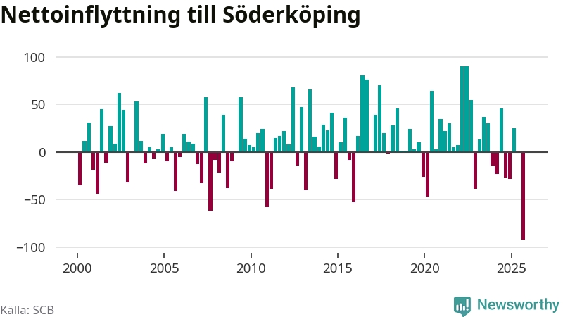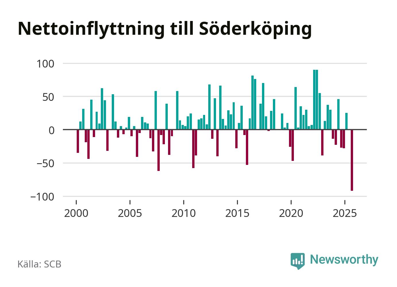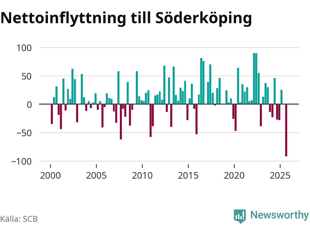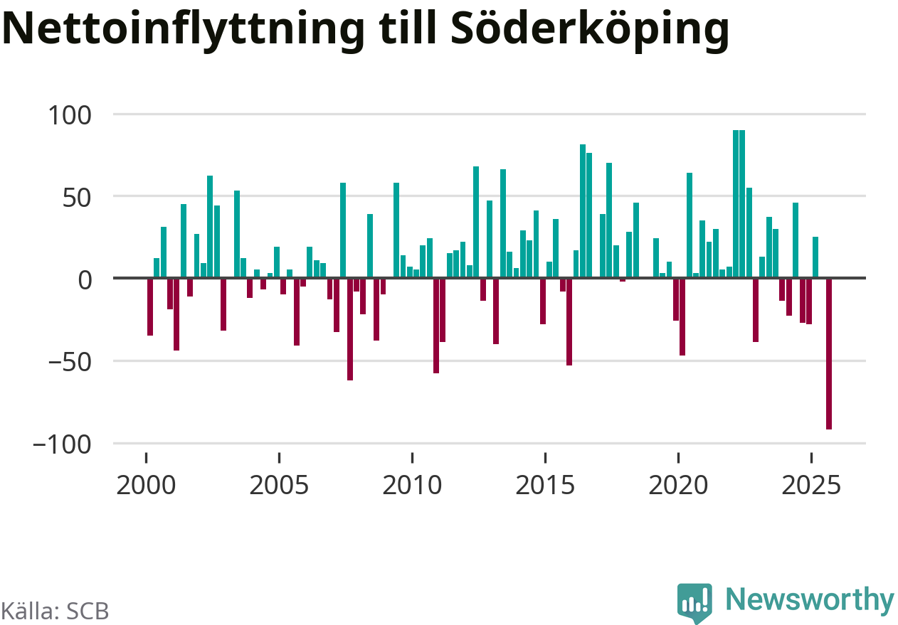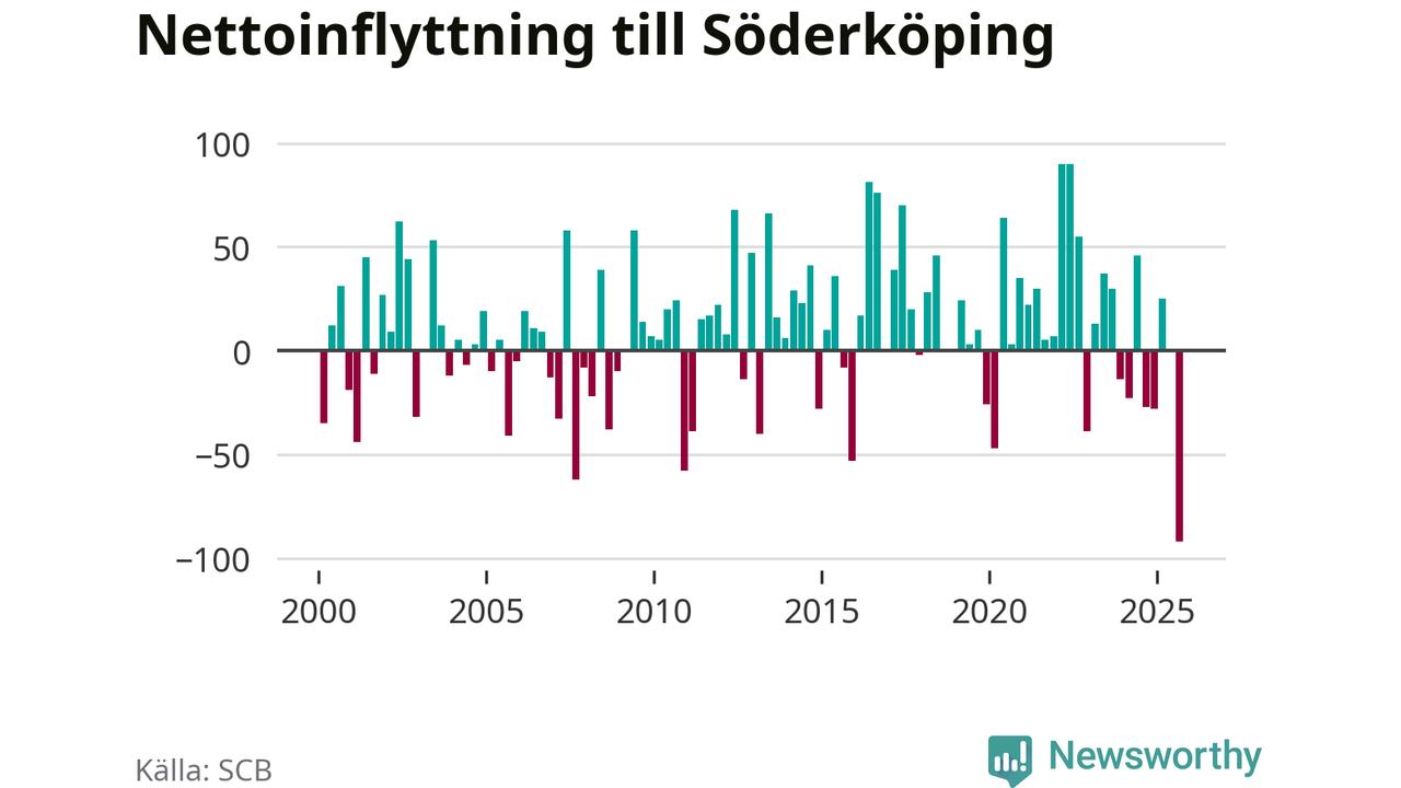 Under tredje kvartalet 2025 flyttade 196 personer till kommunen medan 288 personer flyttade därifrån. Så många har inte flyttat från Söderköping under något kvartal under det här seklet. Det ger den största nettoutflyttningen under ett kvartal sedan åtminstone år 2000. Sedan seklets början har Söderköping oftast haft ett positivt flyttnetto.