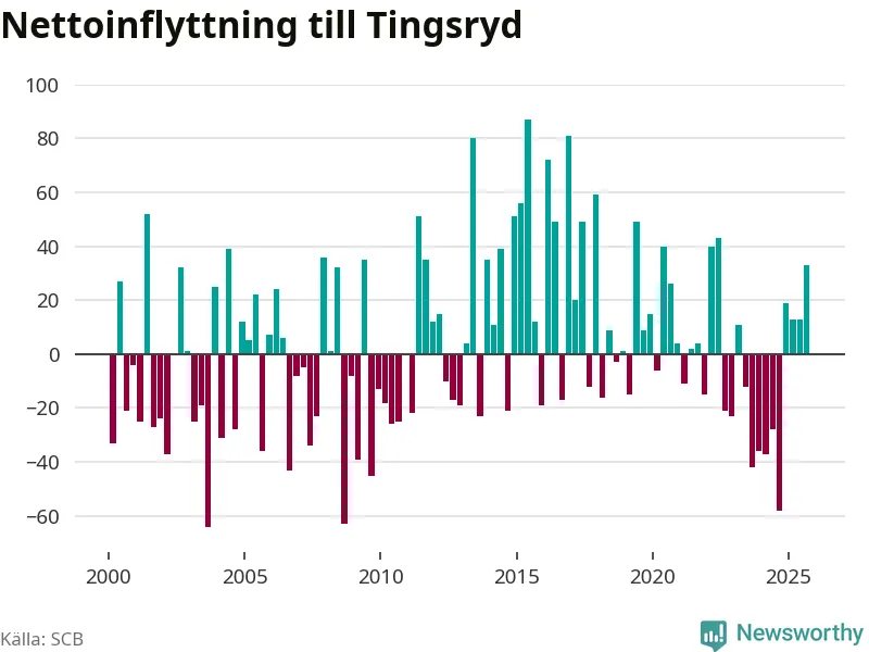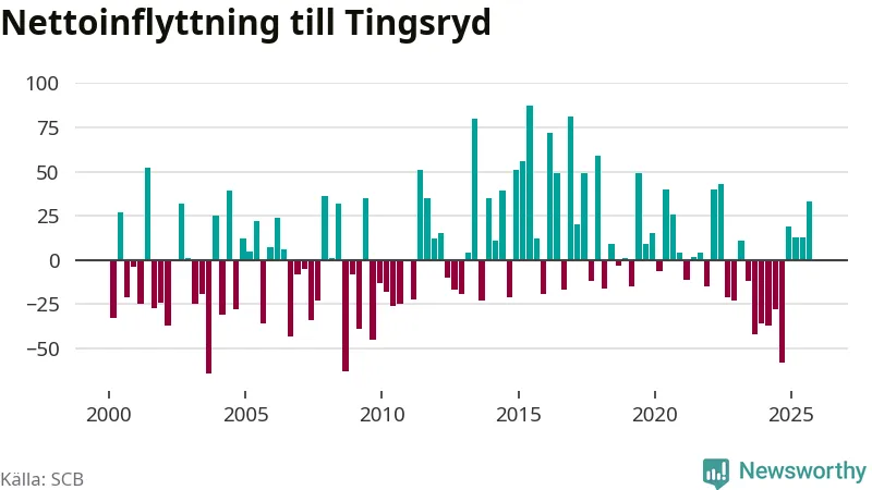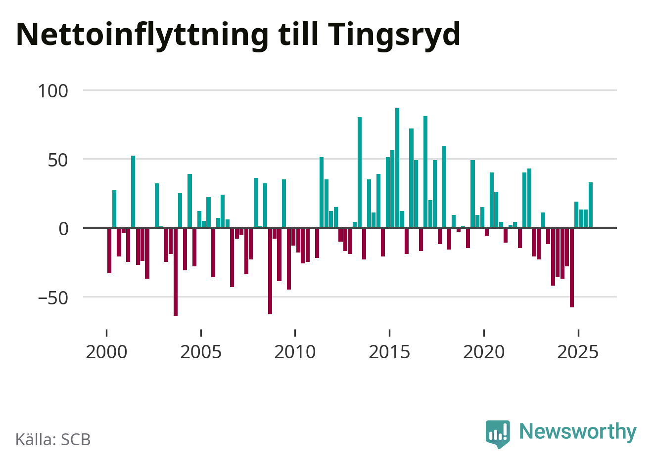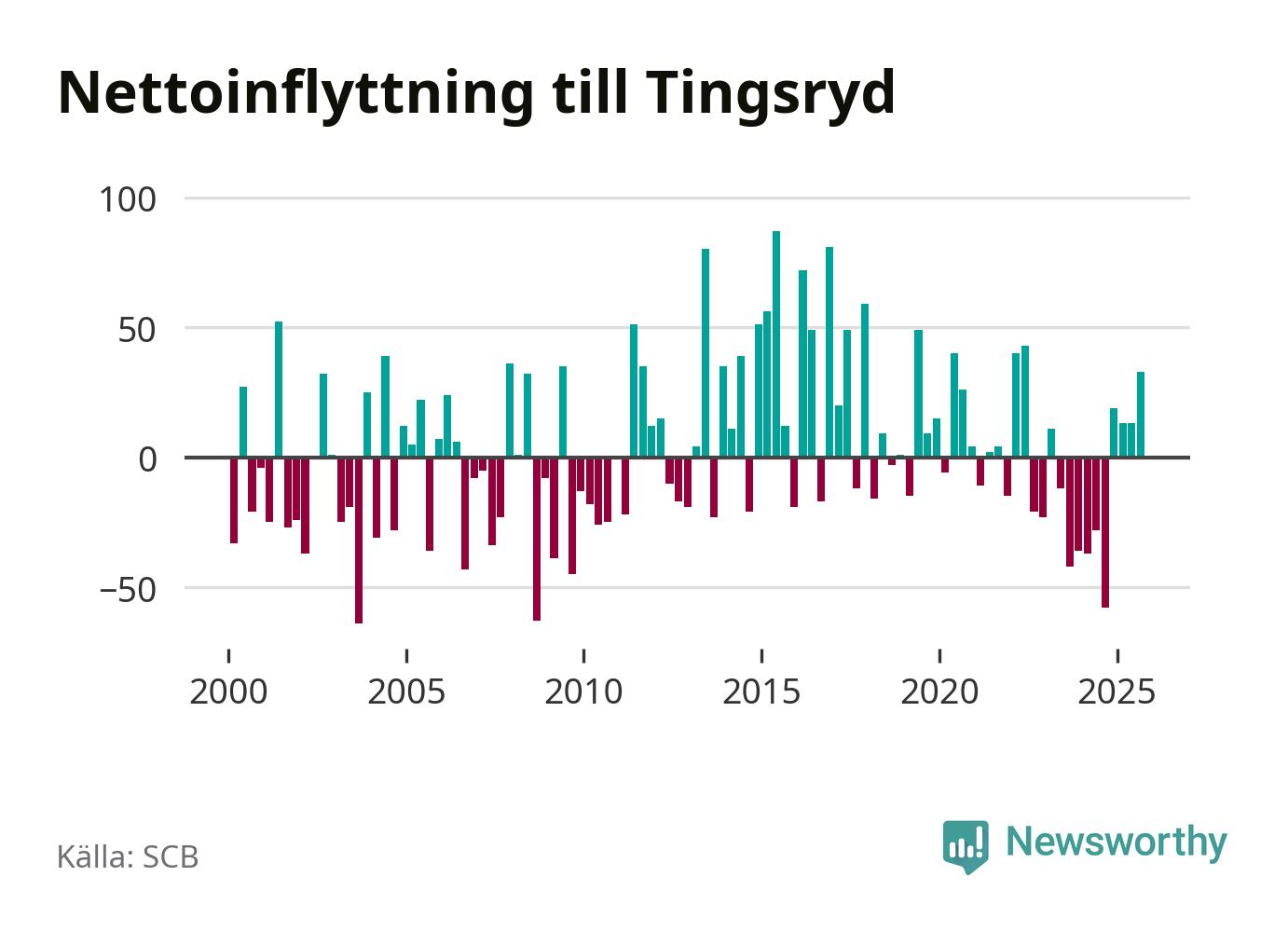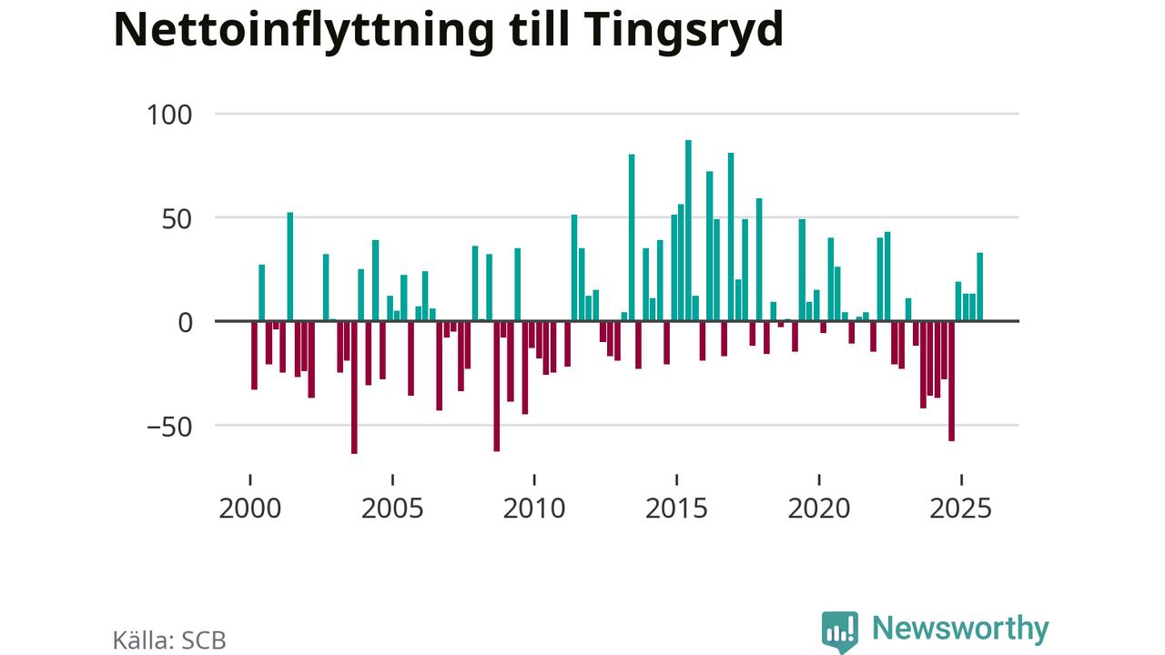 Under tredje kvartalet 2025 flyttade 207 personer till kommunen medan 174 personer flyttade därifrån. Sedan seklets början har Tingsryd oftast haft ett positivt flyttnetto, inklusive det senaste kvartalet.