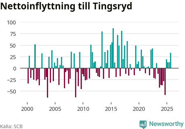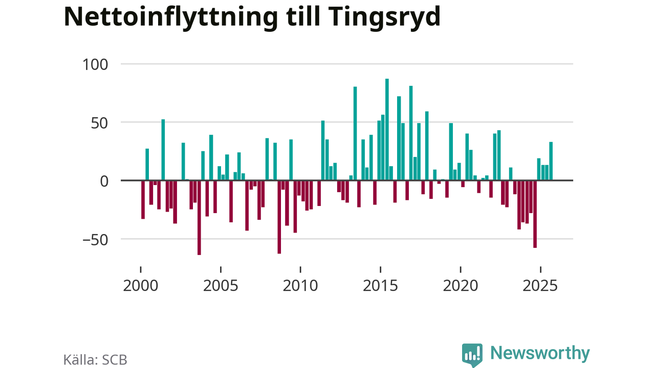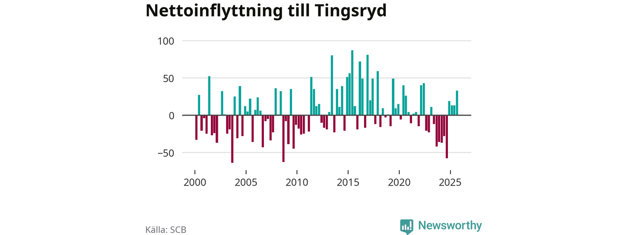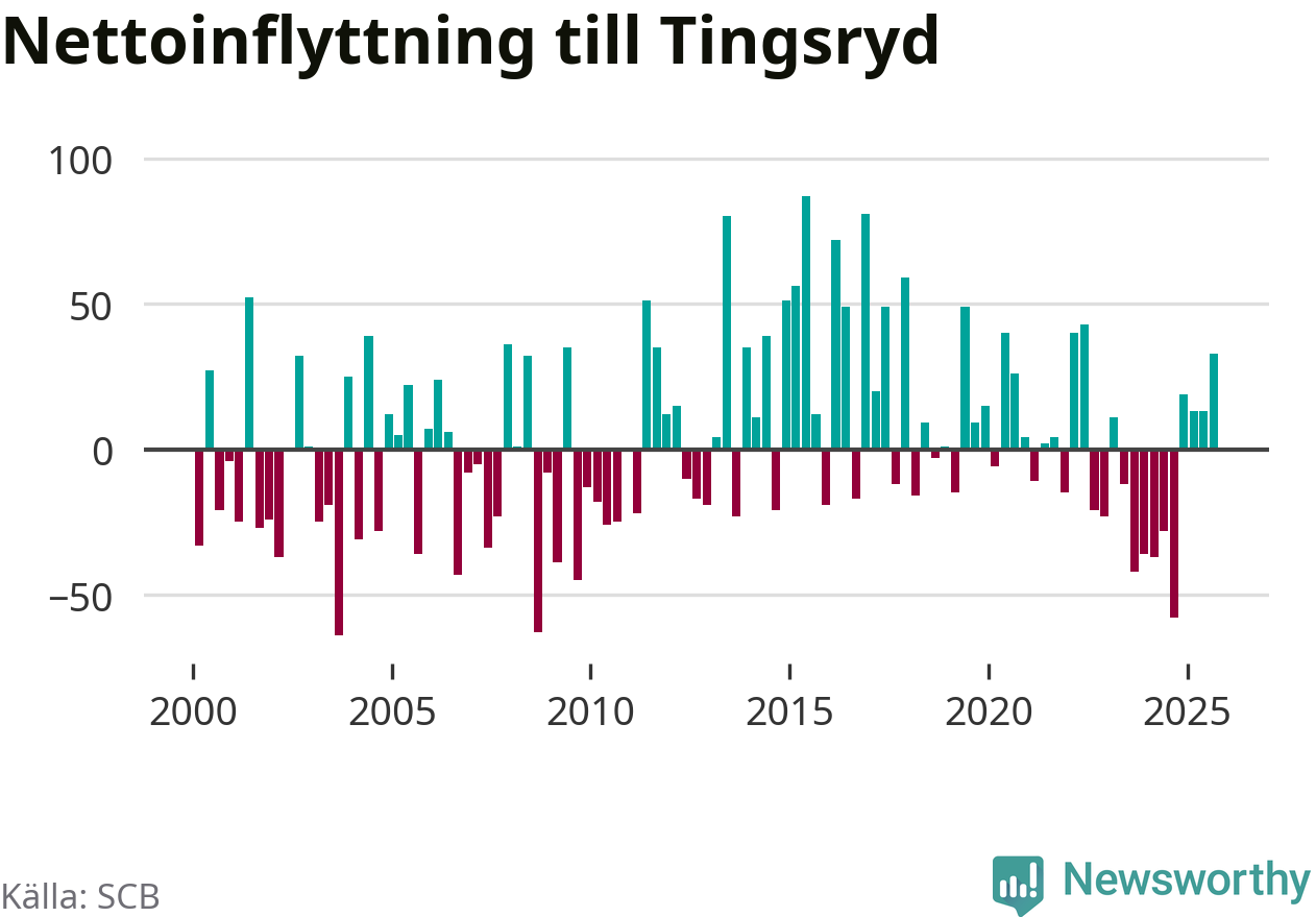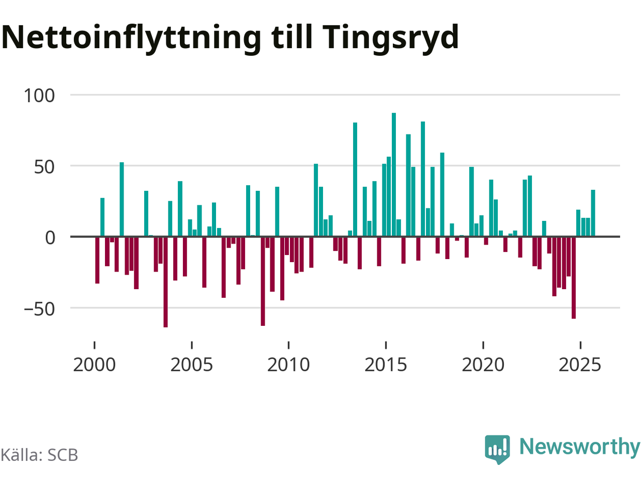 Under tredje kvartalet 2025 flyttade 207 personer till kommunen medan 174 personer flyttade därifrån. Sedan seklets början har Tingsryd oftast haft ett positivt flyttnetto, inklusive det senaste kvartalet.