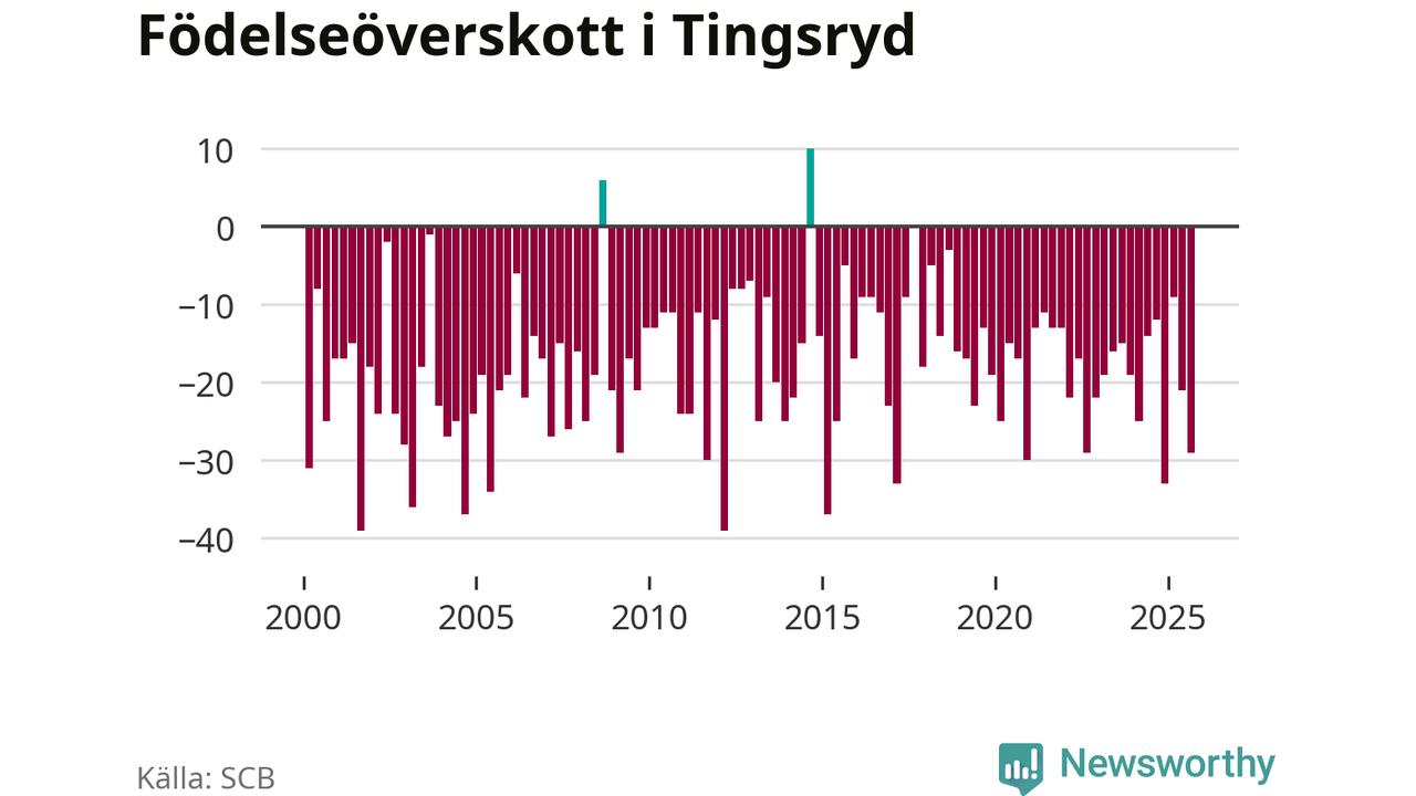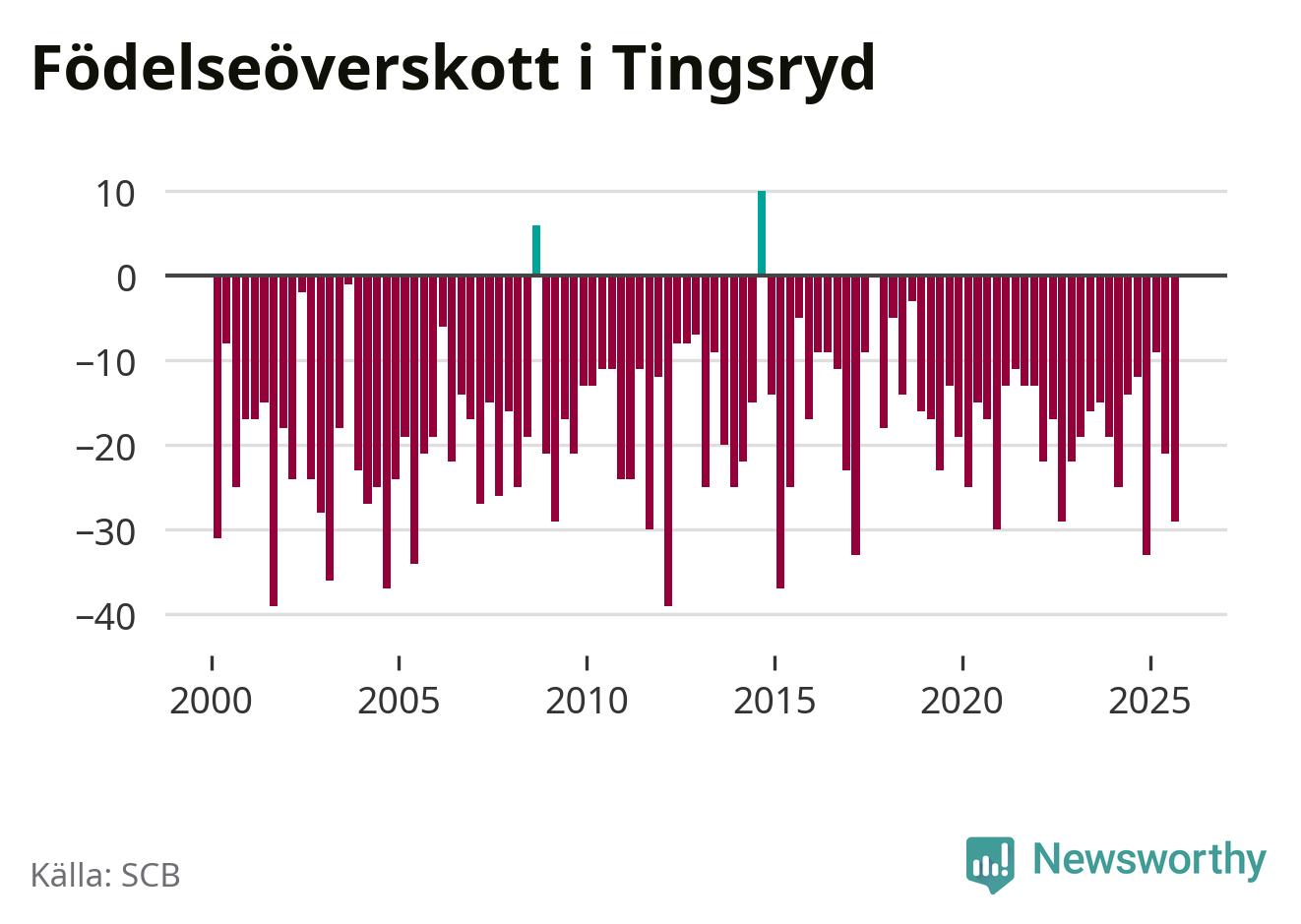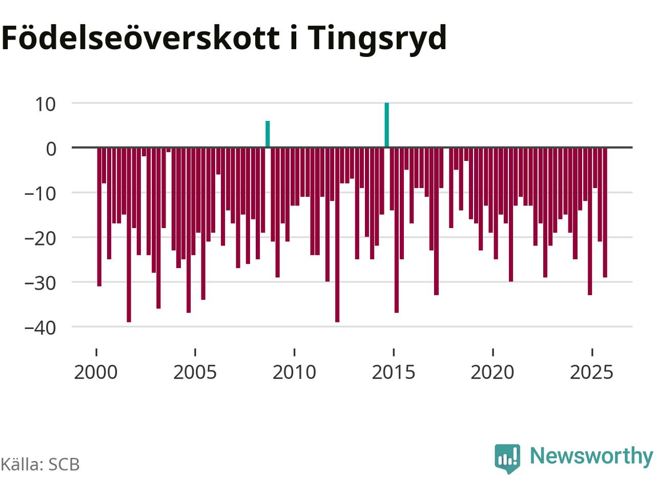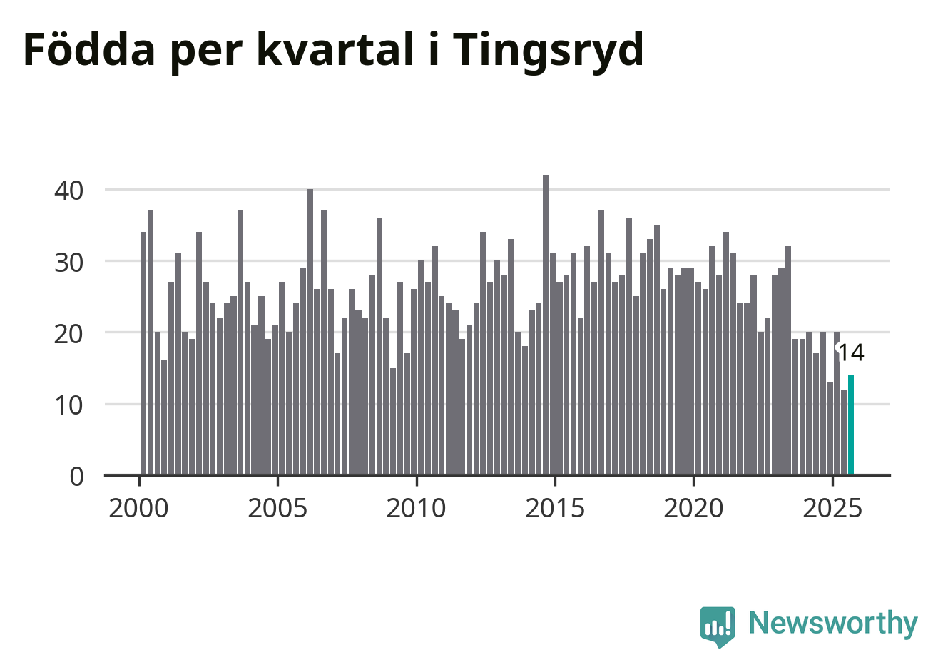 Enligt SCB:s siffror föddes 14 barn i Tingsryd under det senaste kvartalet. Samtidigt avled 43 personer. Tingsryd hade alltså ett negativt födelsenetto, vilket kommunen historiskt sett nästan alltid har haft.