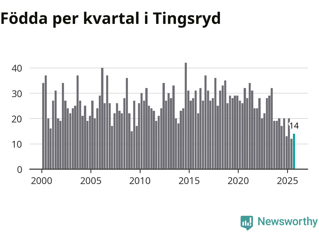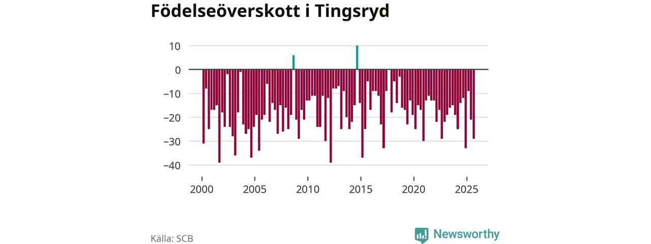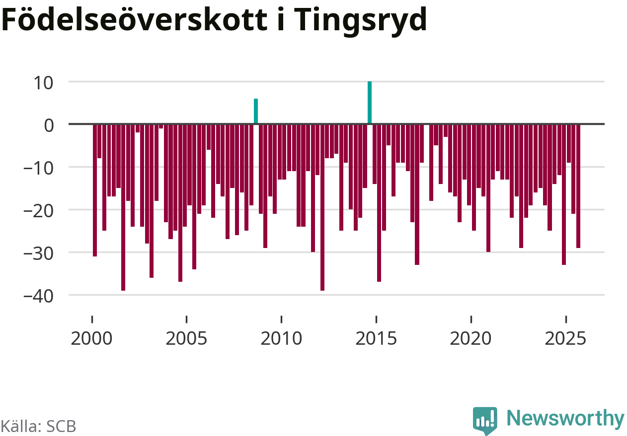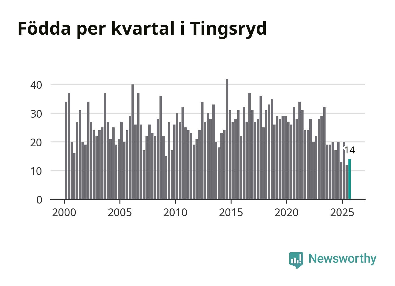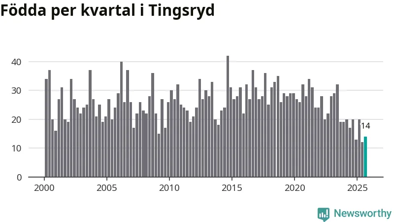 Enligt SCB:s siffror föddes 14 barn i Tingsryd under det senaste kvartalet. Samtidigt avled 43 personer. Tingsryd hade alltså ett negativt födelsenetto, vilket kommunen historiskt sett nästan alltid har haft.