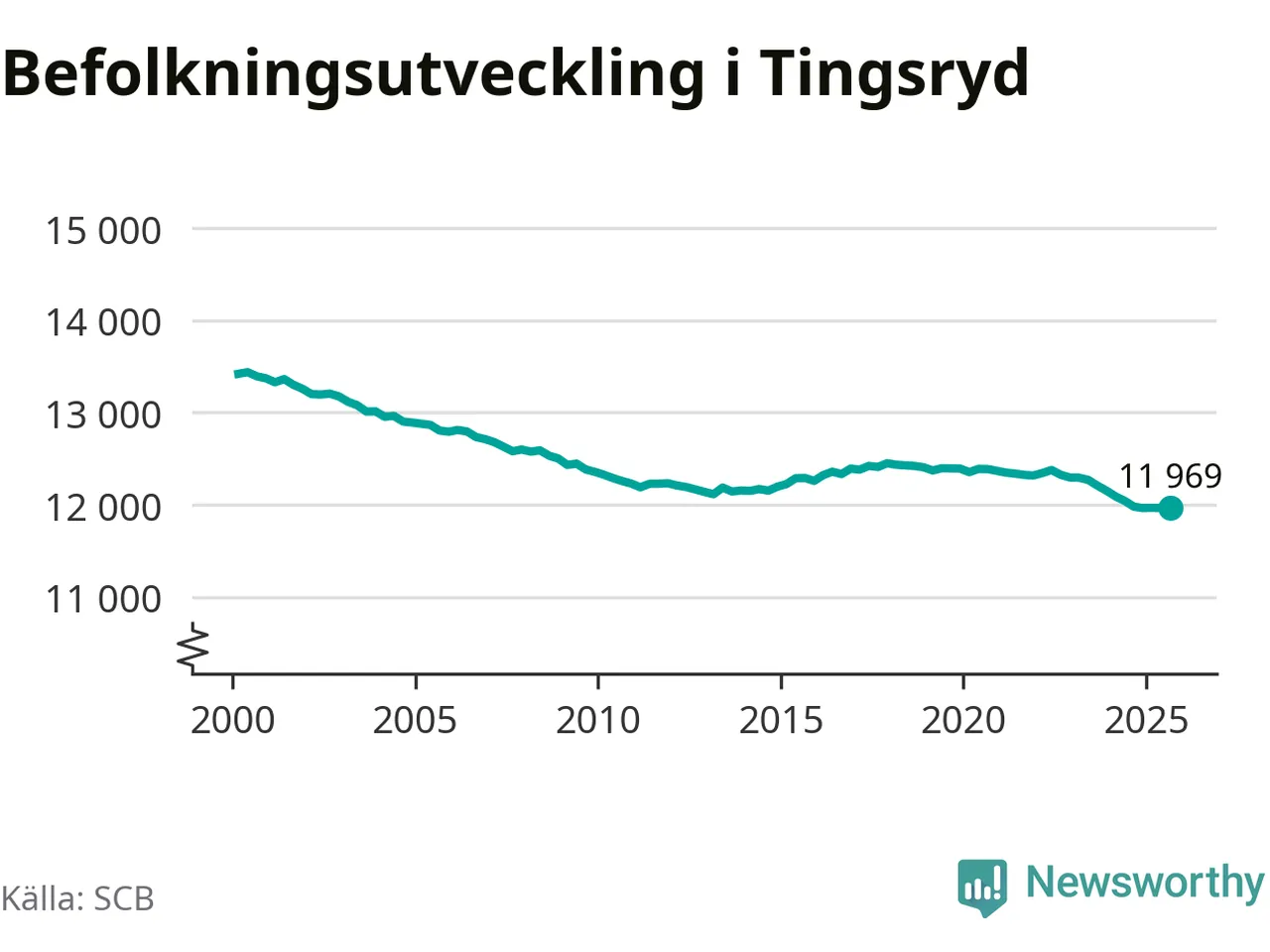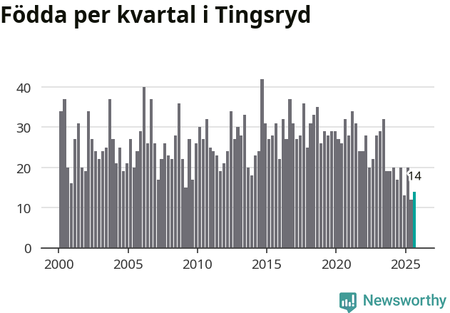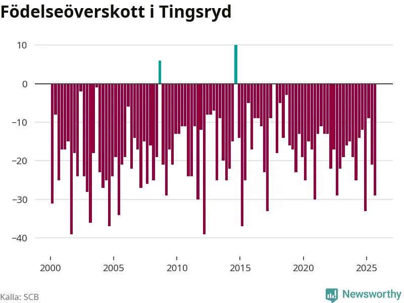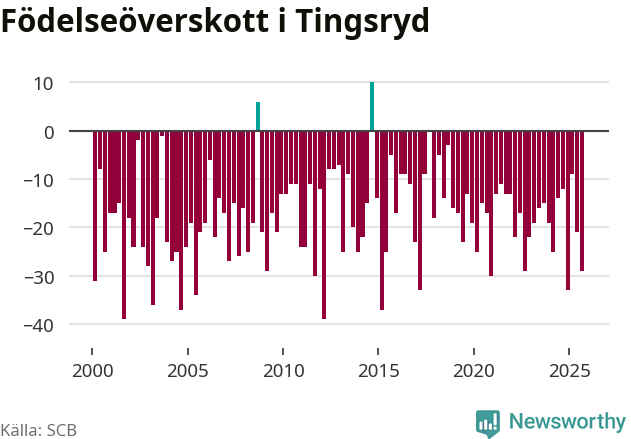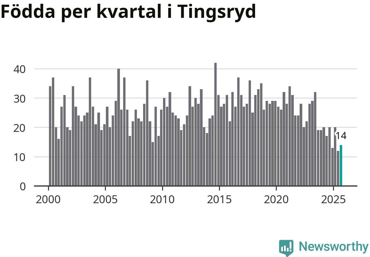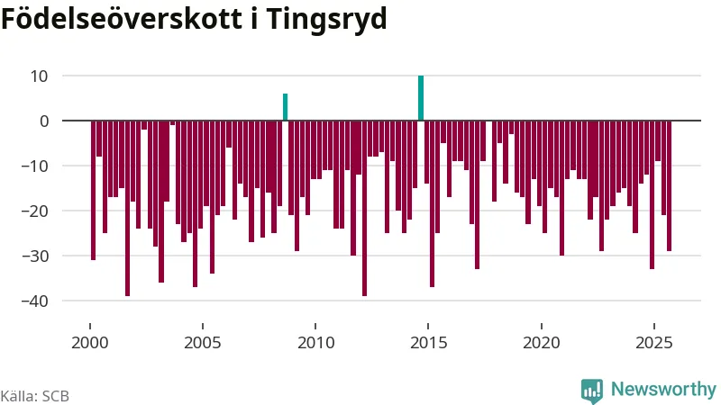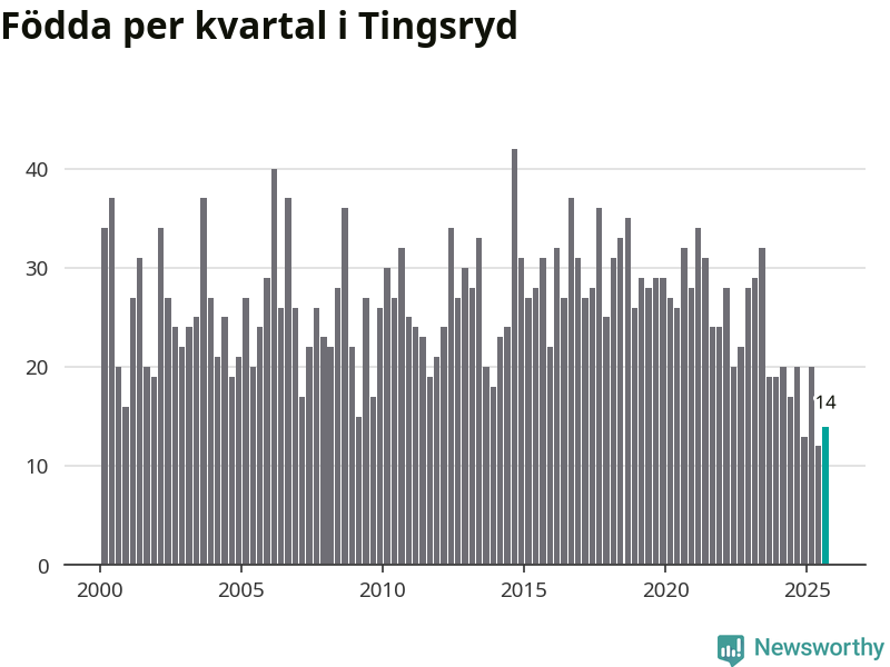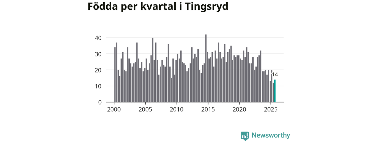 Enligt SCB:s siffror föddes 14 barn i Tingsryd under det senaste kvartalet. Samtidigt avled 43 personer. Tingsryd hade alltså ett negativt födelsenetto, vilket kommunen historiskt sett nästan alltid har haft.