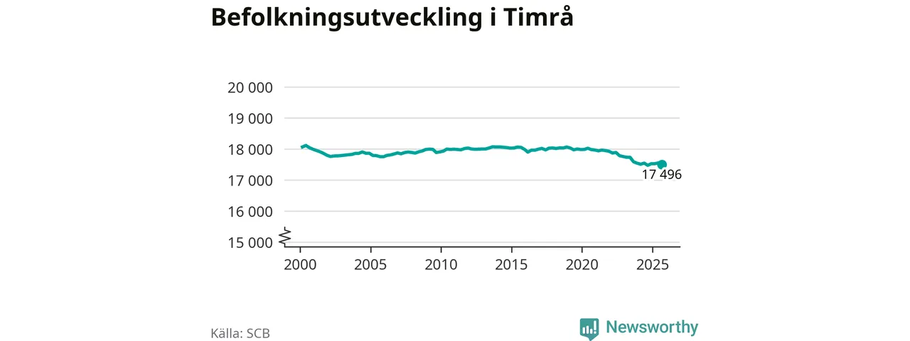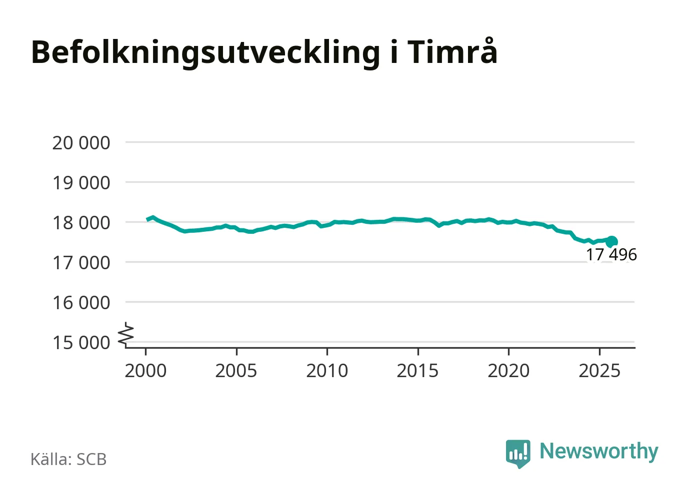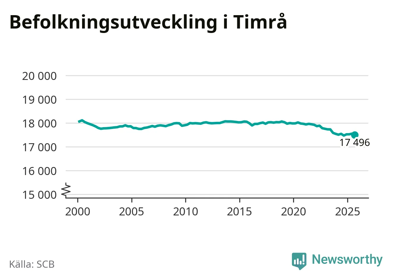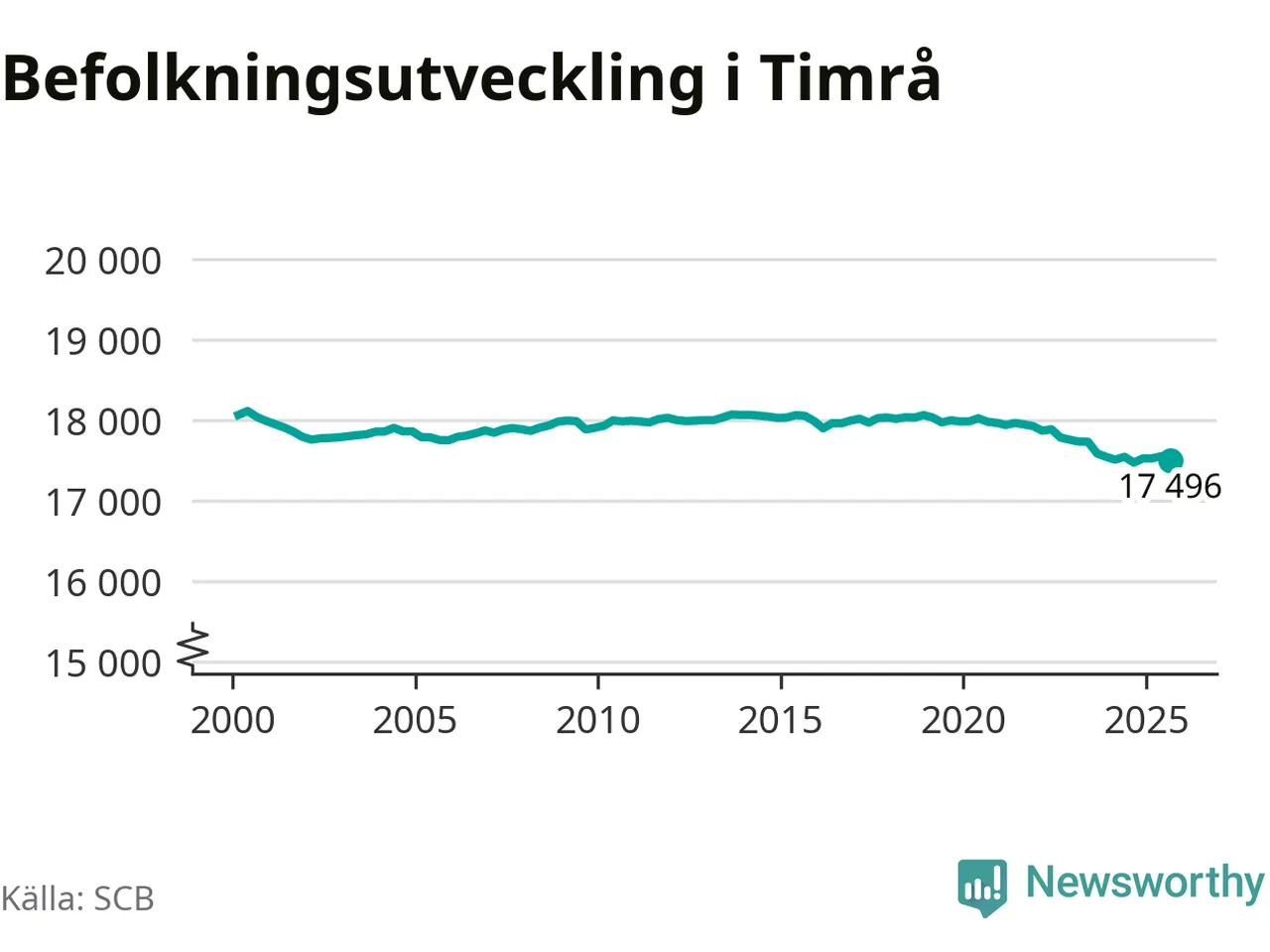 Befolkningen minskade i Timrå kommun under det tredje kvartalet 2025. Den 30 september bodde enligt SCB:s senaste siffror 17 496 personer i kommunen, vilket är 52 färre än i slutet av andra kvartalet.