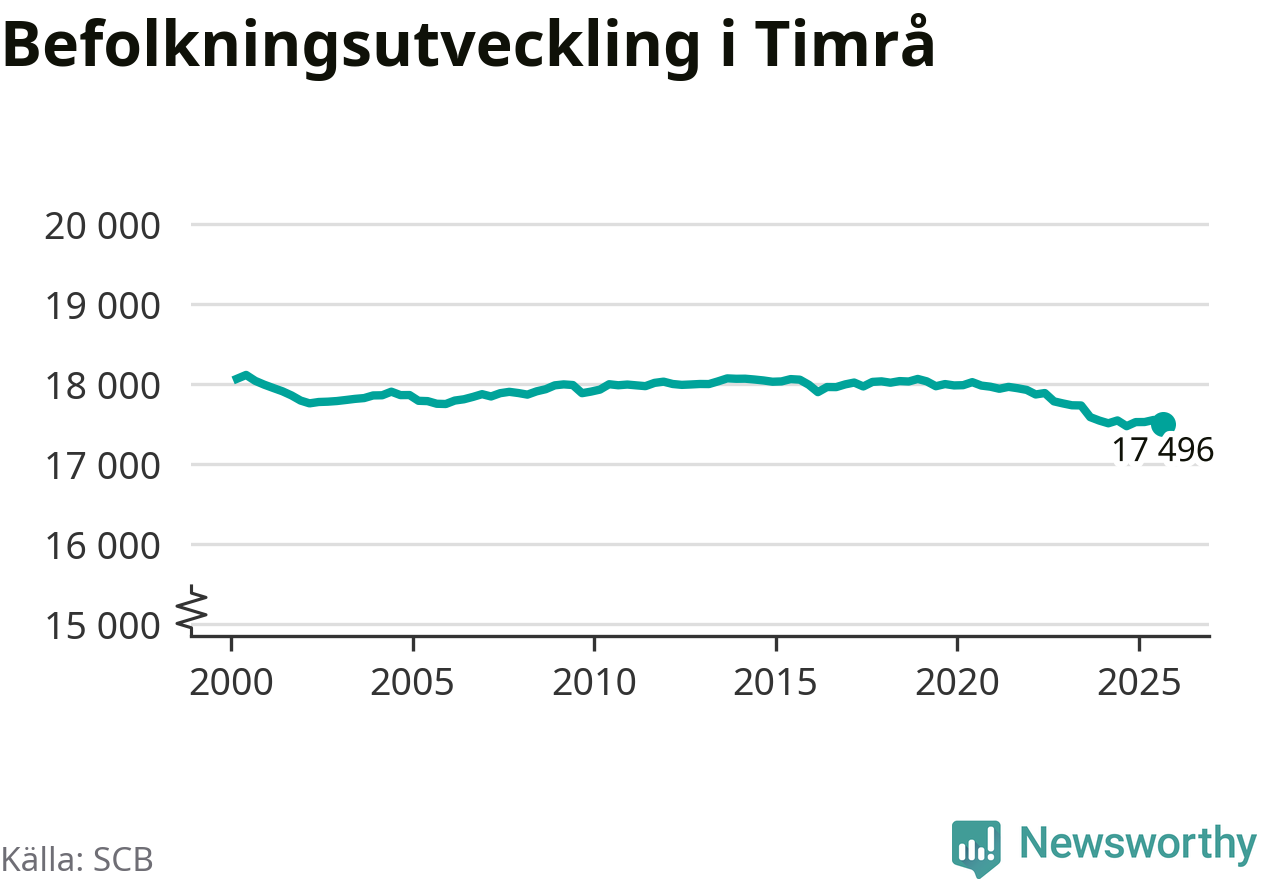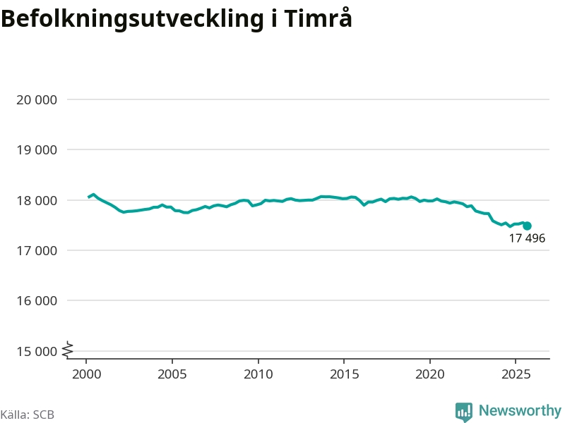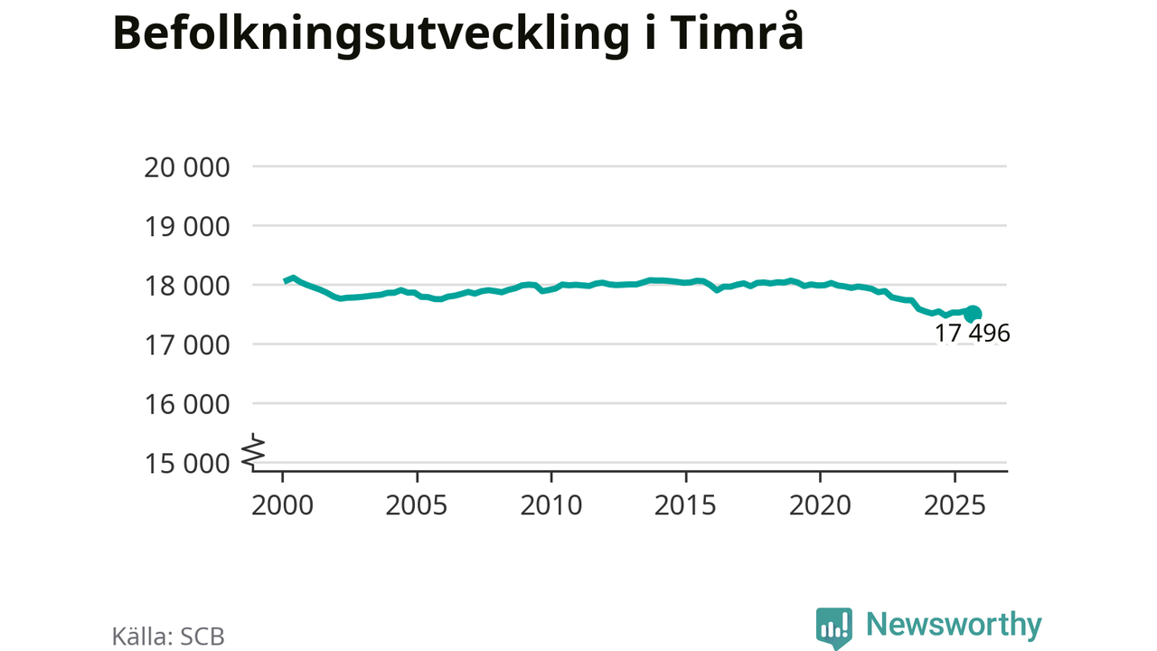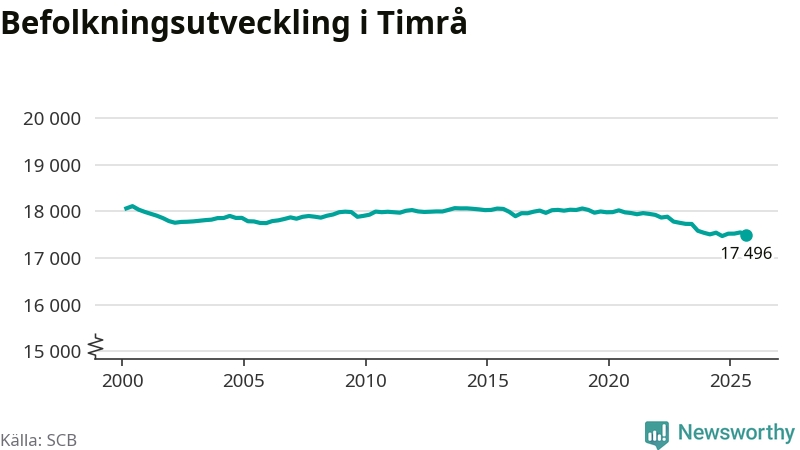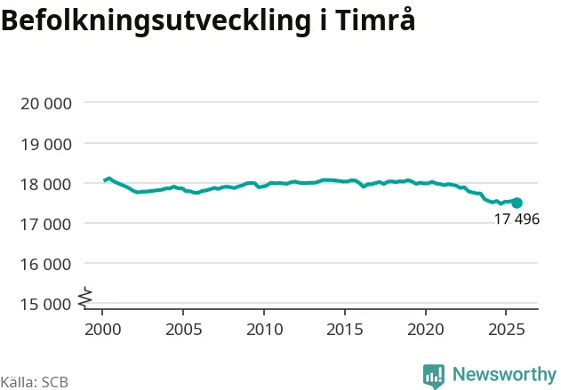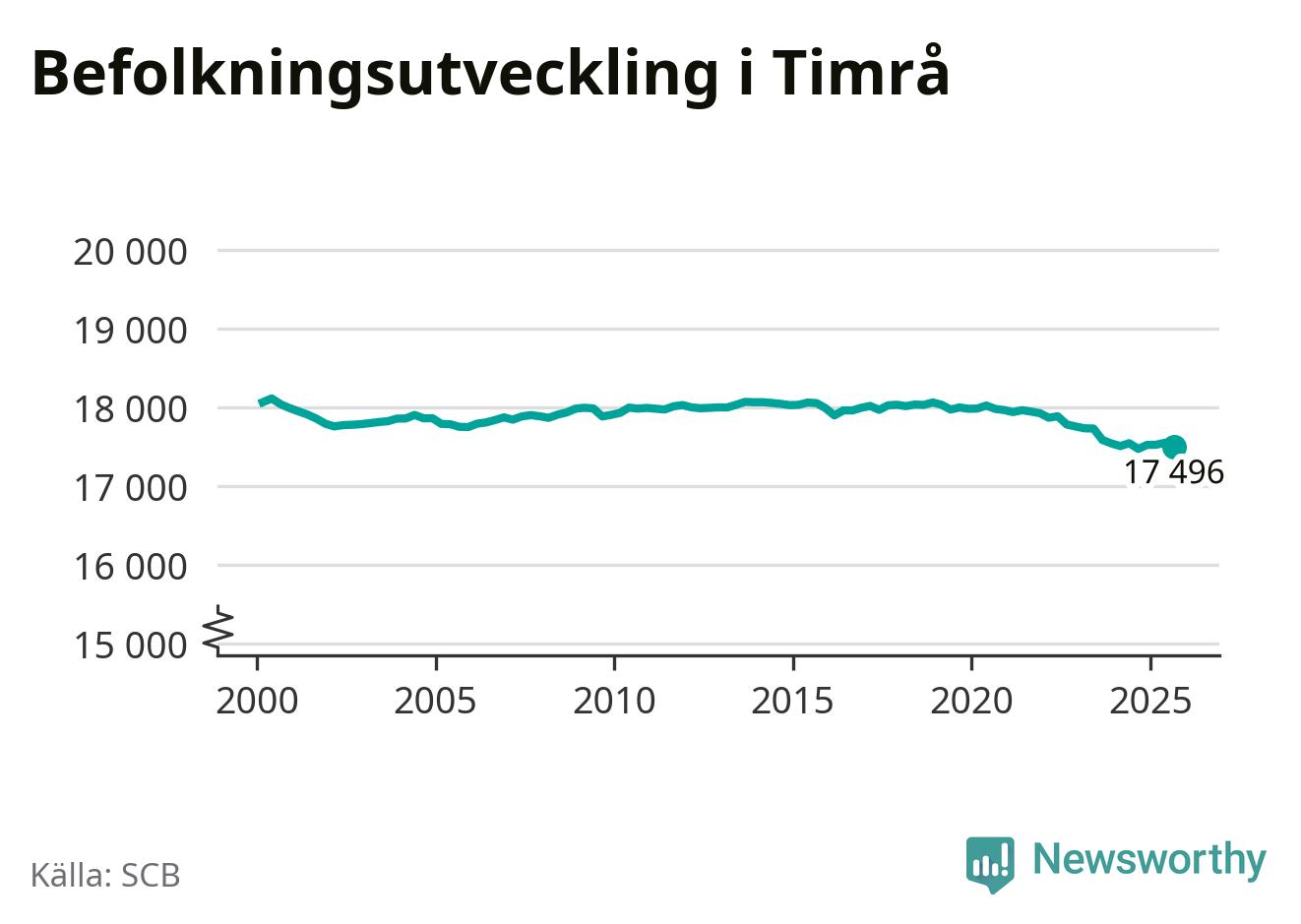 Befolkningen minskade i Timrå kommun under det tredje kvartalet 2025. Den 30 september bodde enligt SCB:s senaste siffror 17 496 personer i kommunen, vilket är 52 färre än i slutet av andra kvartalet.