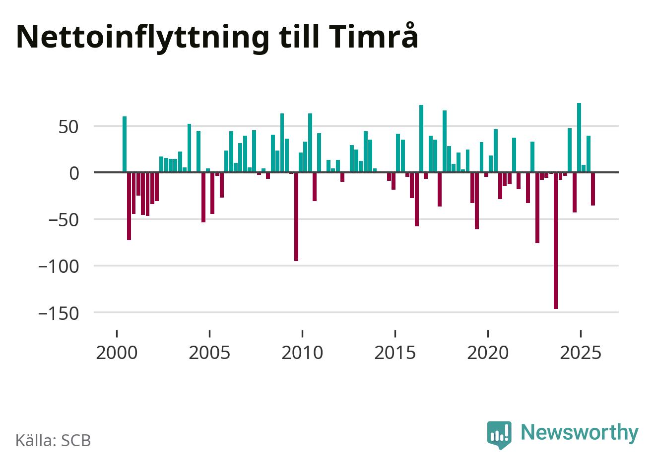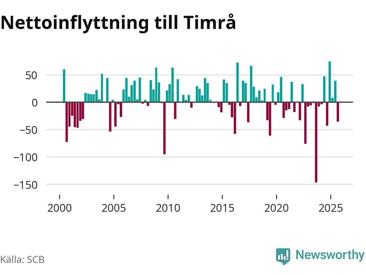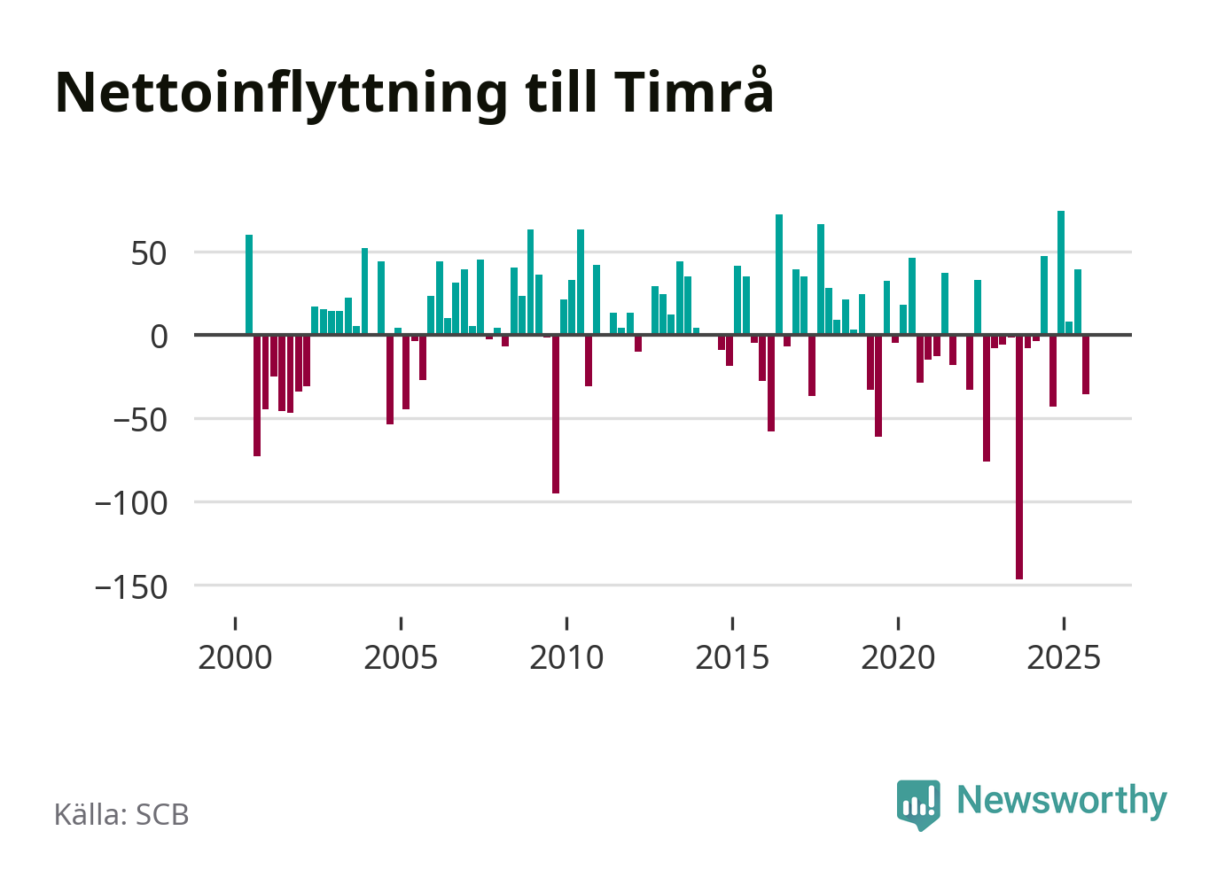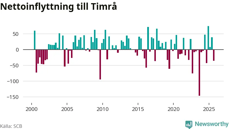 Under tredje kvartalet 2025 flyttade 237 personer till kommunen medan 273 personer flyttade därifrån. Sedan seklets början har Timrå haft ungefär lika många kvartal med positivt flyttnetto som negativt.
