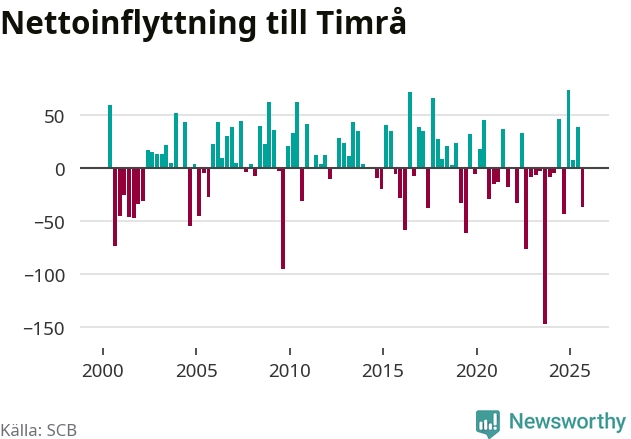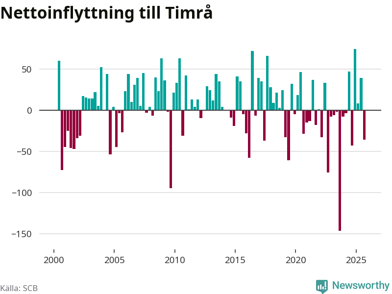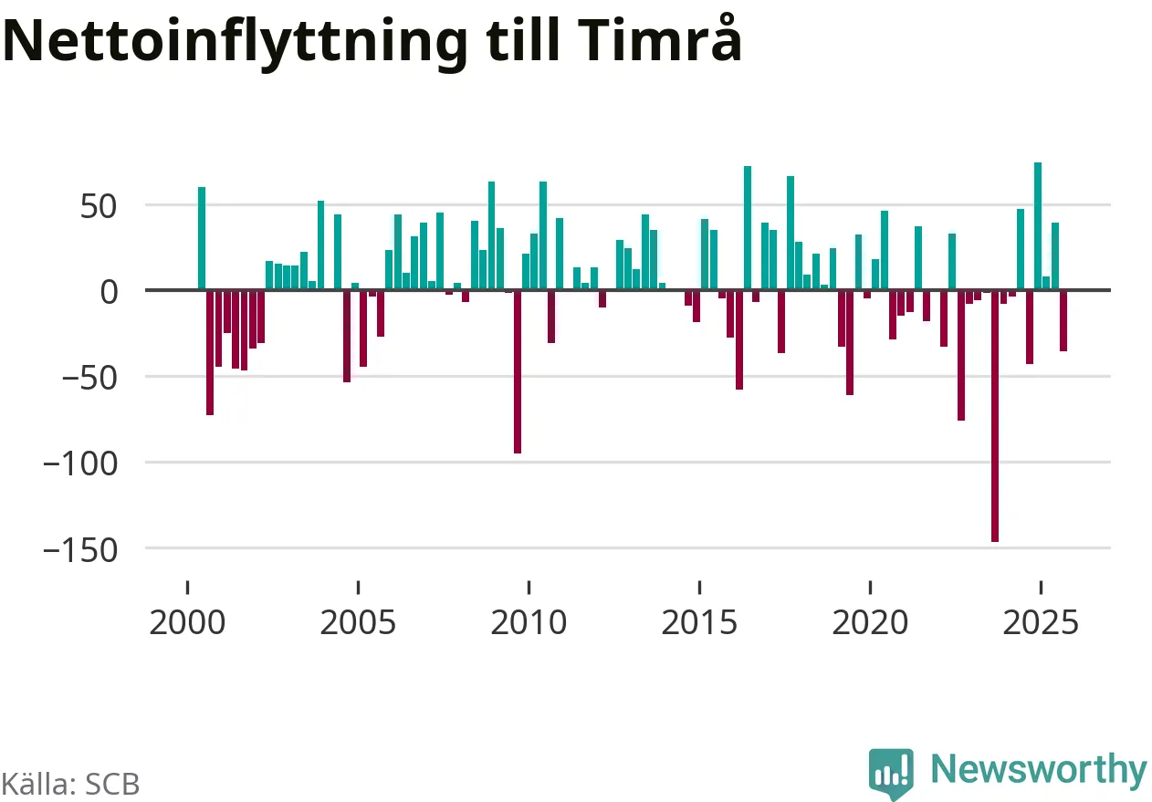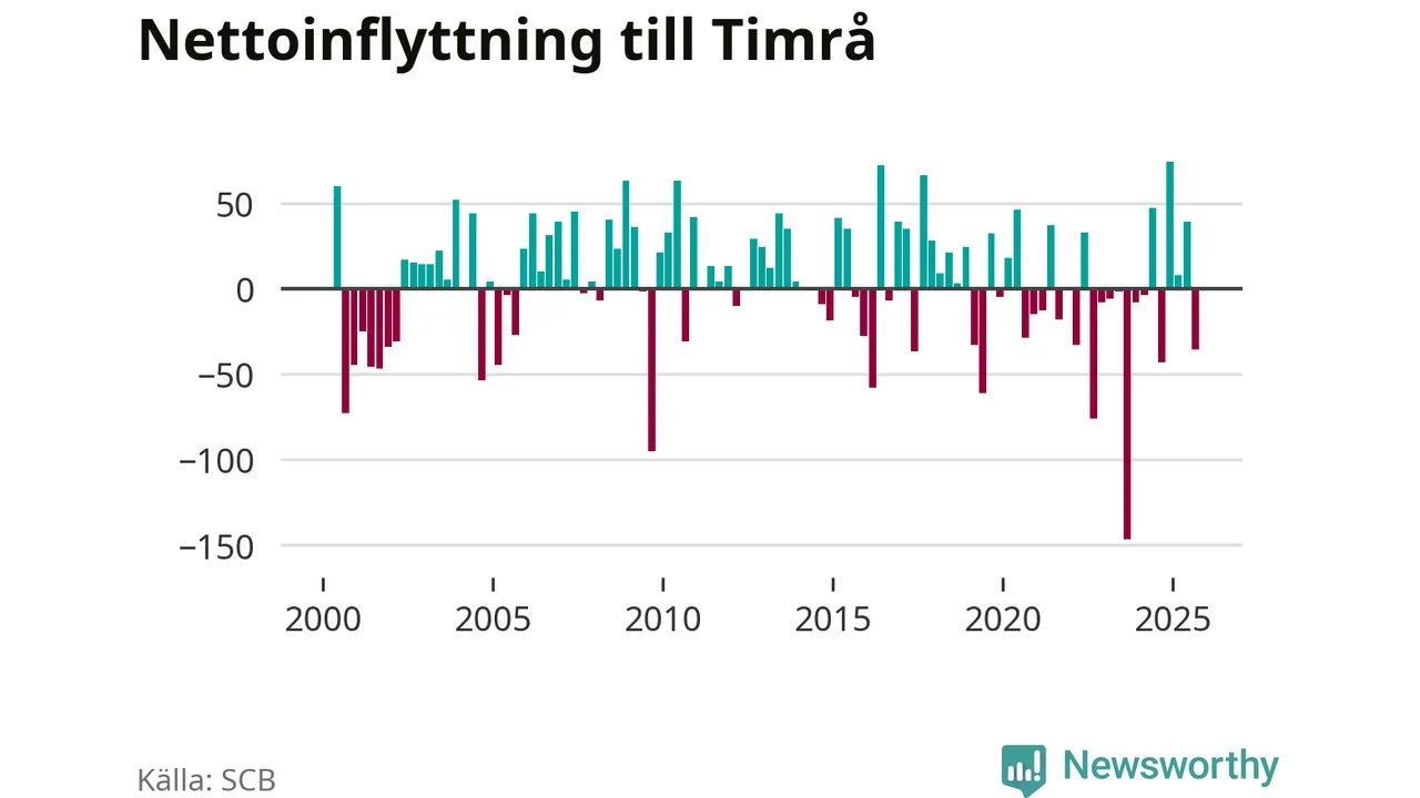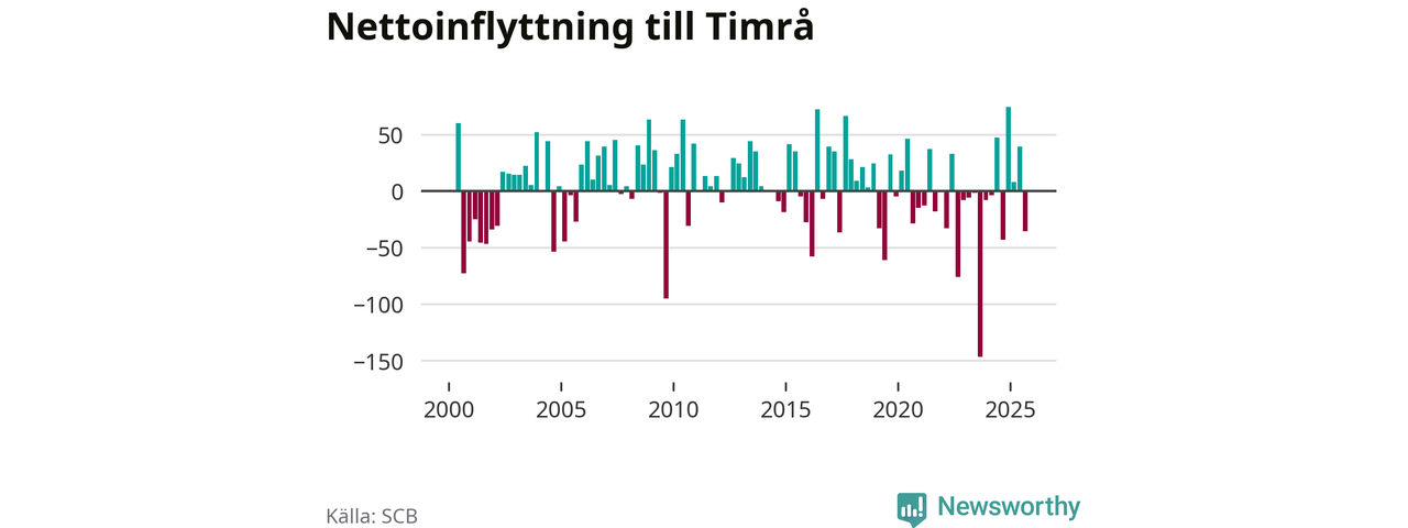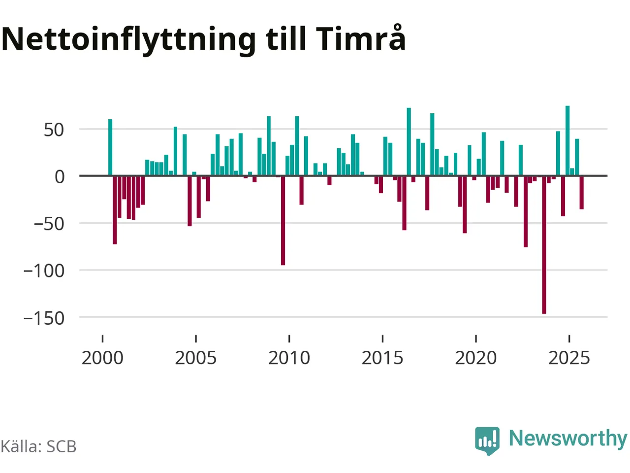 Under tredje kvartalet 2025 flyttade 237 personer till kommunen medan 273 personer flyttade därifrån. Sedan seklets början har Timrå haft ungefär lika många kvartal med positivt flyttnetto som negativt.