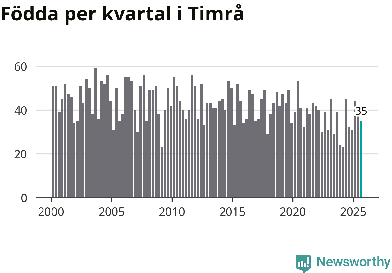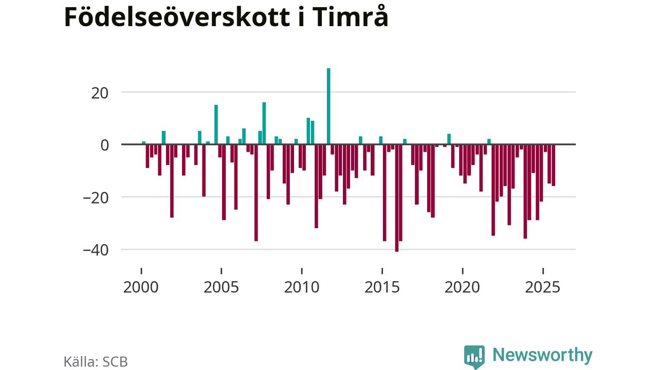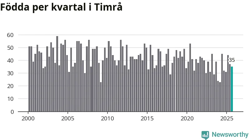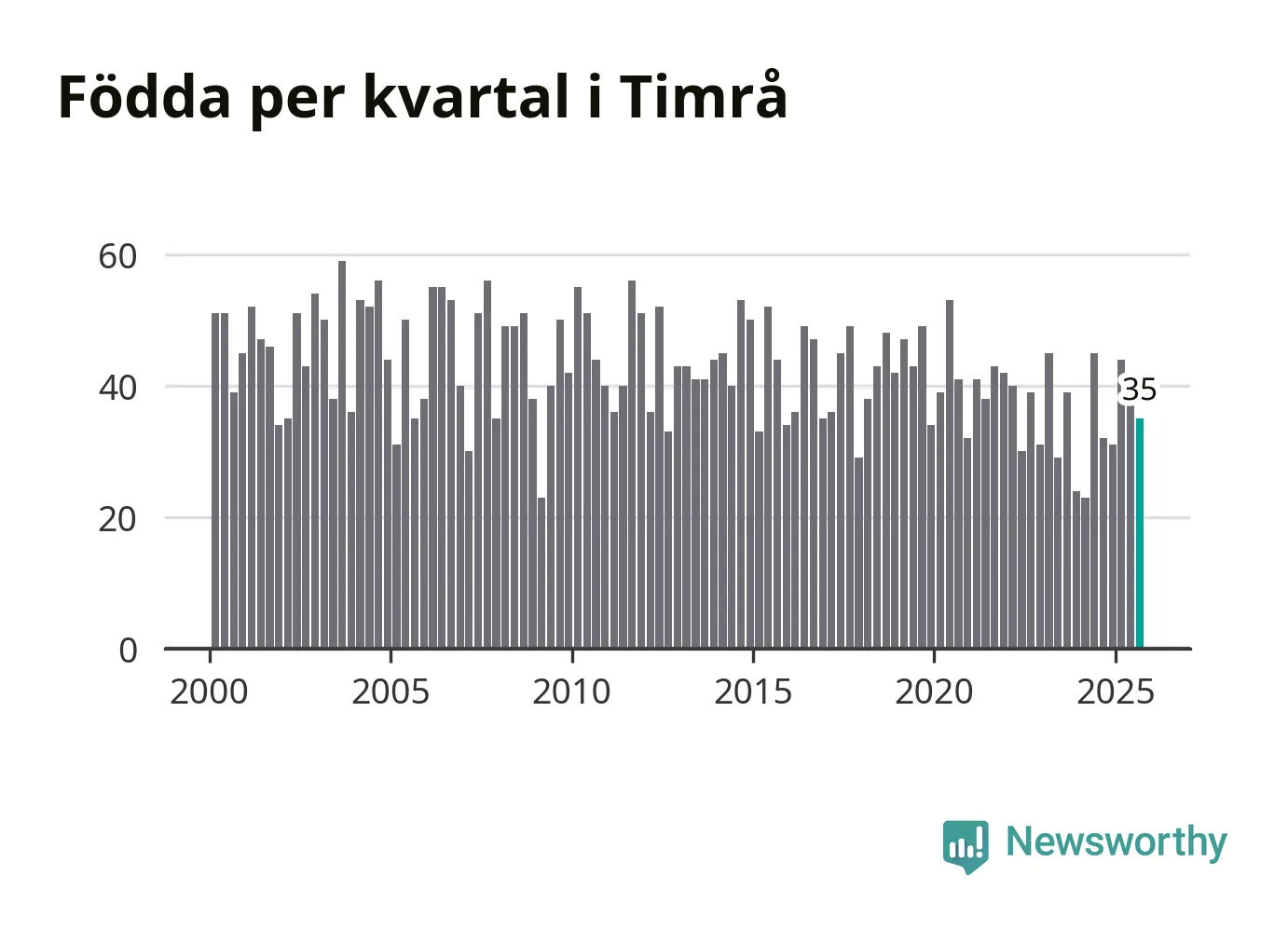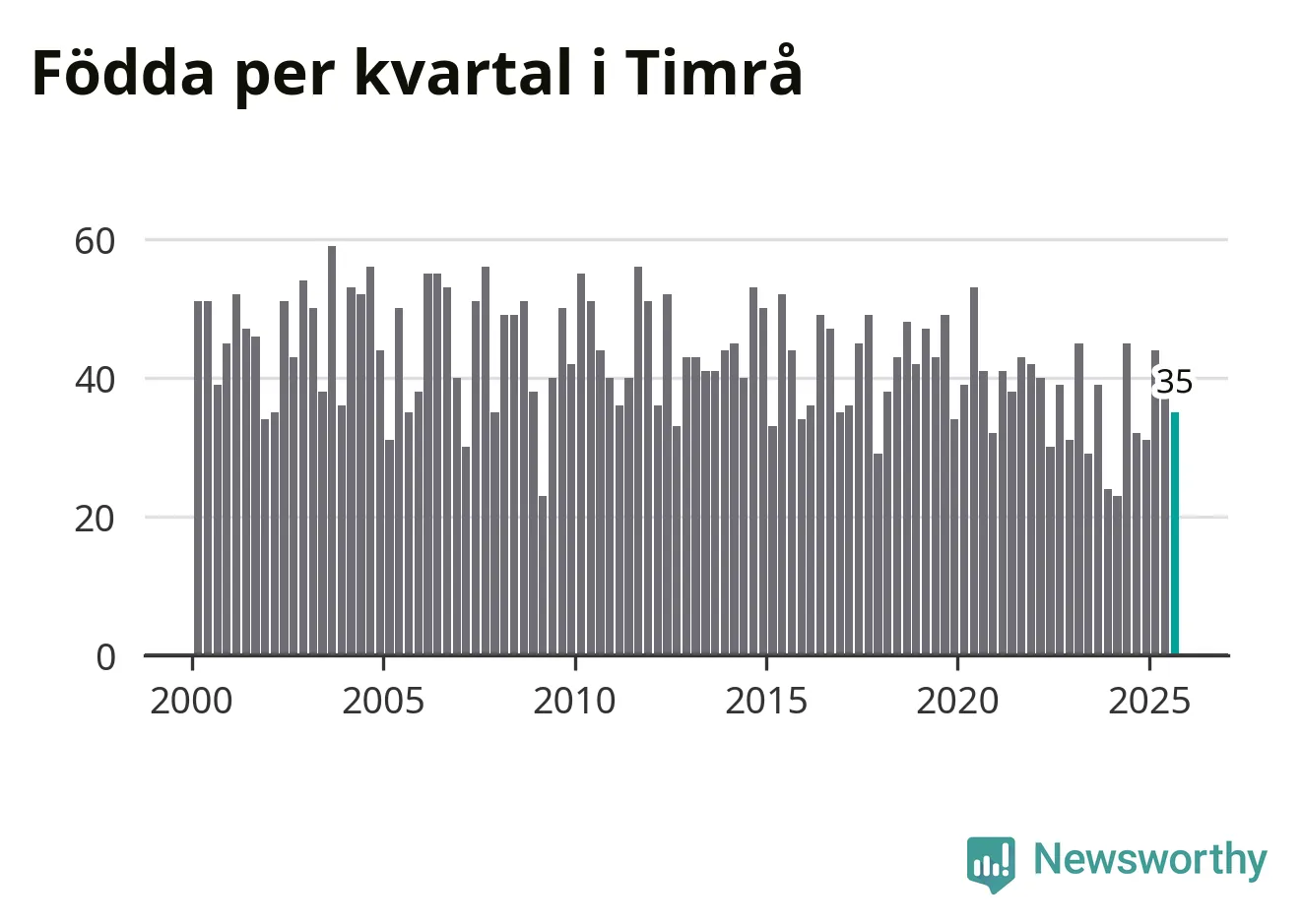 Enligt SCB:s siffror föddes 35 barn i Timrå under det senaste kvartalet. Samtidigt avled 51 personer. Timrå hade alltså ett negativt födelsenetto, vilket kommunen historiskt sett nästan alltid har haft.