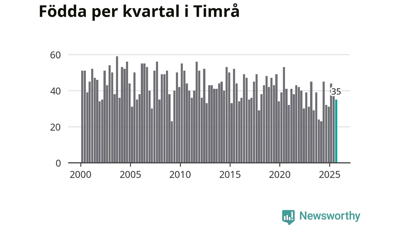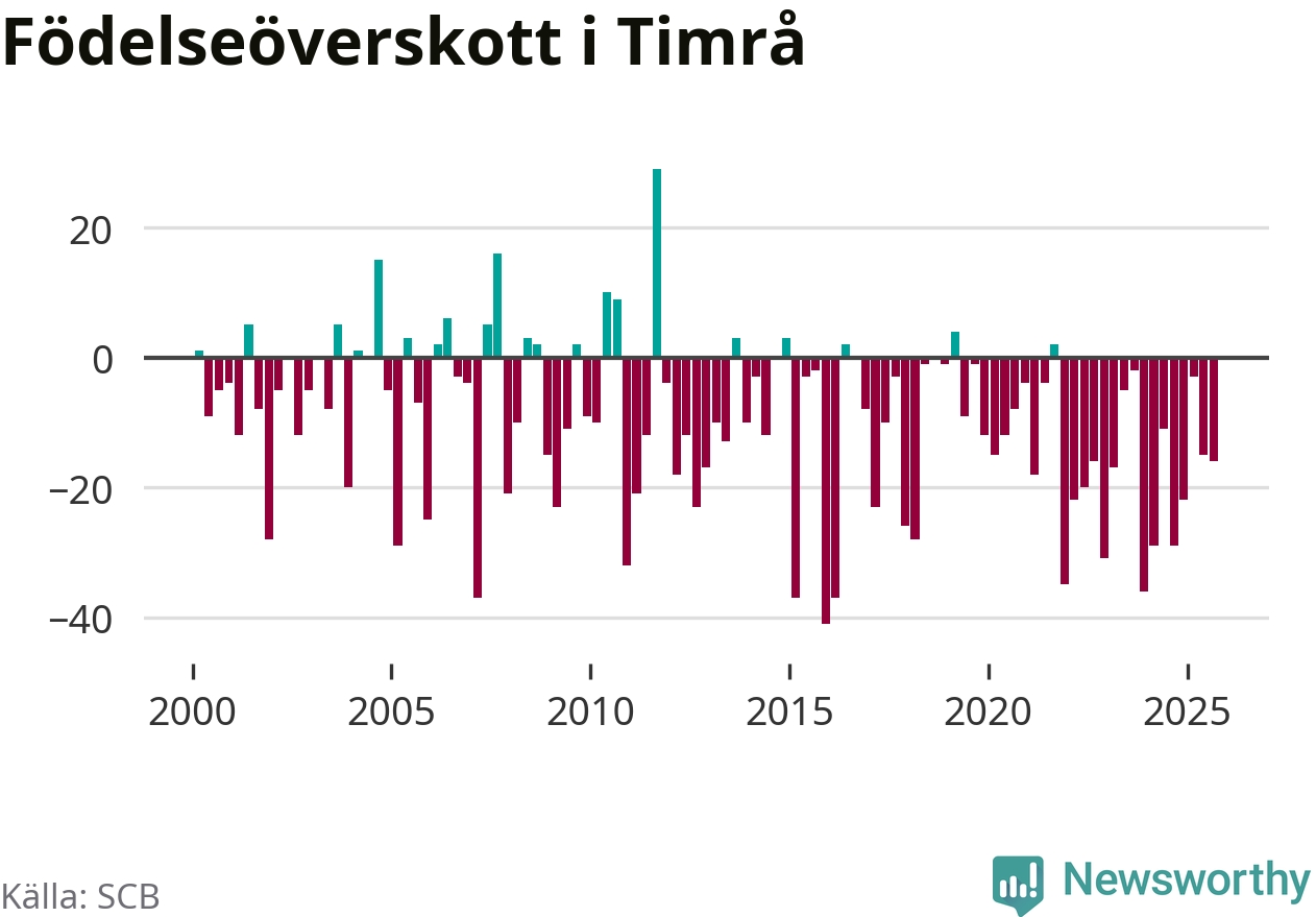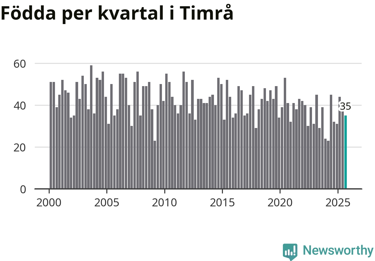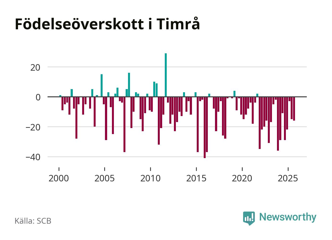 Enligt SCB:s siffror föddes 35 barn i Timrå under det senaste kvartalet. Samtidigt avled 51 personer. Timrå hade alltså ett negativt födelsenetto, vilket kommunen historiskt sett nästan alltid har haft.